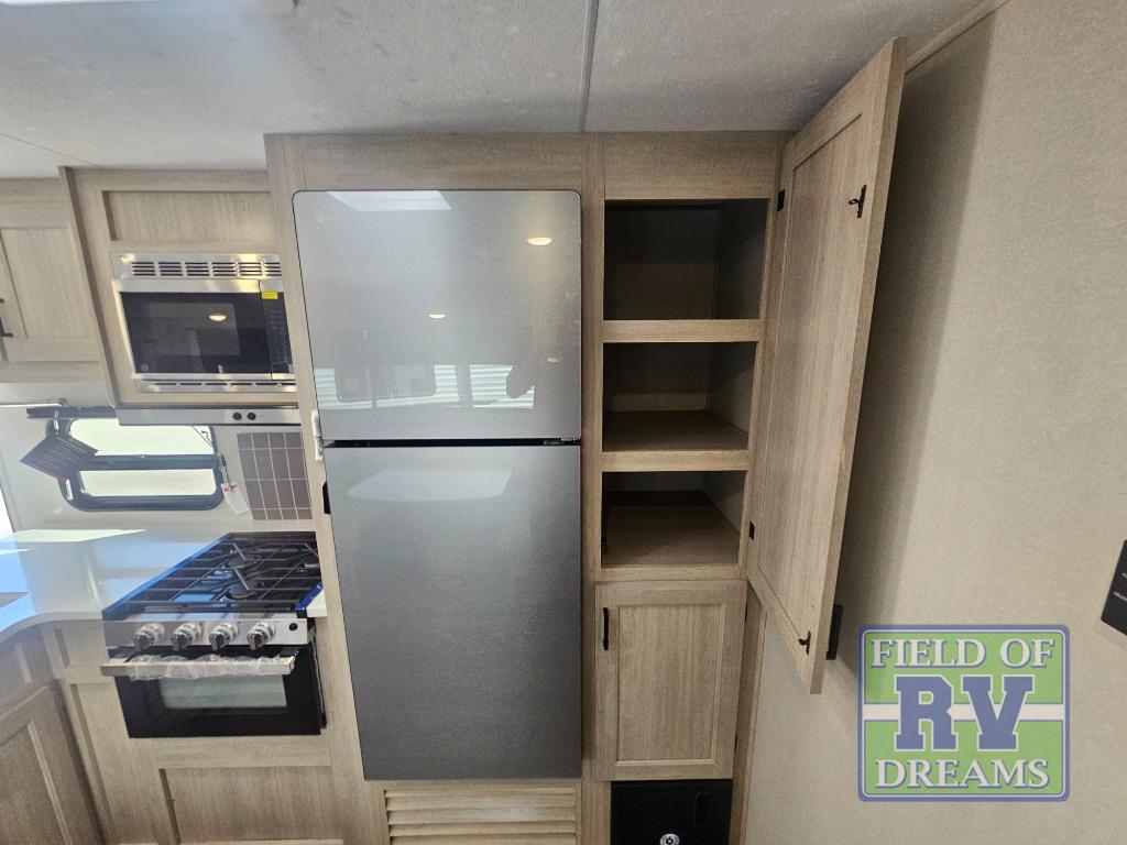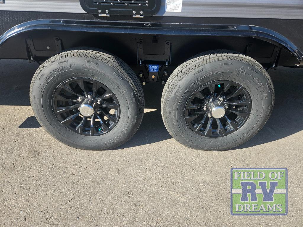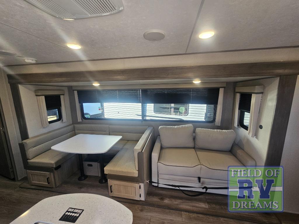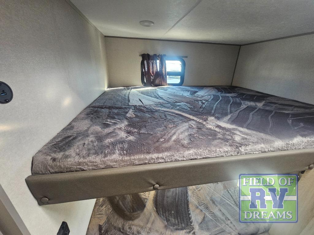 Not only will you be comfortable in this trailer, your friends will have comfort and privacy thanks to having their own bunkhouse with queen-size bunk beds, underbed storage, and a linen closet for clean clothes! The front master bedroom includes a walk-around queen bed, dual wardrobes, plus quick access to the dual entry bath! The combined living and kitchen is spacious thanks to the slide out U-shaped dinette and sofa with drink holders. You can even add the fireplace option if you want that feature. The cook will have full amenities to whip up meals including overhead cabinets for dishes and snacks, plus an outdoor camper kitchen with a pull-out griddle, a cabinet, and a refrigerator!