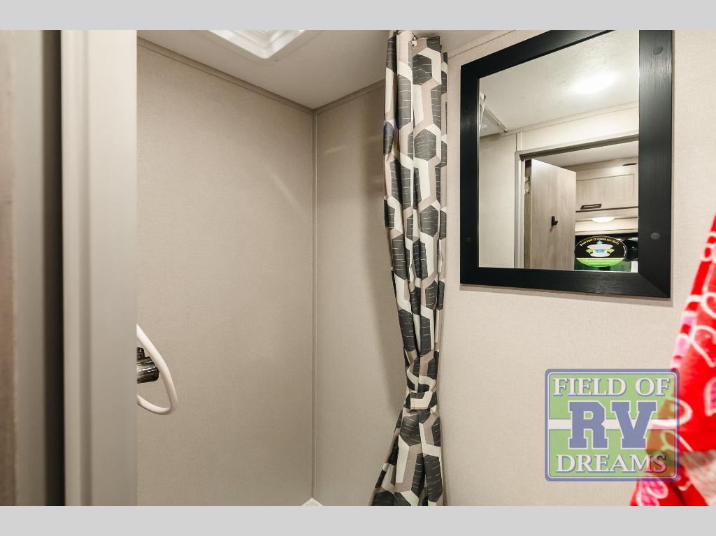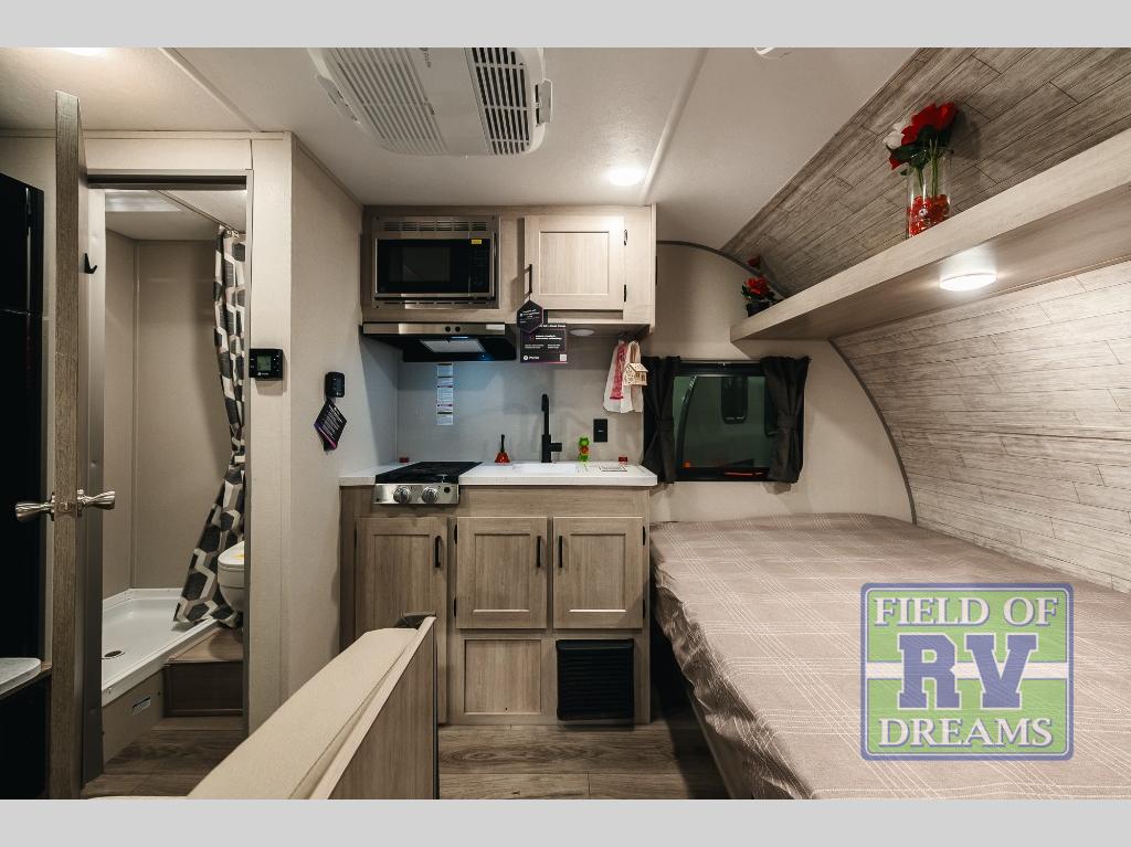 Lightweight camping is easier than you think with this travel trailer in tow! The front 54" x 74" bed will provide a great night's rest each night, while your overnight guest takes the booth dinette. There is a handy shelf above the front bed for your belongings plus additional bedroom storage. A private bath includes a 24" x 32" shower and a toilet with a mirror behind it so you can freshen up each day. You'll also find a two burner cooktop and microwave oven to make meals each day plus a 3.3 cu. ft. 12V refrigerator for food storage!