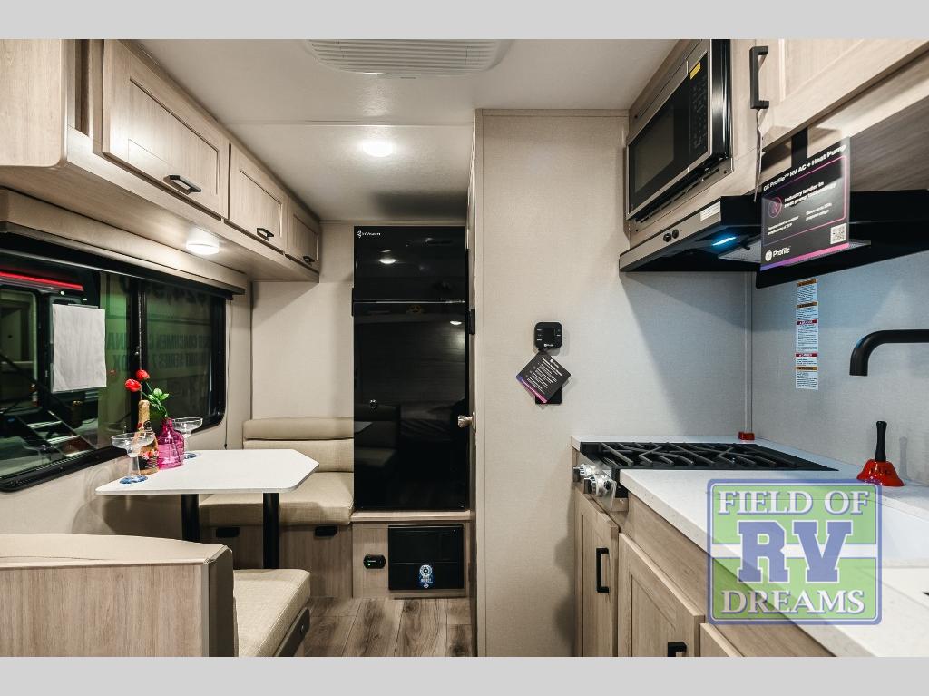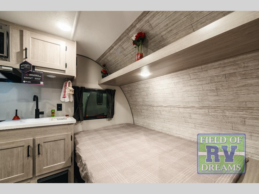 Lightweight camping is easier than you think with this travel trailer in tow! The front 54" x 74" bed will provide a great night's rest each night, while your overnight guest takes the booth dinette. There is a handy shelf above the front bed for your belongings plus additional bedroom storage. A private bath includes a 24" x 32" shower and a toilet with a mirror behind it so you can freshen up each day. You'll also find a two burner cooktop and microwave oven to make meals each day plus a 3.3 cu. ft. 12V refrigerator for food storage!
