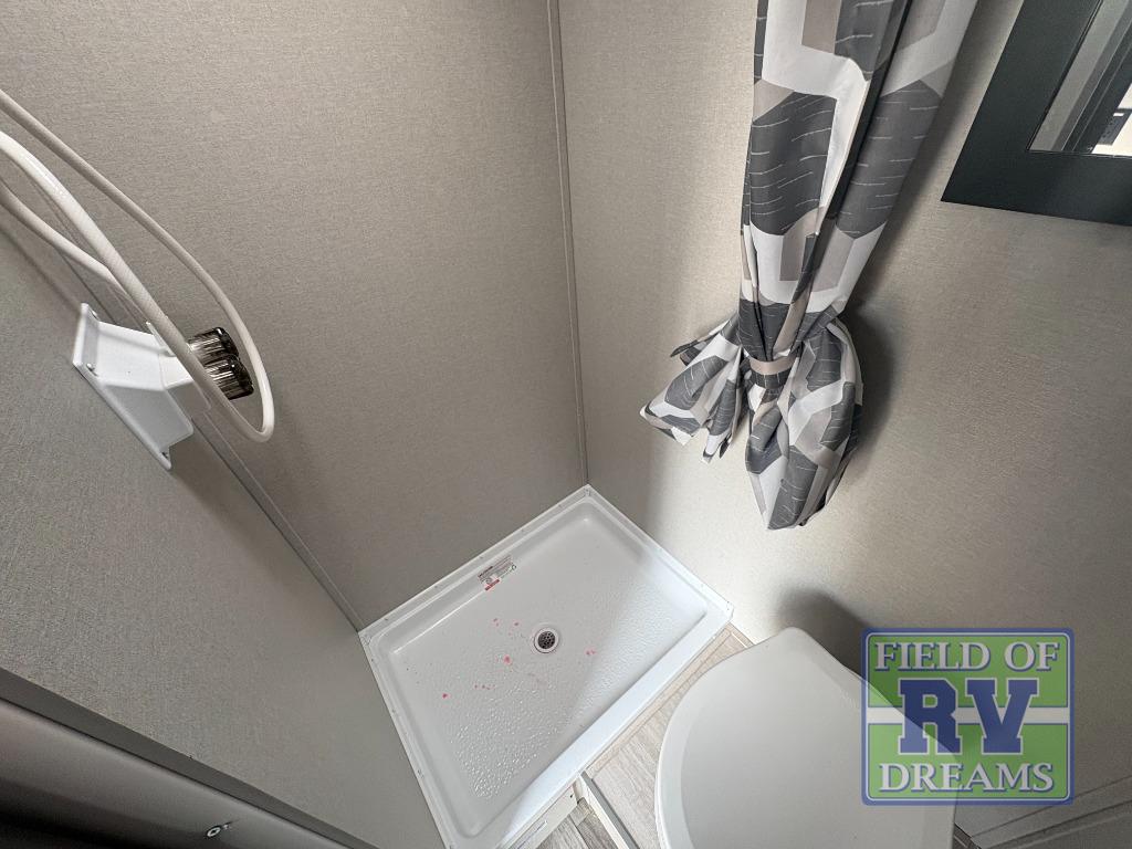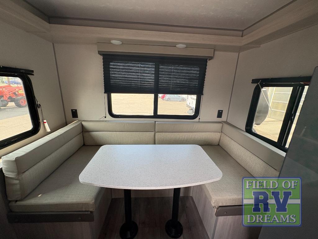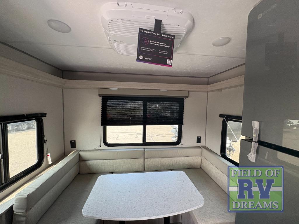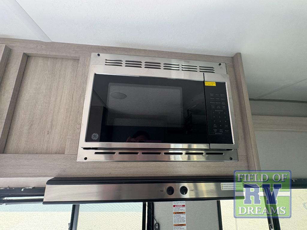 The perfect unit for a cozy weekend retreat for two or three! There is a queen bed up front with overhead storage and more at the foot of the bed to keep your things tidy. The rear of the unit offers a U-shaped dinette with an end table on one end and a handy overhead shelf which is a great spot for meals, watching TV or playing cards and games. A mid-coach bath includes a 36" x 30" shower and toilet with foot flush, plus a storage shelf for necessities. This model also includes a GE two burner cooktop, a GE stainless microwave oven, plus a 3.3 cu. ft. 12V refrigerator to keep food fresh!