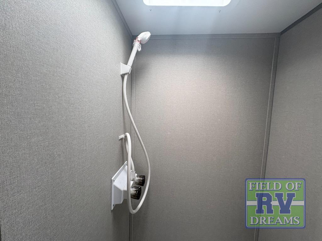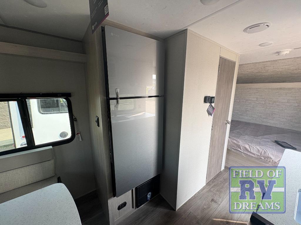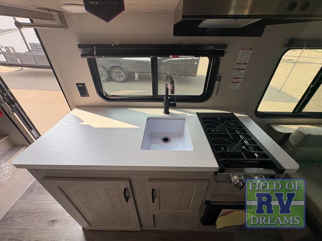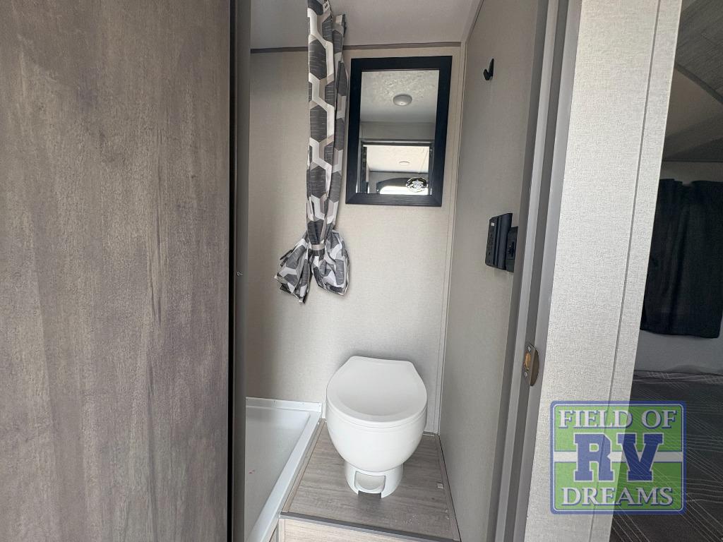 The perfect unit for a cozy weekend retreat for two or three! There is a queen bed up front with overhead storage and more at the foot of the bed to keep your things tidy. The rear of the unit offers a U-shaped dinette with an end table on one end and a handy overhead shelf which is a great spot for meals, watching TV or playing cards and games. A mid-coach bath includes a 36" x 30" shower and toilet with foot flush, plus a storage shelf for necessities. This model also includes a GE two burner cooktop, a GE stainless microwave oven, plus a 3.3 cu. ft. 12V refrigerator to keep food fresh!