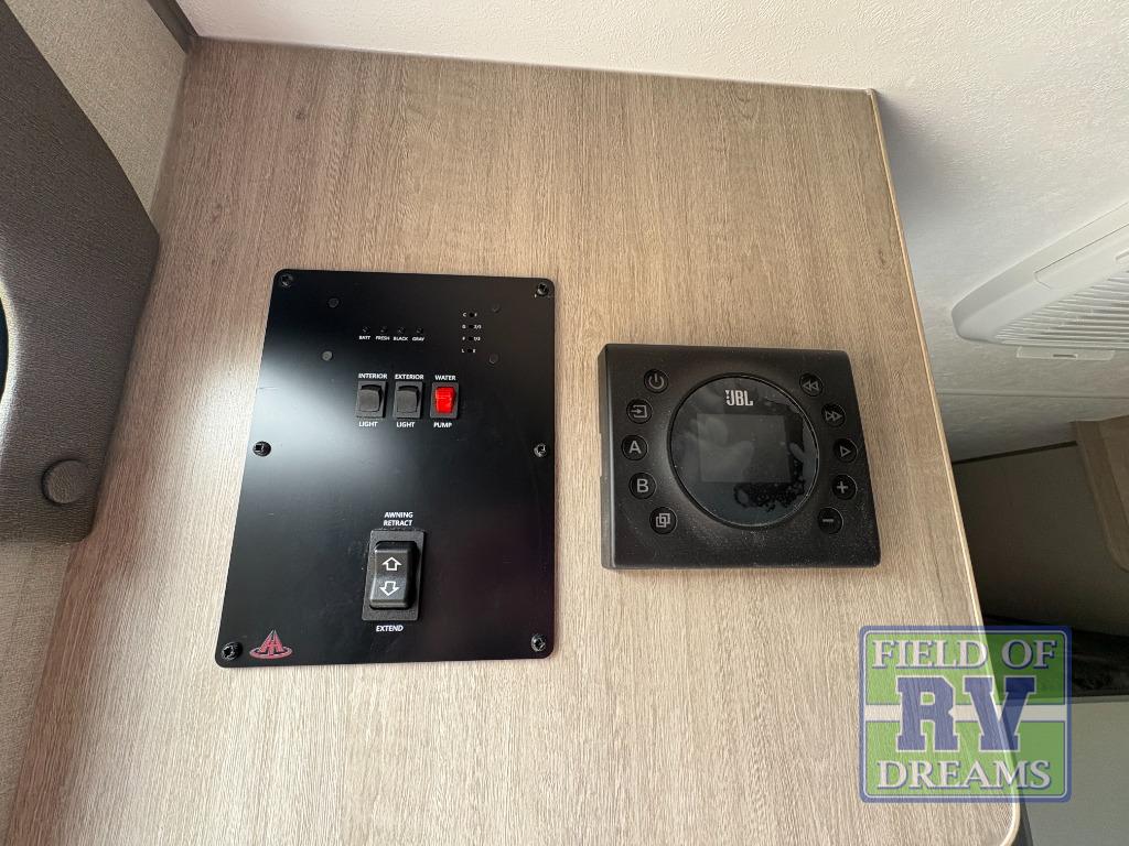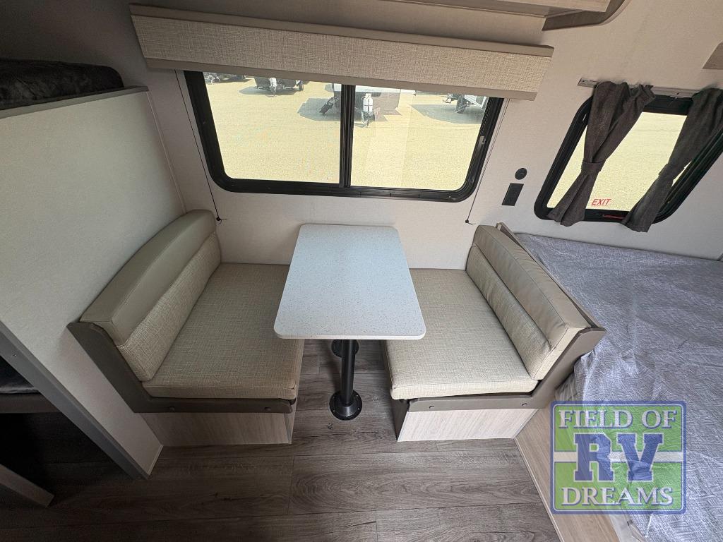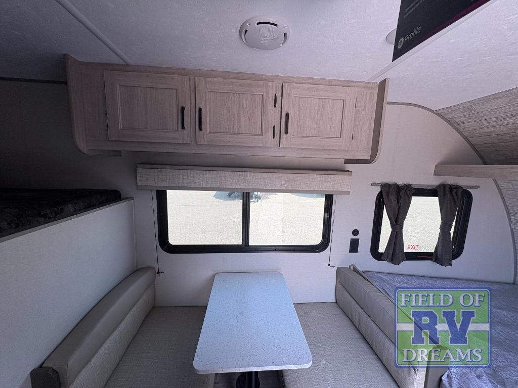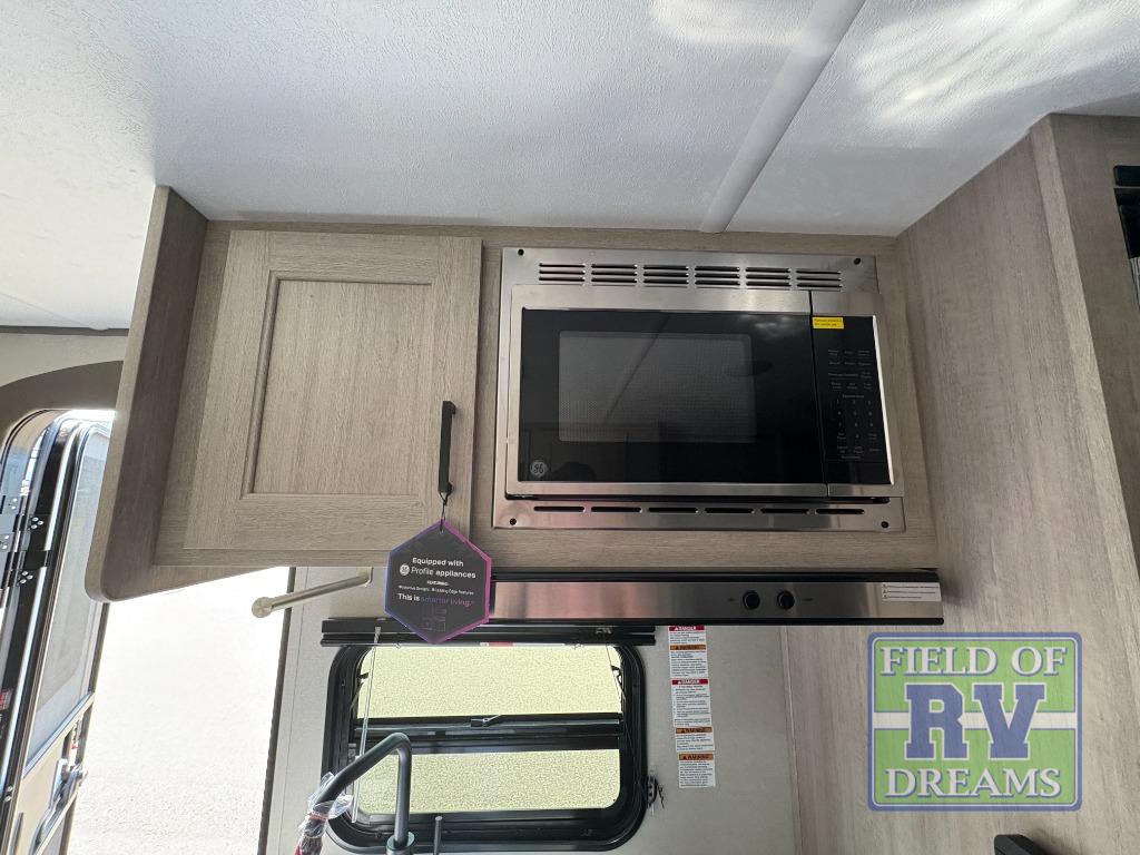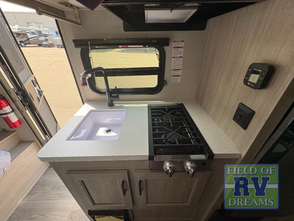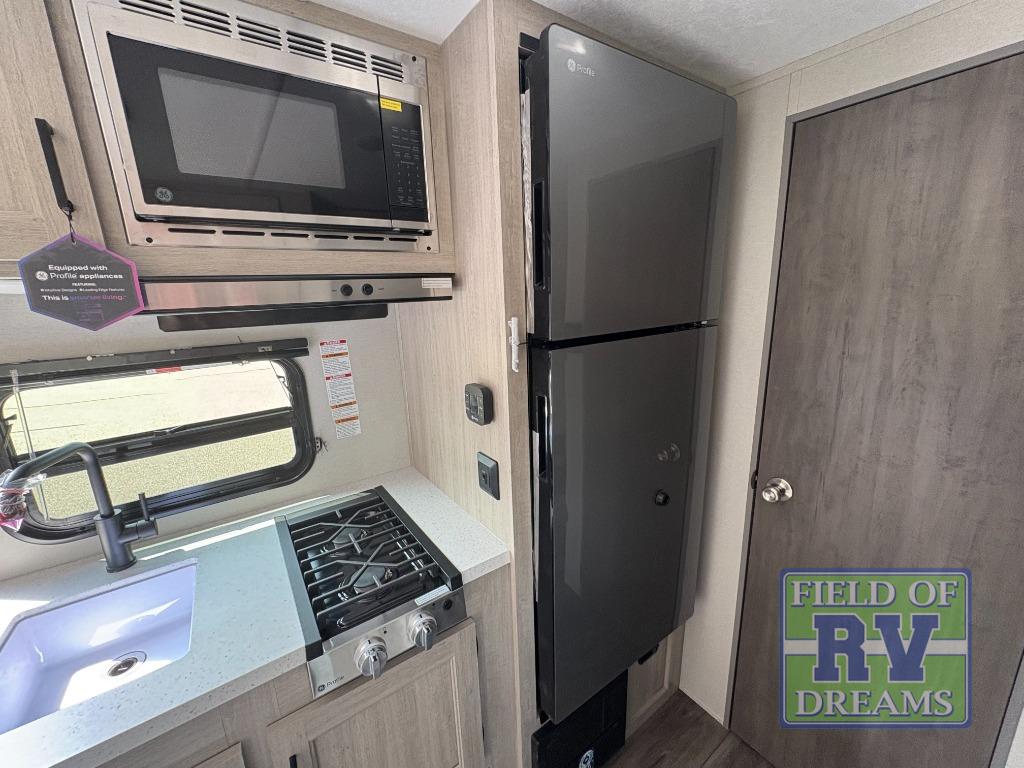 This travel trailers is perfect for a young family or smaller group. You can easily sleep four or more with the rear set of bunk beds and queen bed up front. There is also a 60" sofa for inside down-time, as well as complete kitchen and bath amenities so you can cook and stay clean while traveling. The rear corner bath features a toilet and 36" x 30" shower, and it's conveniently located next to the bunk beds which is great for little ones at night. Cooking inside will be easy with a GE stainless two-burner cooktop and single sink, plus there is also a GE microwave oven for snacks and things that you can easily warm up. If you plan to spend most of your time outdoors, you will find plenty of storage space in the front exterior storage compartment, and there is also plenty of storage inside as well.