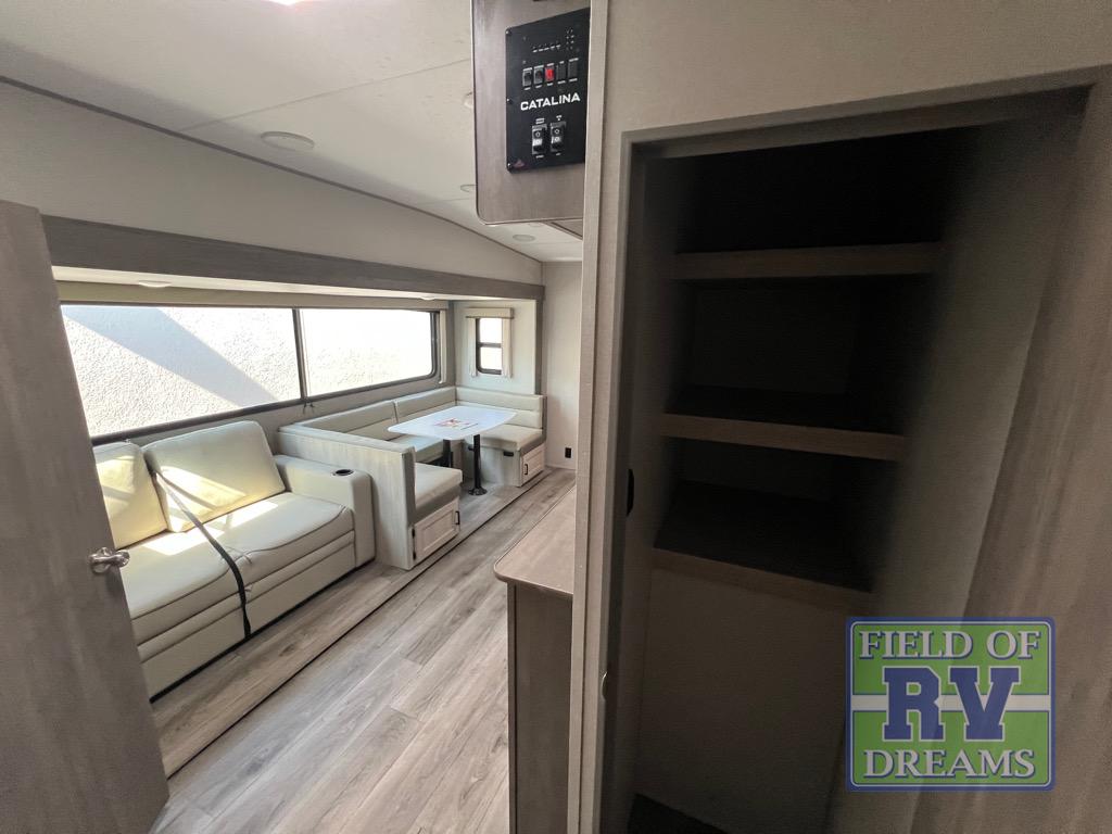 The best looking, most affordable toy hauler is found in the Catalina Trailer Blazer by Coachmen. Each one is constructed with a seamless alpha roof membrane, an enclosed and fully sealed underbelly, and a cambered structural steel I-beam frame for added support. There is a rear loading cargo door with a 3,000 lb. capacity, a black out screen wall with a zip walk-thru and windows, plus 500 lb. tie-downs to secure your toys. You'll love the interior with its Congoleum woodplank linoleum flooring and LED interior lighting. Head outside to find an electric awning with multicolored LED lights and a remote, a 15' Toy Loc cable, a "Leash Link" quick hookup D-ring for pets, and upgraded aluminum wheels. The Catalina Trail Blazer also comes with RV-LINK 4G LTE connectivity with a WiFi booster and extender, a JBL Aura Cube media center, plus premium JBL interior speakers for your pleasure!