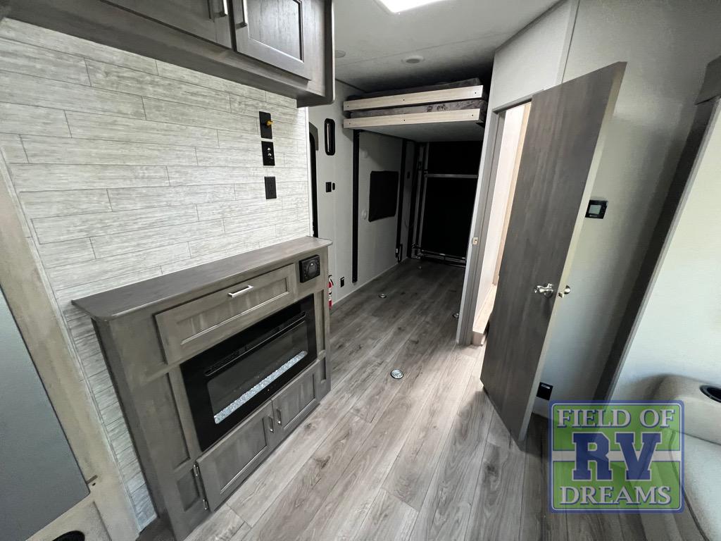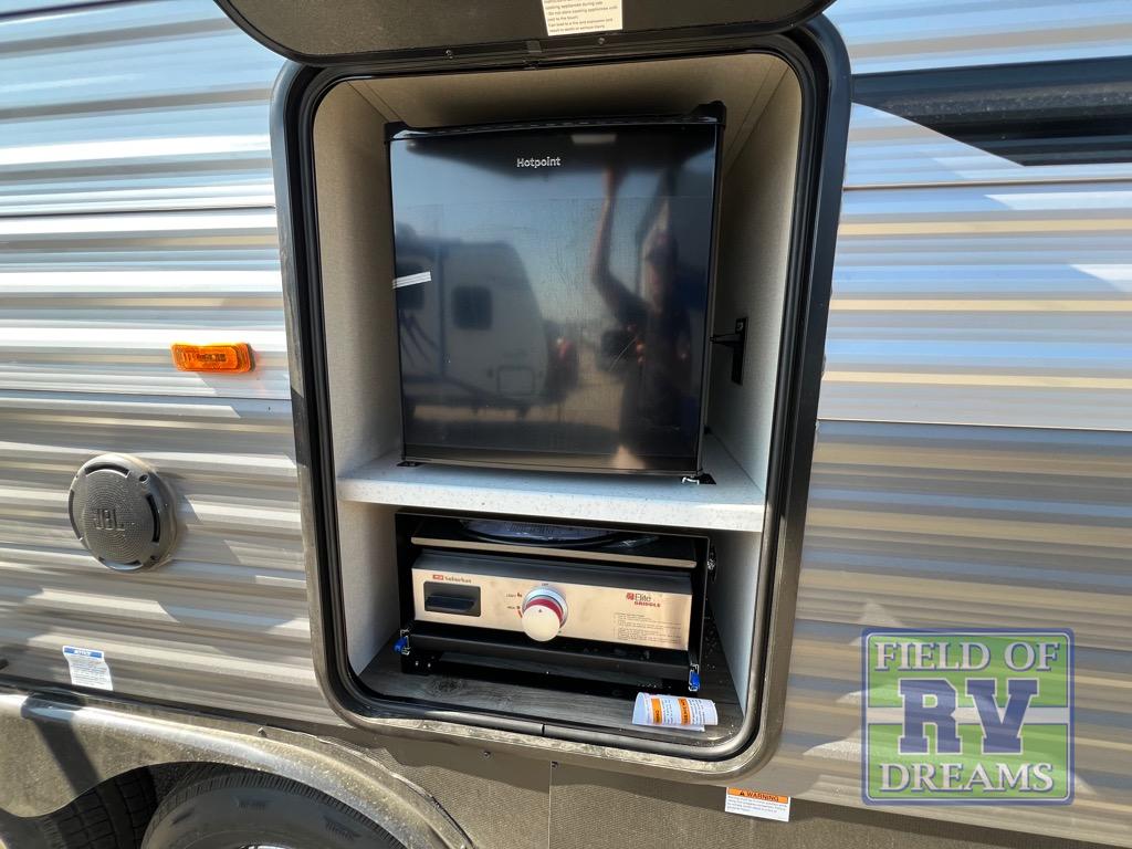 This toy hauler has lots of room for toys and guests! You will love the retreat of the front private bedroom with a queen bed, dual wardrobes and its own entry door. Additional guests can sleep in the double-size bunks with an electric trac bed lift in the cargo area, also with its own entry door. A rear corner bath makes efficient use of space and includes a 24" x 32" shower and a medicine cabinet. The main living area features an entertainment center that can be upgraded with an optional fireplace for maximum coziness. Relax on the sofa or the U-shaped dinette. You'll also appreciate the kitchen with its L-shaped counter, corner sink, microwave, GE stainless 10.7 cu. ft. 12V refrigerator, and three-burner range. Or step outside and use the camper kitchen with a griddle and mini refrigerator!