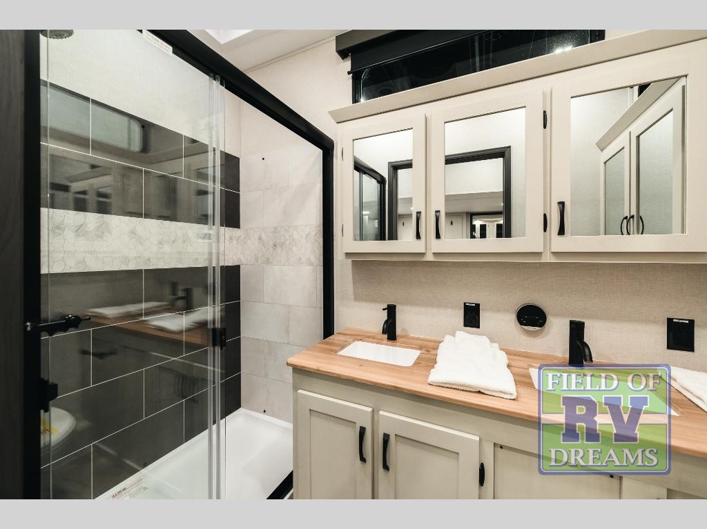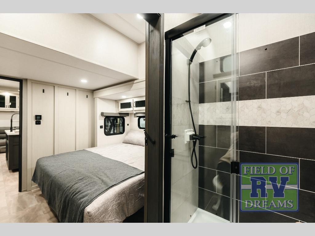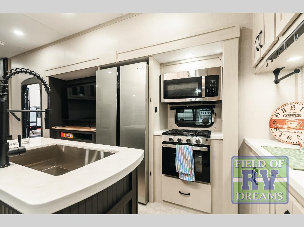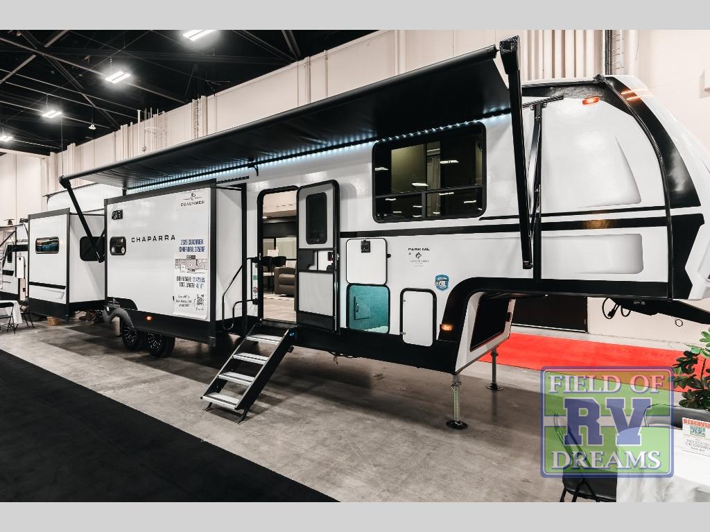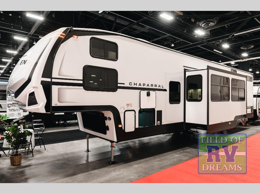 Each Chaparral mid-profile fifth wheel by Coachmen is designed with residential features, loads of storage space, and roomy bedroom suites to make you feel right at home. The durable construction means you can enjoy your RV for years to come. There's 6X double Azdel aluminum cage sidewall system, Weather Shield+ technology, and Tri-Tex powder coated frame technology that will help extend your camping season. Each model includes a Winegard Air 360+ HDTV/radio dome antenna to help keep you connected as you camp, slow rise blackout roller night shades, a new 16 cu. ft. side-by-side stainless glass 12V refrigerator, and a modern electric fireplace to make your space cozy. There is also a large transom window in the kitchen, a modern high-rise faucet, LED motion sensor lights in the bathroom, plus a full-size shower with glass doors and a seat. Now that's what I call luxury! Choose a Chaparral fifth wheel today!