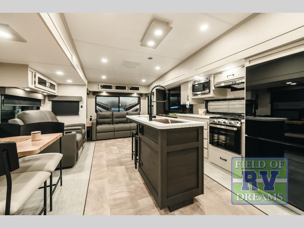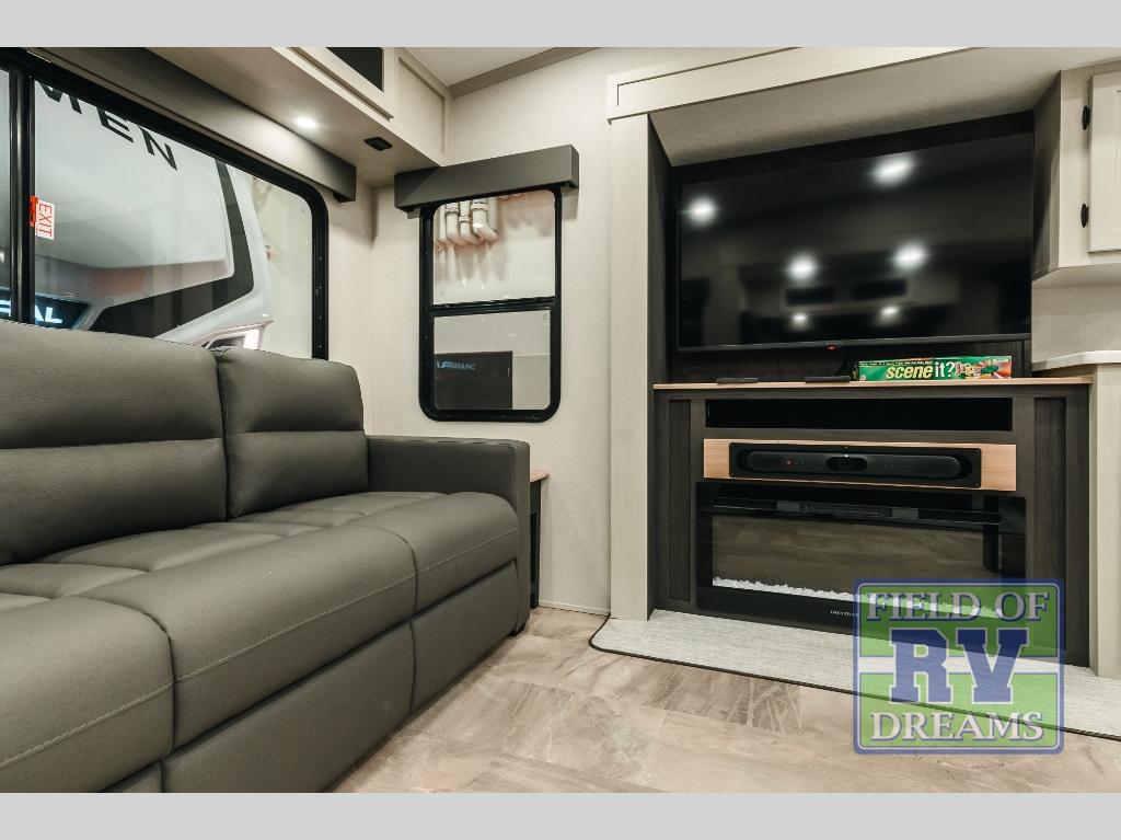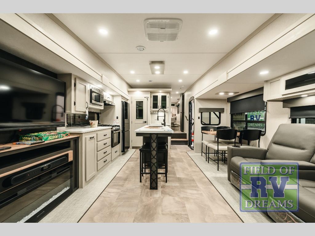 Get ready for a luxurious getaway in this fifth wheel! The rear living area is the perfect place to wind down your nights by relaxing on either the 78" tri-fold hide-a-bed sofa or the theater seating across from the entertainment center. You could even play a few card games at the free-spanning table while enjoying snacks that were stored in the pantry. The kitchen island comes with two bar stools so you can have two helpers get dinner ready while you're cooking on the three burner cooktop. The dual entry bathroom is easy for everyone to access and has a radius shower with glass doors to freshen up in, plus it leads directly into the front master suite where you will find a queen bed to lay your head on at night and a wardrobe/linen slide to keep your clothes looking their best!