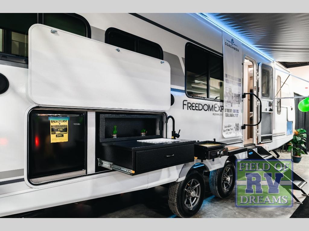 With any Freedom Express Ultra Lite travel trailer by Coachmen you will appreciate quality construction materials, such as vacuum bonded walls with Azdel composite, a 3/4 gel coated fiberglass cap with an automotive glass windshield, and a heated enclosed underbelly. Each model also features Tufflex PVC roofing, front rock guard, and E-Z Lube axles for smooth towing. Inside, you'll find kitchen backsplash, hidden hinge cabinetry, and wear-resistant vinyl flooring throughout. The power tongue jack included with the Ultra Lite Express Package will make set-up a breeze, and each model includes back-up camera prep and they are Freedom solar ready if you plan to go off-grid. Enjoy lightweight camping with a Freedom Express Ultra Lite travel trailer today!