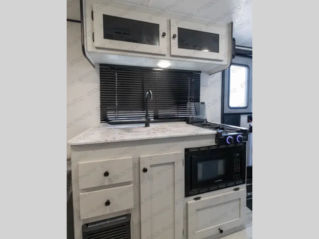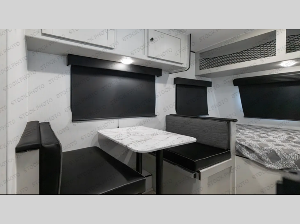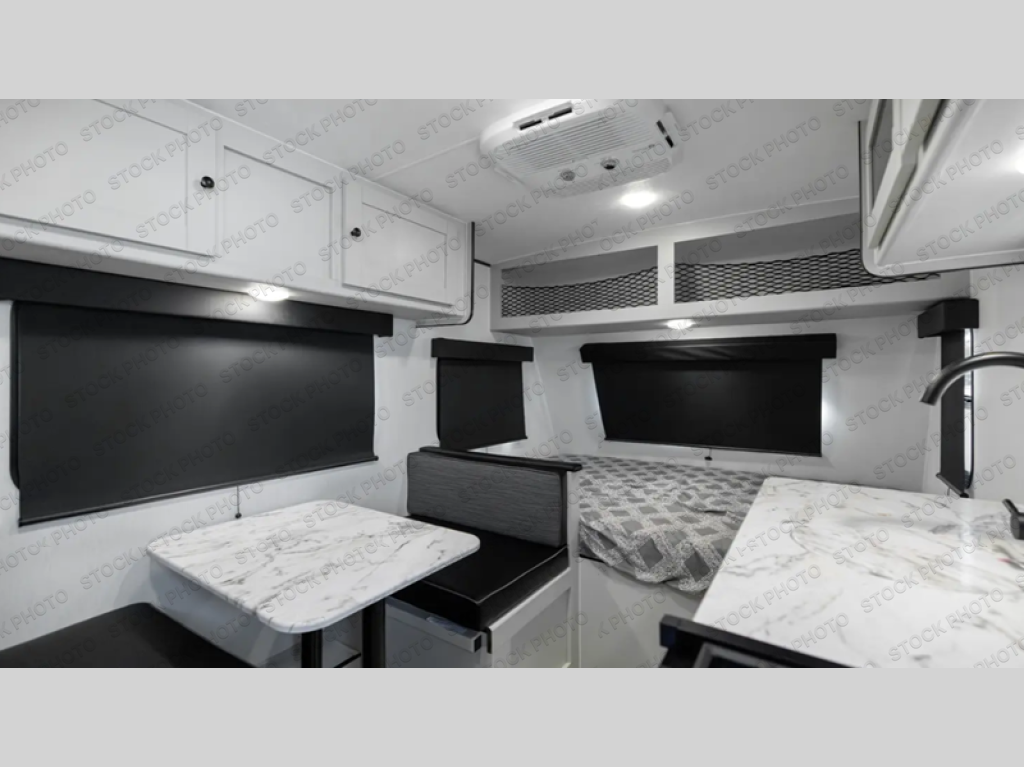 The Remote 14R packs a lot of comfort into a small footprint, starting with the 54" x 80" front bed that gives you true residential-style sleeping space. With storage outside for all your gear, it is an easy trailer for a couple or solo traveler to leave packed and ready for a quick getaway. Mid-coach, the booth dinette gives you a real sit-down spot for meals, card games, or laptop time, and can be used for extra sleeping when you have a guest. An efficient galley keeps everything within reach, and the rear corner bath means you still get your own shower and toilet instead of relying on campground facilities. All together, it feels simple, open, and practical for anyone who wants a lightweight that still feels like a “real” camper inside.
