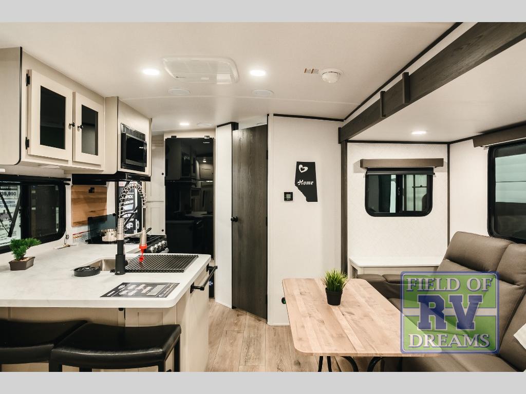 Sleep like royalty at any campsite when you have this trailer setup. You will find the interior is spacious with a slide out sofa including end tables for your drinks and cellphones, and the rear corner bathroom is convenient with a radius shower and linen storage. Your dog can stay clean as well with the exterior dog wash and the dog leash clip will keep them safely at the campsite. While outside you might decide to relax under the 15' awning, and store a few items in the pass-through compartment up front including fishing poles. And the cook will love the L-shaped counter, appliances, the hutch and the bar stools when wanting to take a break or visit with friends.
