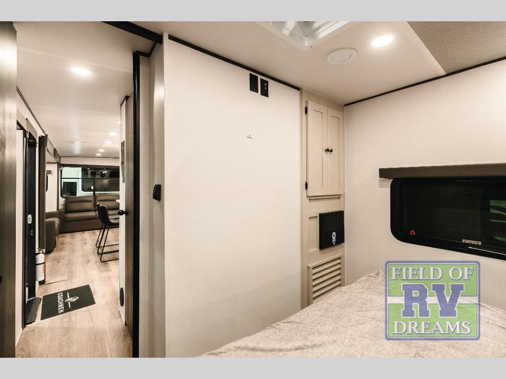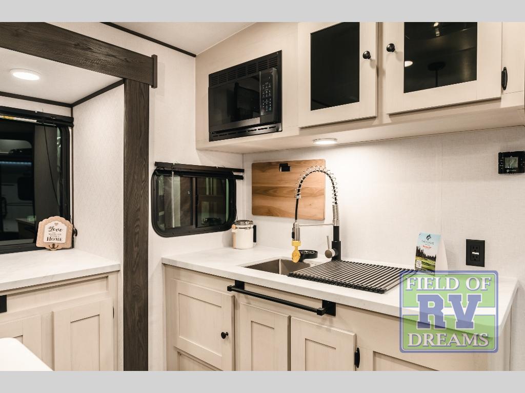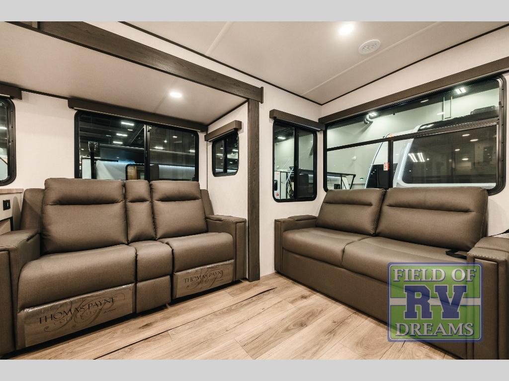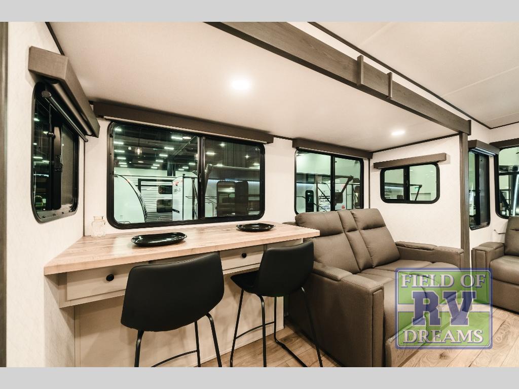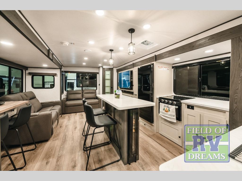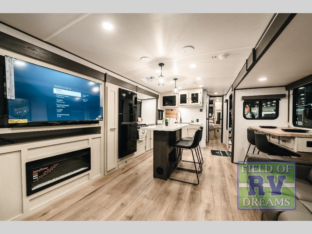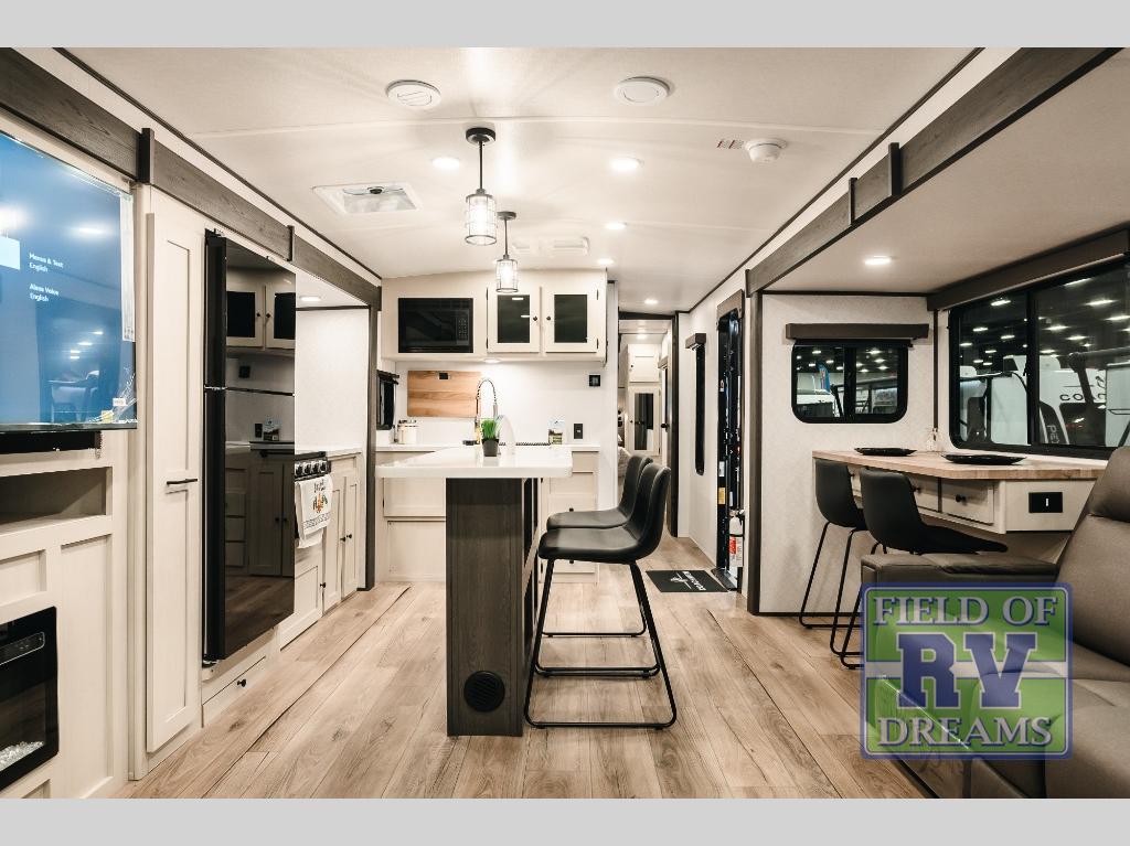 Escape to a world of adventure and relaxation with this incredible travel trailer! The rear living area is a dynamic hub of entertainment, featuring a versatile tri-fold sofa and a premium theater seat that lets you immerse yourself in your favorite shows or movies. The cutting-edge entertainment center provides endless hours of fun. Equipped with top-of-the-line appliances, including a spacious refrigerator, three-burner range, and microwave, the kitchen is a culinary haven. The functional kitchen island provides additional counter space, while the generous walk-in pantry and ample overhead cabinets keep your kitchen essentials organized and within easy reach. The front bedroom is a serene sanctuary, featuring a comfortable queen bed with plenty of storage under it and spacious wardrobes on each side of the bed, ideal for keeping your favorite outfits organized and free of dirt.