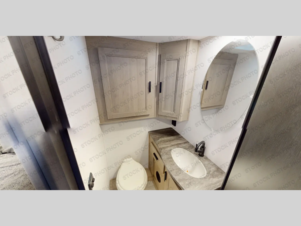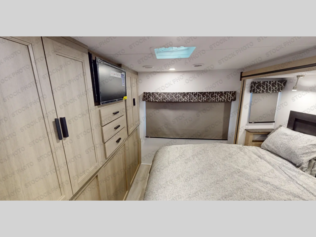The chef will love cooking with this motorhome! They can choose to cook either indoors with the three burner cooktop and flip-up countertop or head to the outside kitchen to breathe in some fresh air while they grill up some juicy burgers on the cooktop. The separated bathroom makes it easy for one to freshen up in the 24" x 36" shower while another uses the private toilet and sink with a medicine cabinet above it. The rear private bedroom has a 60" x 74" queen bed slide with nightstands to set your glass of water and wardrobes on either side of a linen closet with a 12V TV for your entertainment. The booth dinette and sofa also offer comfortable sleeping spaces once converted, as well as the 60" x 80" bunk over cab mat which can be switched out for an optional Trekker cap with a built-in entertainment center!