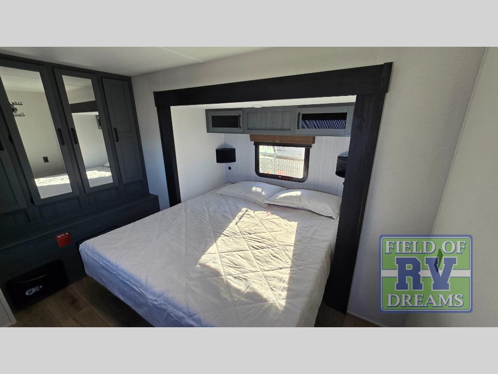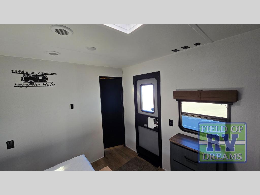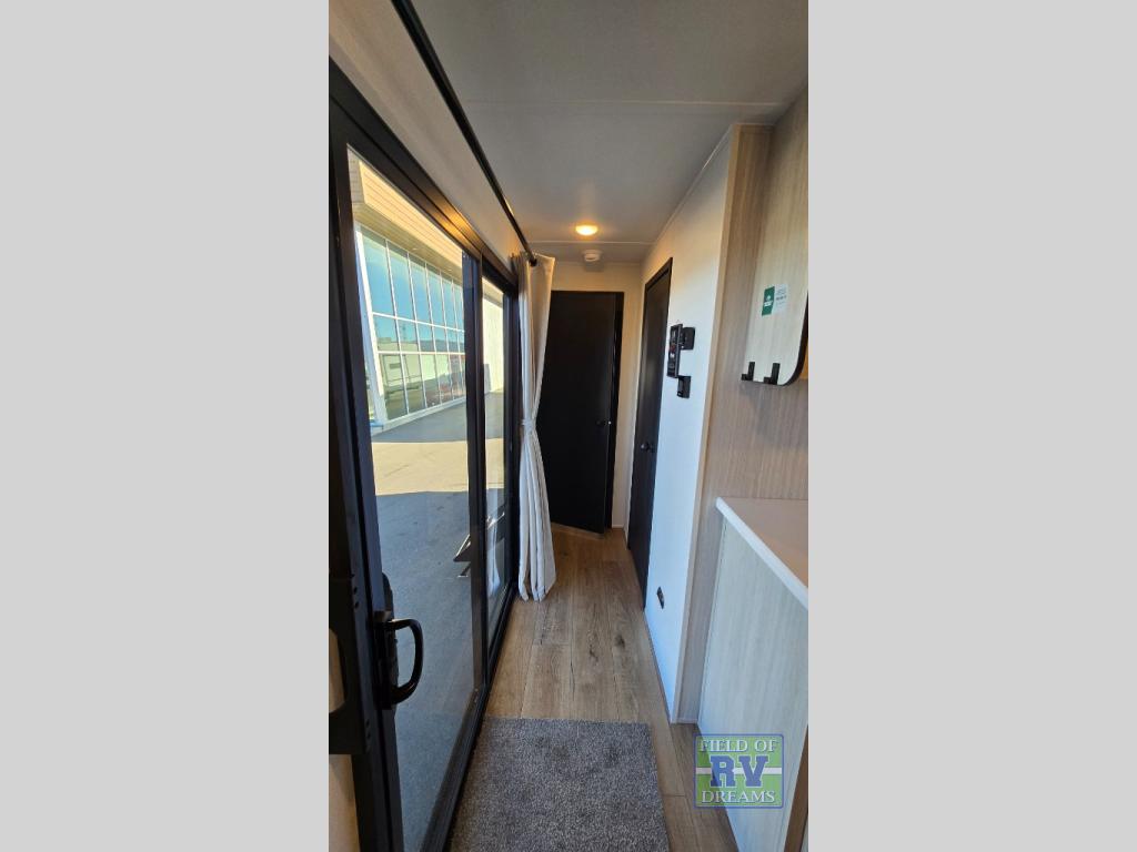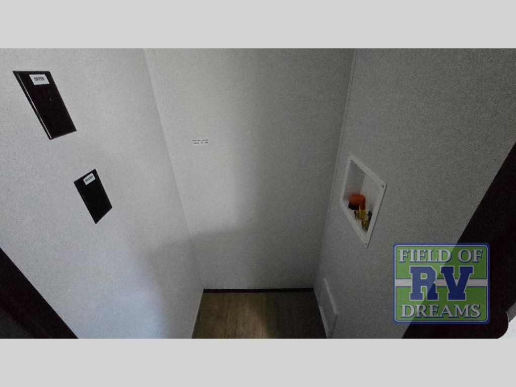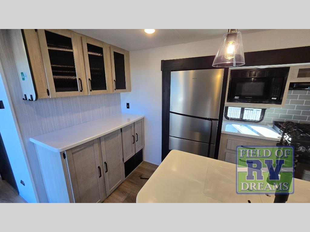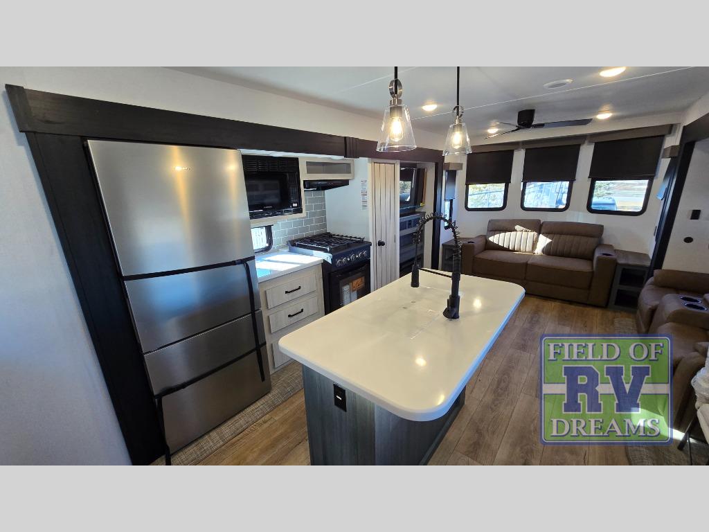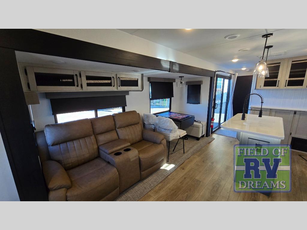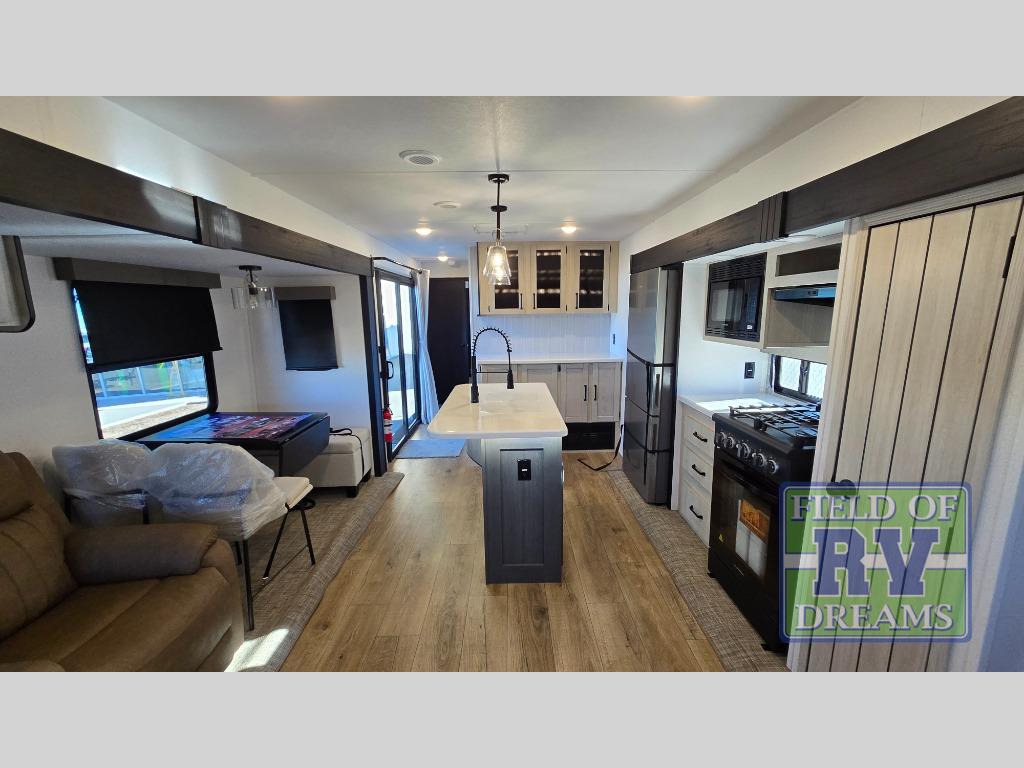 Get ready to enjoy your destination for a weekend or even longer in comfort with the front living and kitchen combined area. The sofa, table and chairs plus theater seating offer a place to relax, dine, and let guests sleep over. There is a kitchen island to prepare and serve meals from and wash the dishes. The kitchen offers full amenities including a residential-style refrigerator and plenty of storage. You will surely enjoy the natural lighting from the patio door, and the second entry/exit is located in the rear private bedroom where you can sleep like royalty on the king bed. There is also a closet with washer and dryer prep if you choose to add these appliances.