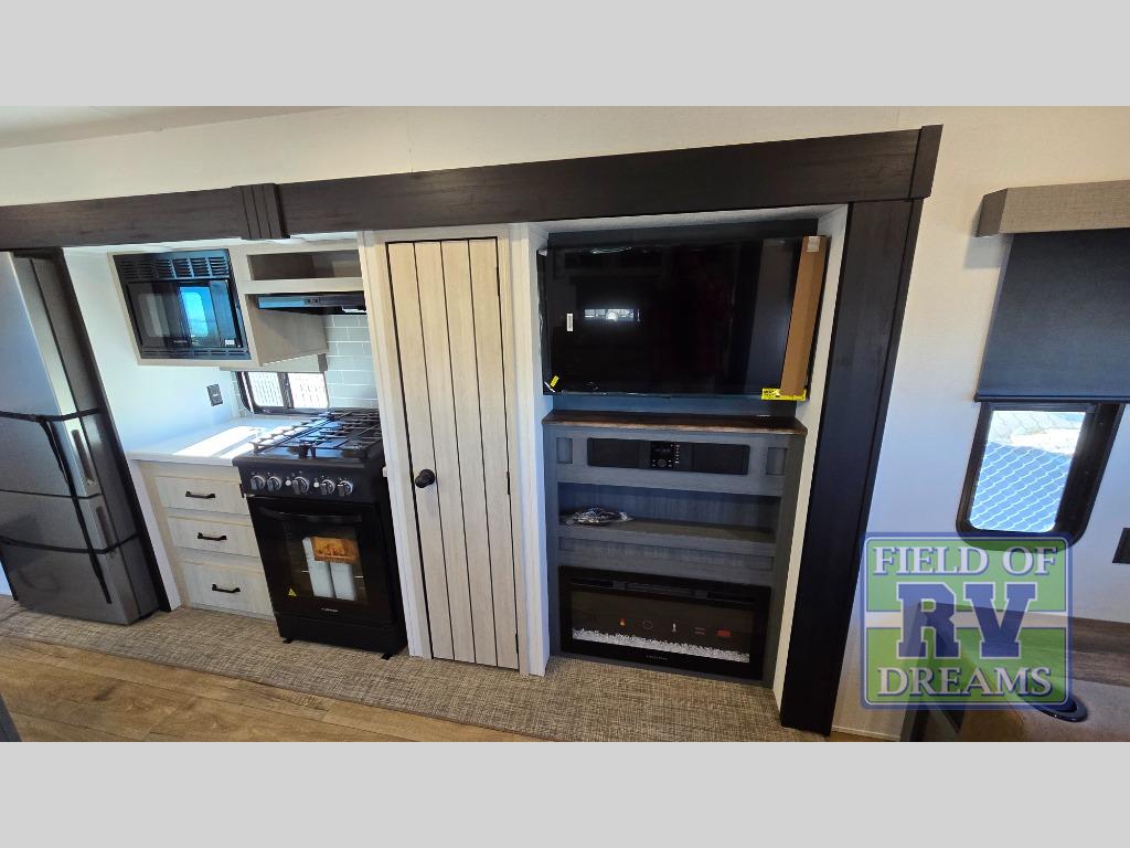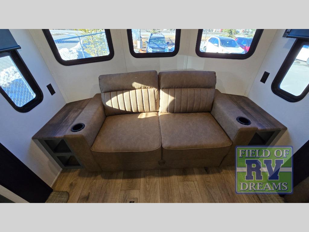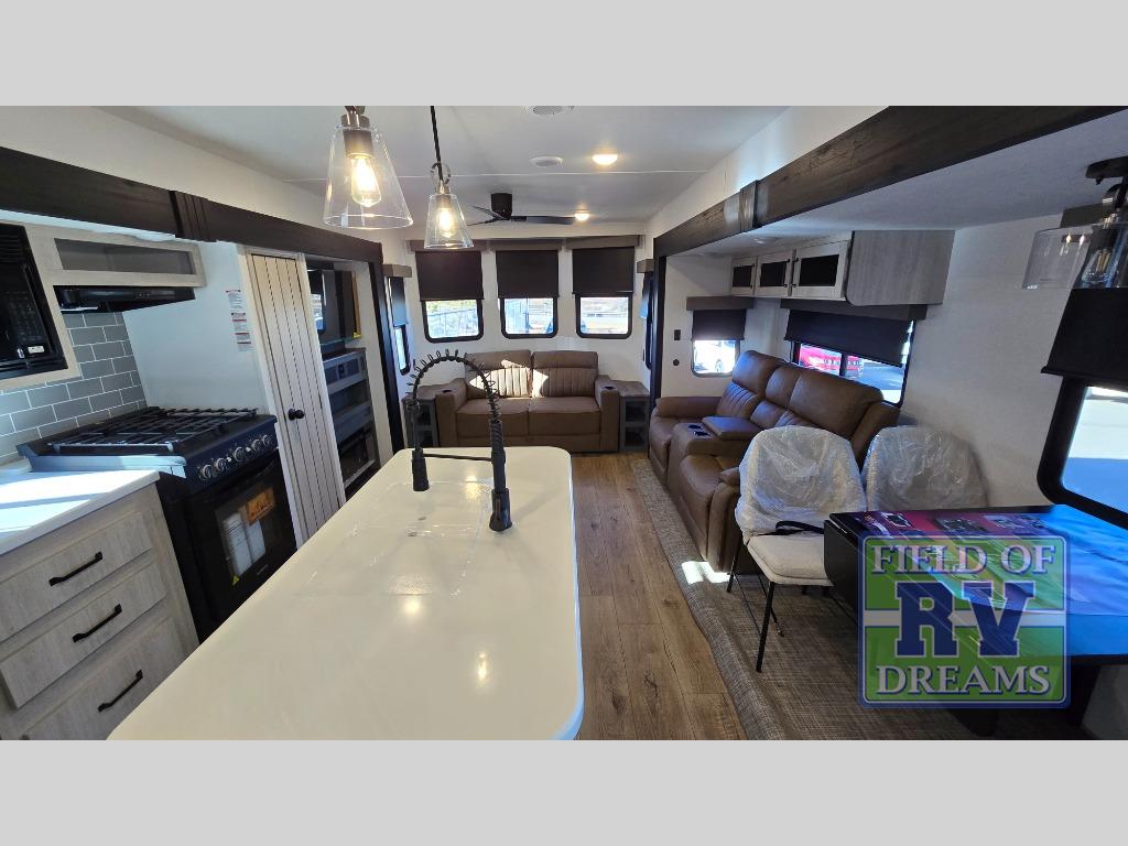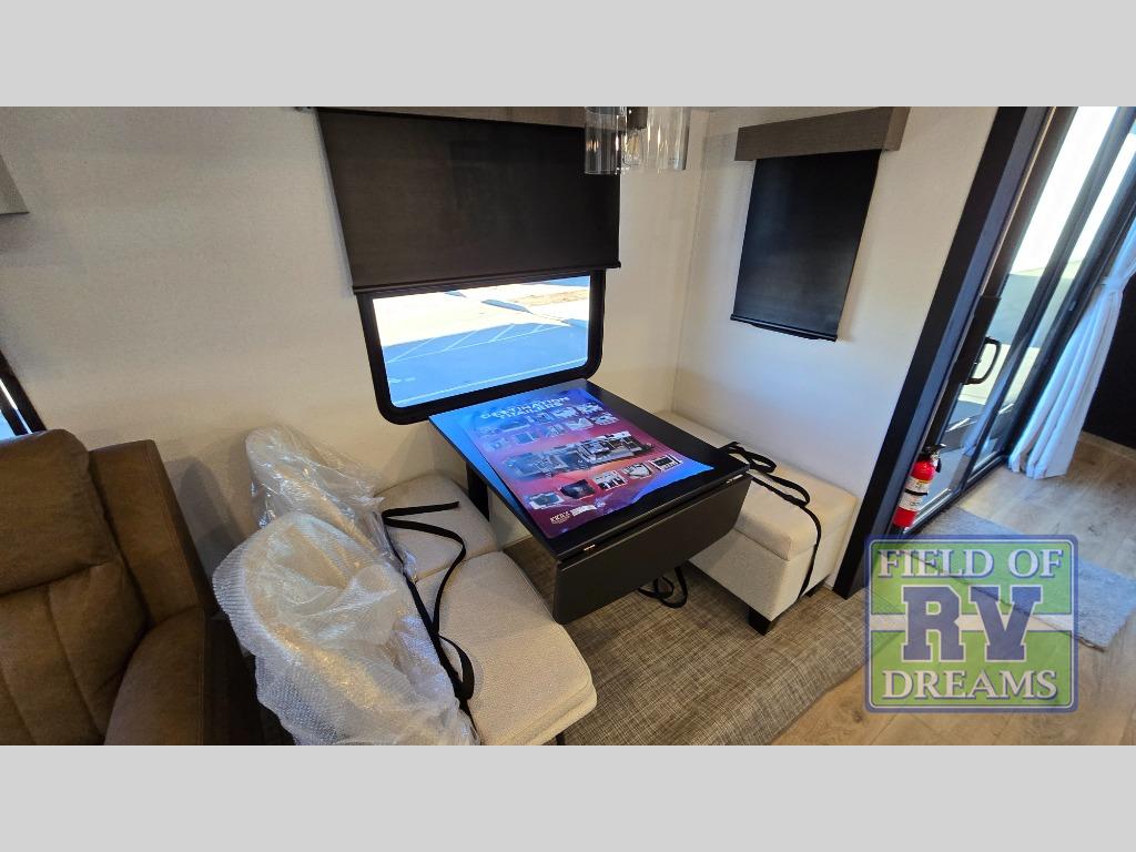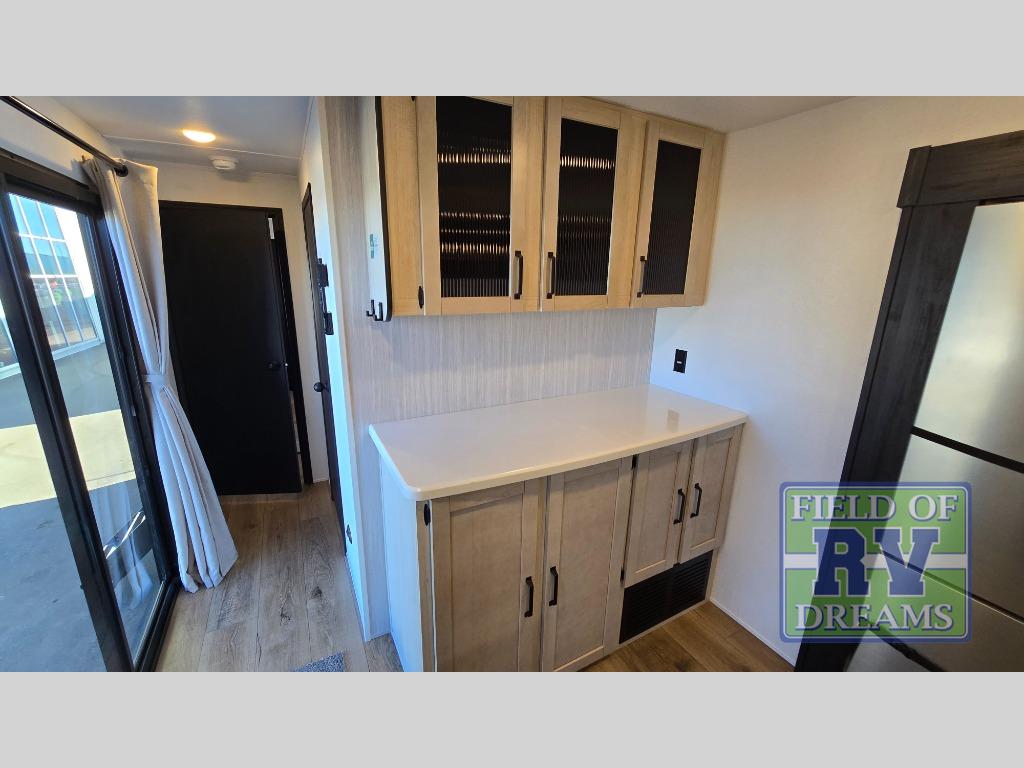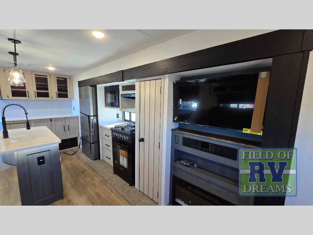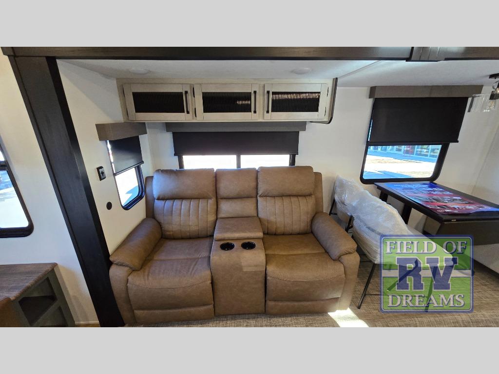 Get ready to enjoy your destination for a weekend or even longer in comfort with the front living and kitchen combined area. The sofa, table and chairs plus theater seating offer a place to relax, dine, and let guests sleep over. There is a kitchen island to prepare and serve meals from and wash the dishes. The kitchen offers full amenities including a residential-style refrigerator and plenty of storage. You will surely enjoy the natural lighting from the patio door, and the second entry/exit is located in the rear private bedroom where you can sleep like royalty on the king bed. There is also a closet with washer and dryer prep if you choose to add these appliances.