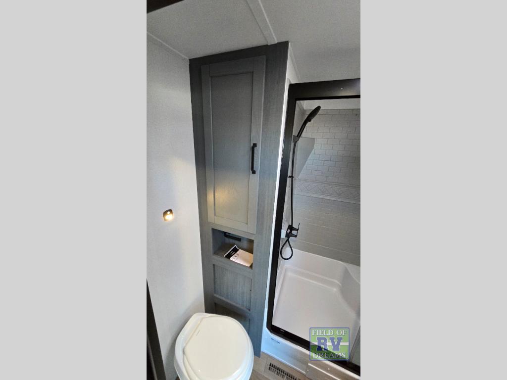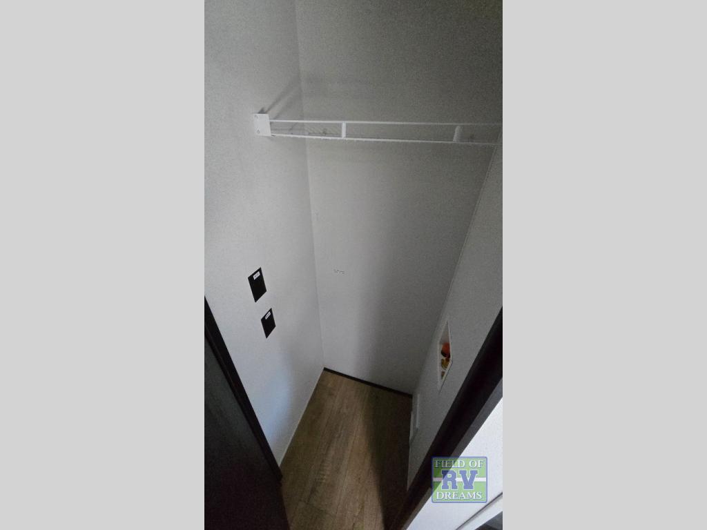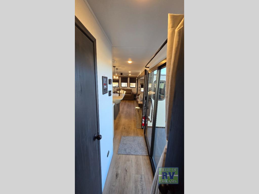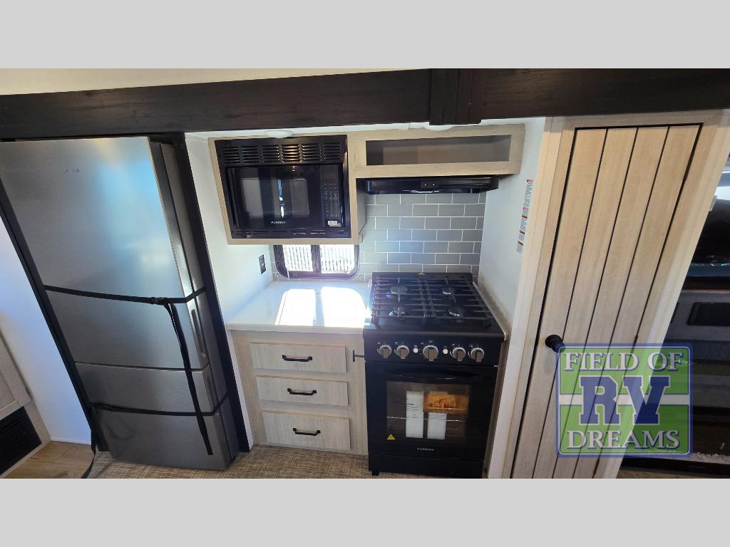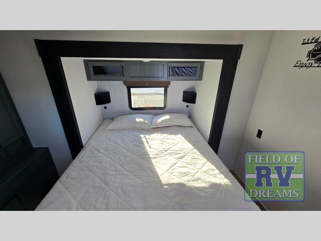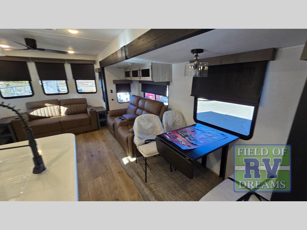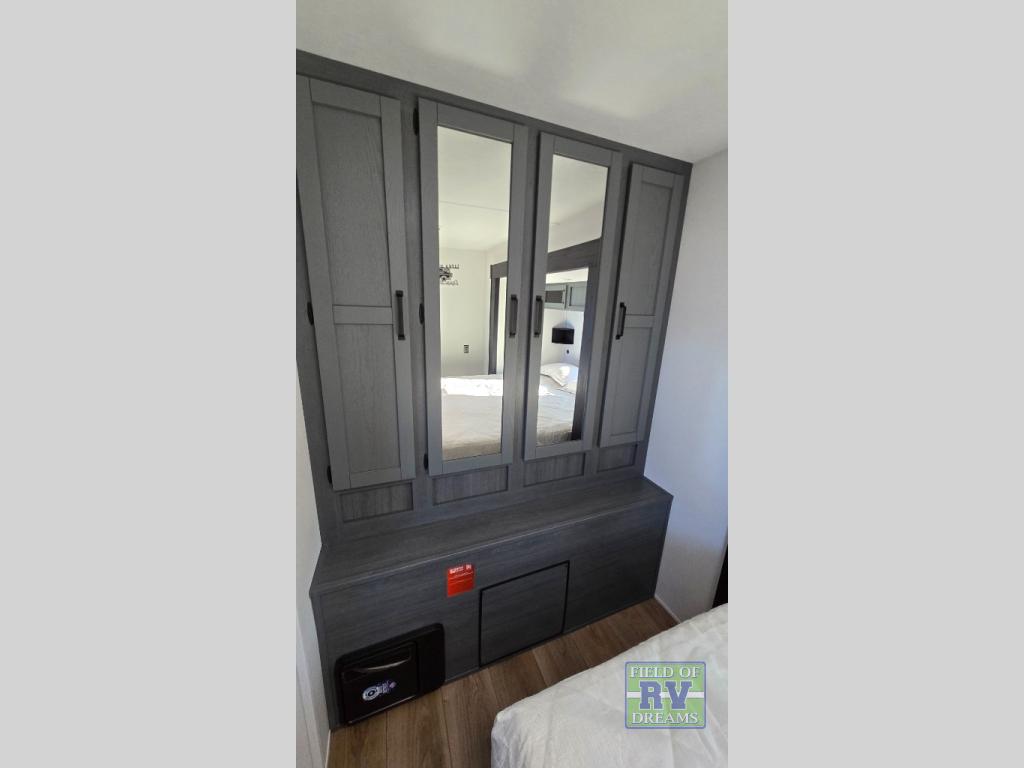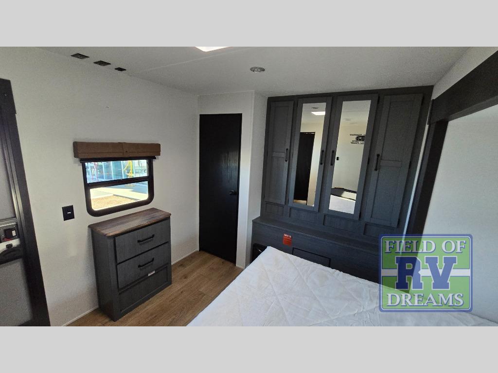 Get ready to enjoy your destination for a weekend or even longer in comfort with the front living and kitchen combined area. The sofa, table and chairs plus theater seating offer a place to relax, dine, and let guests sleep over. There is a kitchen island to prepare and serve meals from and wash the dishes. The kitchen offers full amenities including a residential-style refrigerator and plenty of storage. You will surely enjoy the natural lighting from the patio door, and the second entry/exit is located in the rear private bedroom where you can sleep like royalty on the king bed. There is also a closet with washer and dryer prep if you choose to add these appliances.