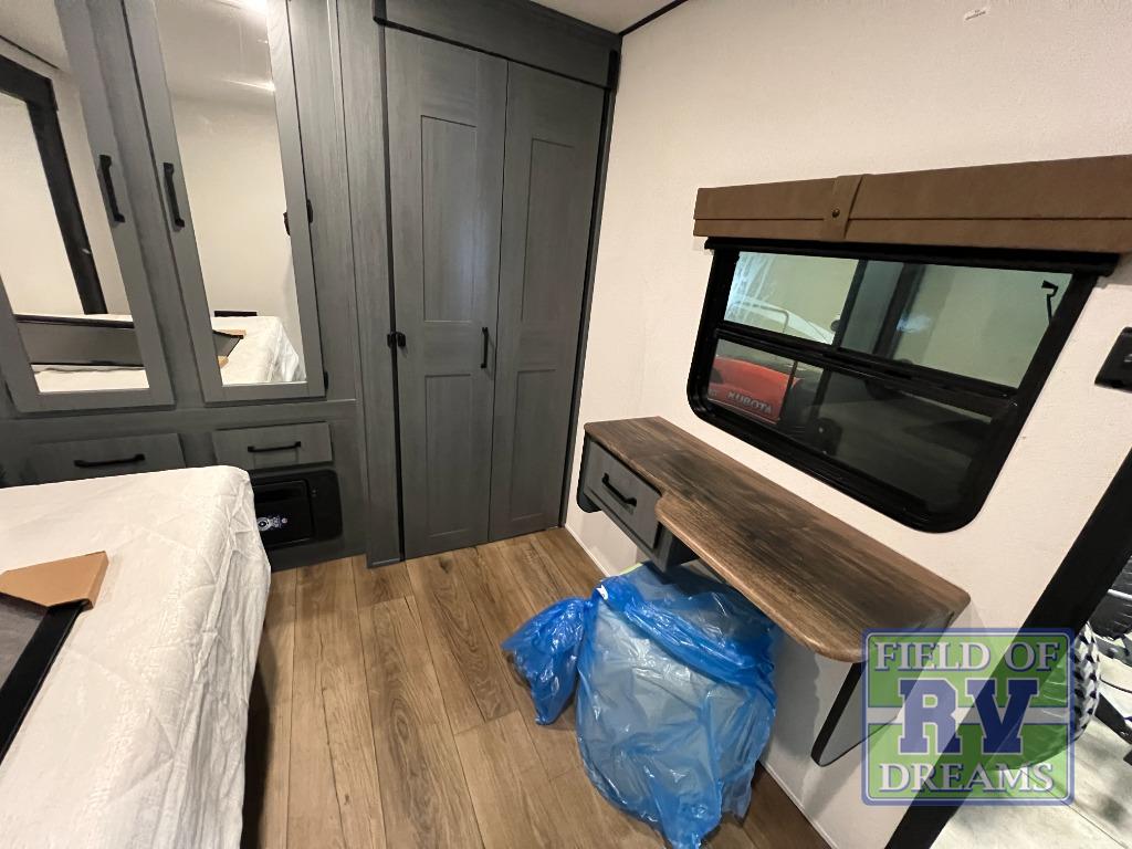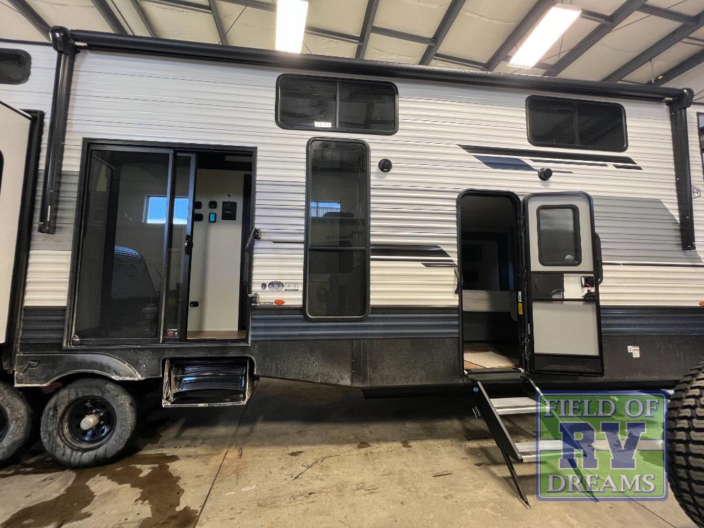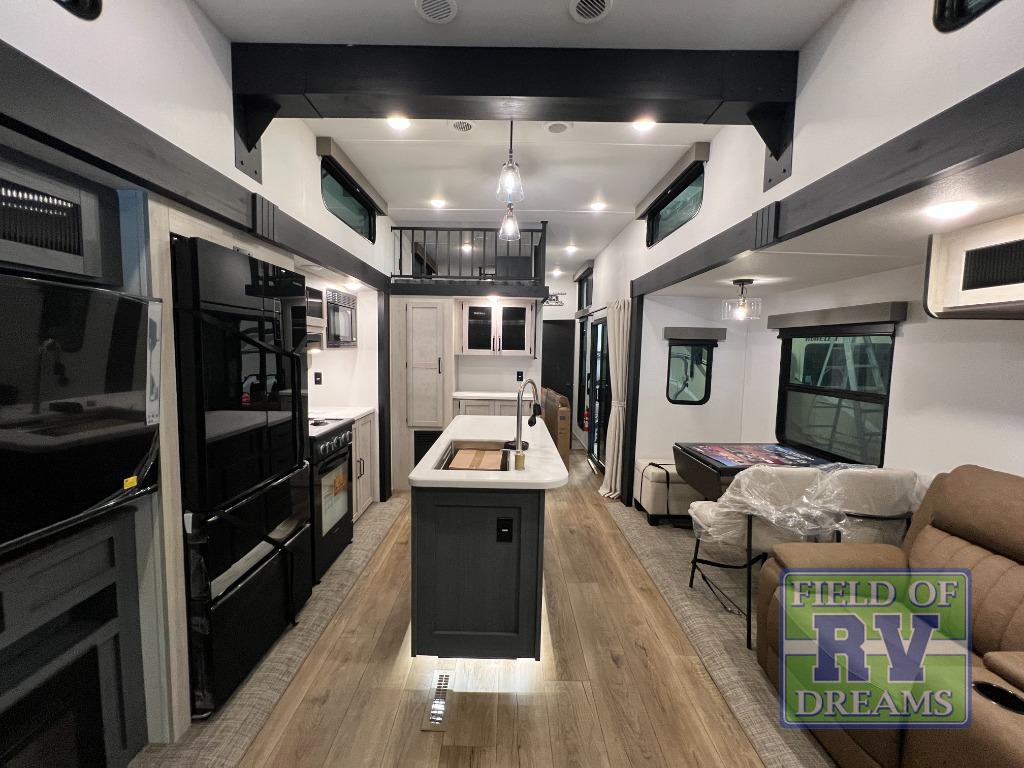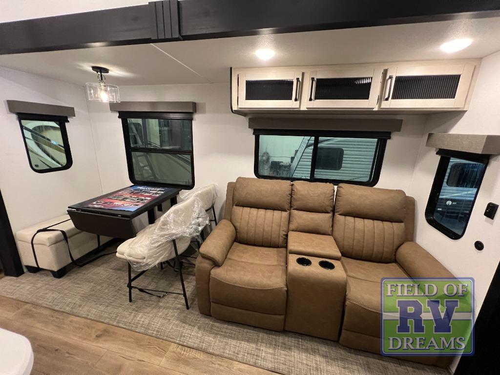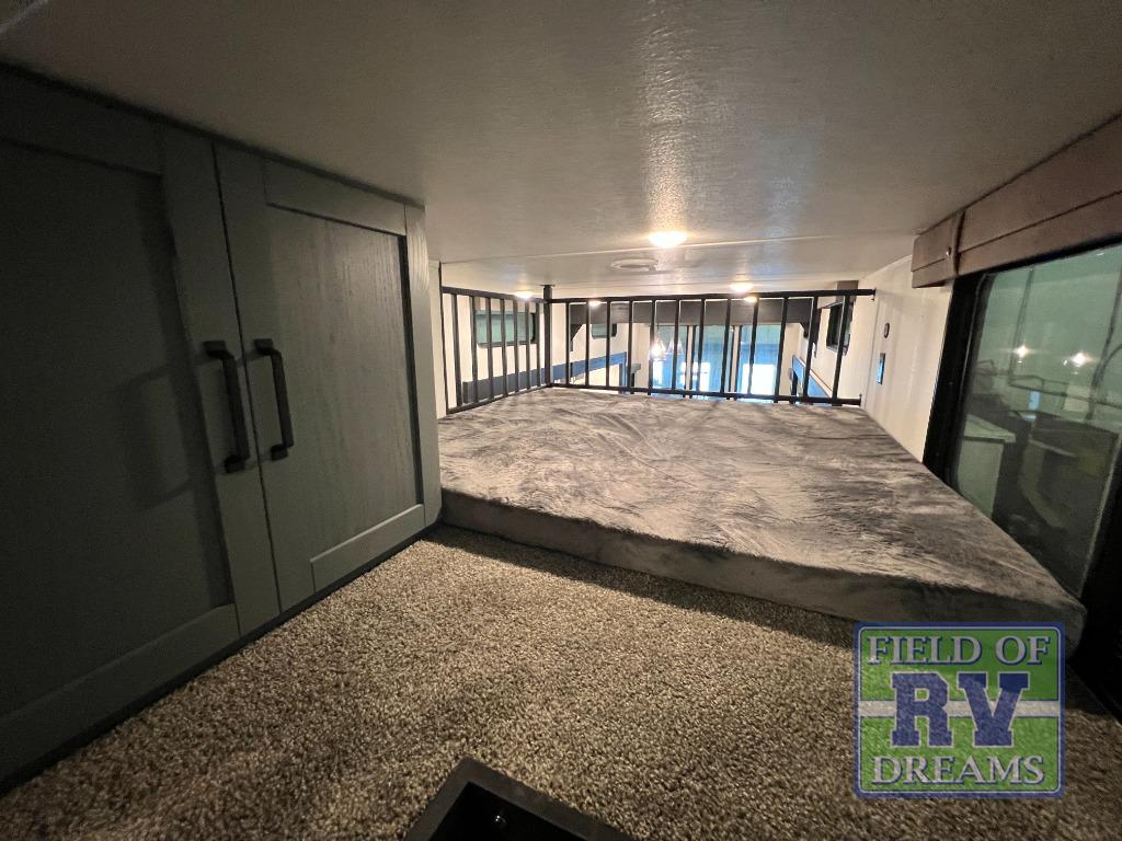 Wherever your destination may be, you can be sure to enjoy it to the fullest with this trailer in tow! With two entry doors, you can enter in through the front private bedroom or the main living area. The bedroom includes a king bed slide out, a desktop if you need to work from home, and a wardrobe/closet to keep your clothes organized. There is also a closet with the washer and dryer prep if you plan to add these appliances. Just outside this room are steps that lead to the large loft area with a 58" x 58" bunk mat and a cabinet on one side, plus two 32" x 80" bunk mats on the other. There is also a front cabinet and a wardrobe/closet for plenty of storage space. Once you've headed back downstairs, you can relax on the theater seating, rear sofa, or table and chairs with bench seating. And the chef of your group will love the kitchen with its residential style refrigerator and pantry, kitchen island, and four burner cooktop!