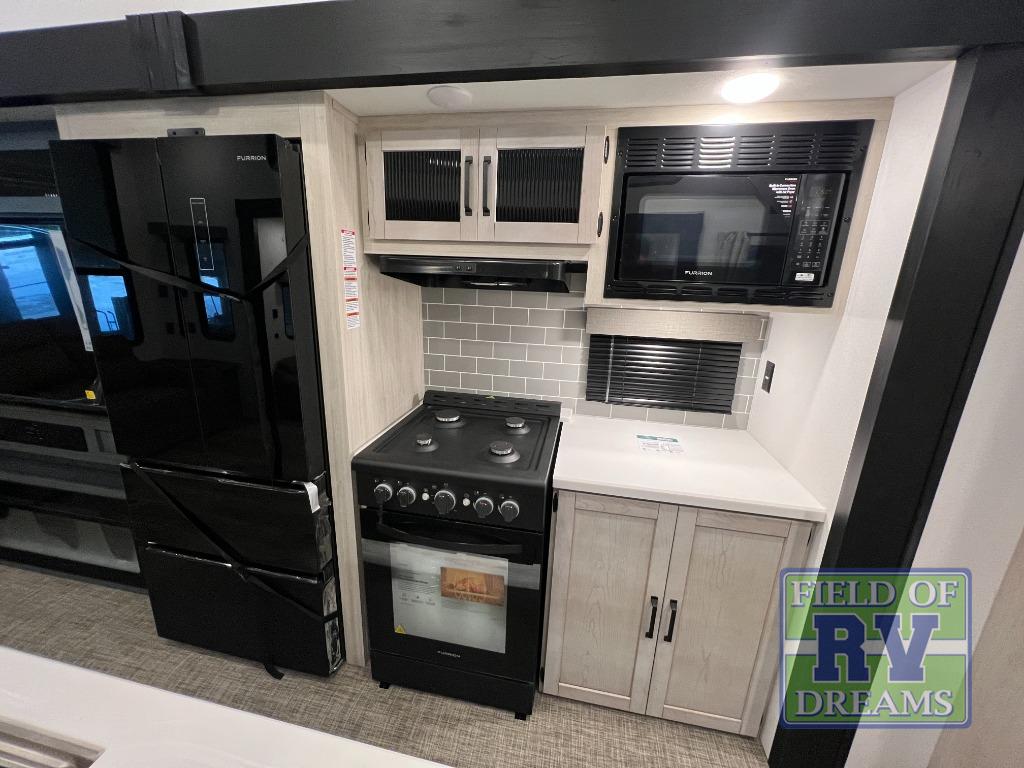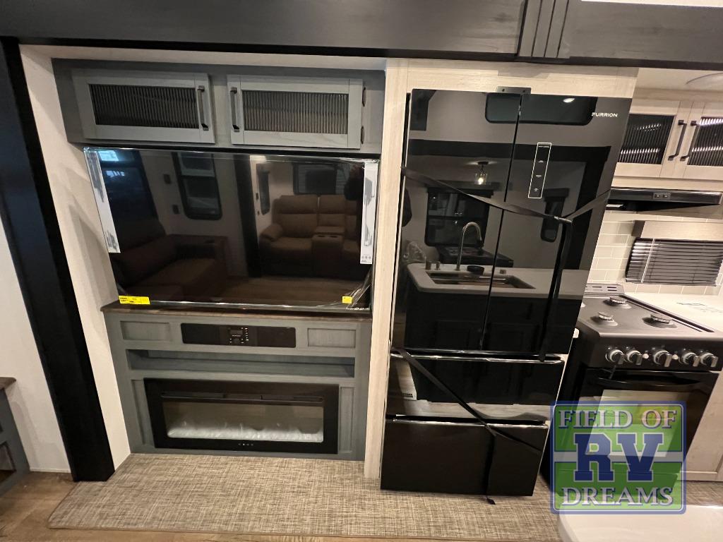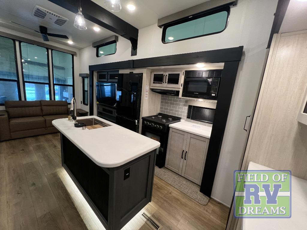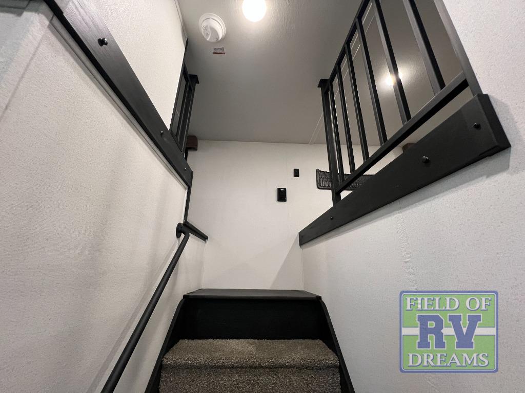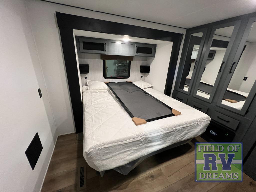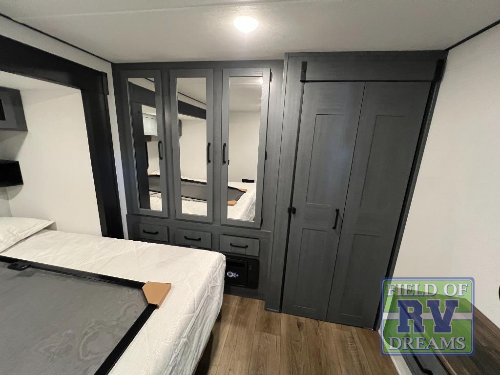 Wherever your destination may be, you can be sure to enjoy it to the fullest with this trailer in tow! With two entry doors, you can enter in through the front private bedroom or the main living area. The bedroom includes a king bed slide out, a desktop if you need to work from home, and a wardrobe/closet to keep your clothes organized. There is also a closet with the washer and dryer prep if you plan to add these appliances. Just outside this room are steps that lead to the large loft area with a 58" x 58" bunk mat and a cabinet on one side, plus two 32" x 80" bunk mats on the other. There is also a front cabinet and a wardrobe/closet for plenty of storage space. Once you've headed back downstairs, you can relax on the theater seating, rear sofa, or table and chairs with bench seating. And the chef of your group will love the kitchen with its residential style refrigerator and pantry, kitchen island, and four burner cooktop!