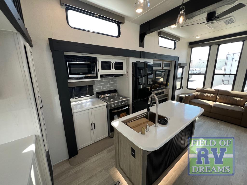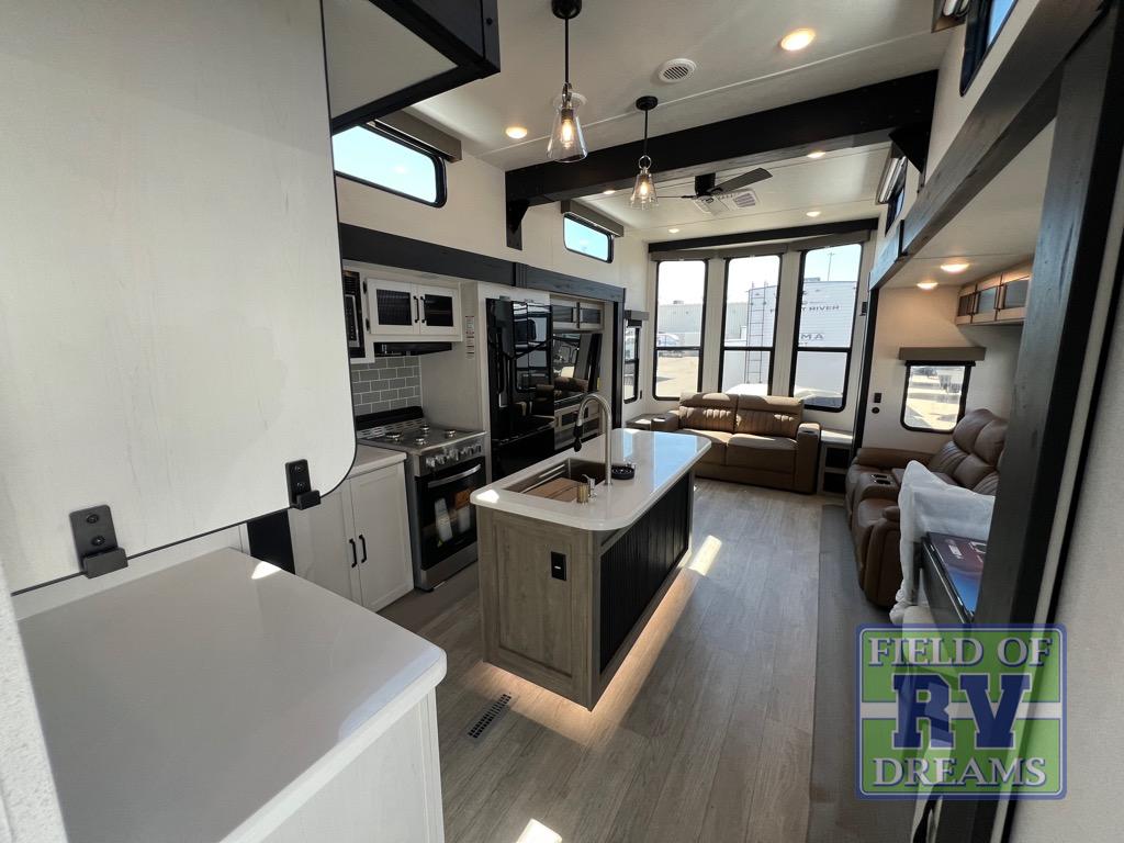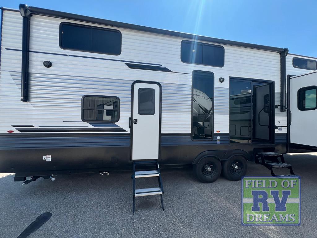 Wherever your destination may be, you can be sure to enjoy it to the fullest with this trailer in tow! With two entry doors, you can enter in through the rear private bedroom or the main living area. The bedroom includes a king bed slide out, a wardrobe/closet to keep your clothes organized, plus a closet with the option to add washer and dryer prep. Just outside this room are steps that lead to the large loft area with a 58" x 58" bunk mat and a cabinet on one side, plus two 32" x 69" bunk mats on the other. There is also a cabinet and a wardrobe/closet for plenty of storage space. Once you've headed back downstairs, you can relax on the dual recliners, front sofa, or free-standing table with a bench and two seats. And the chef of your group will love the kitchen with its residential style refrigerator and pantry, kitchen island, and four burner cooktop!
