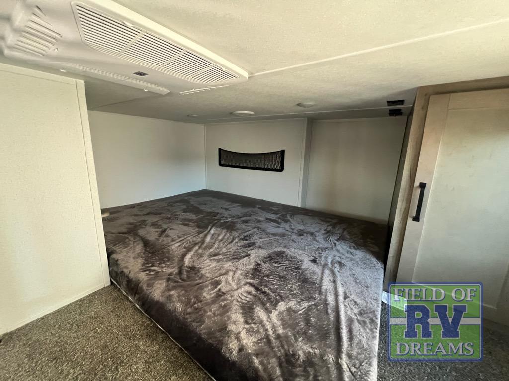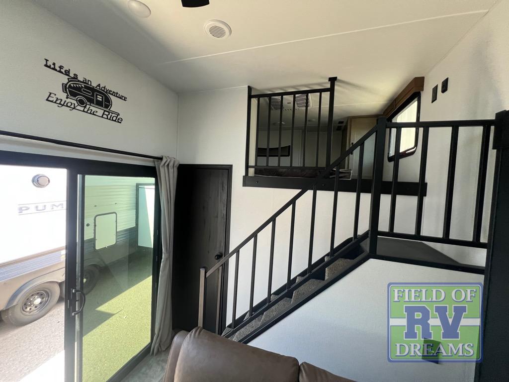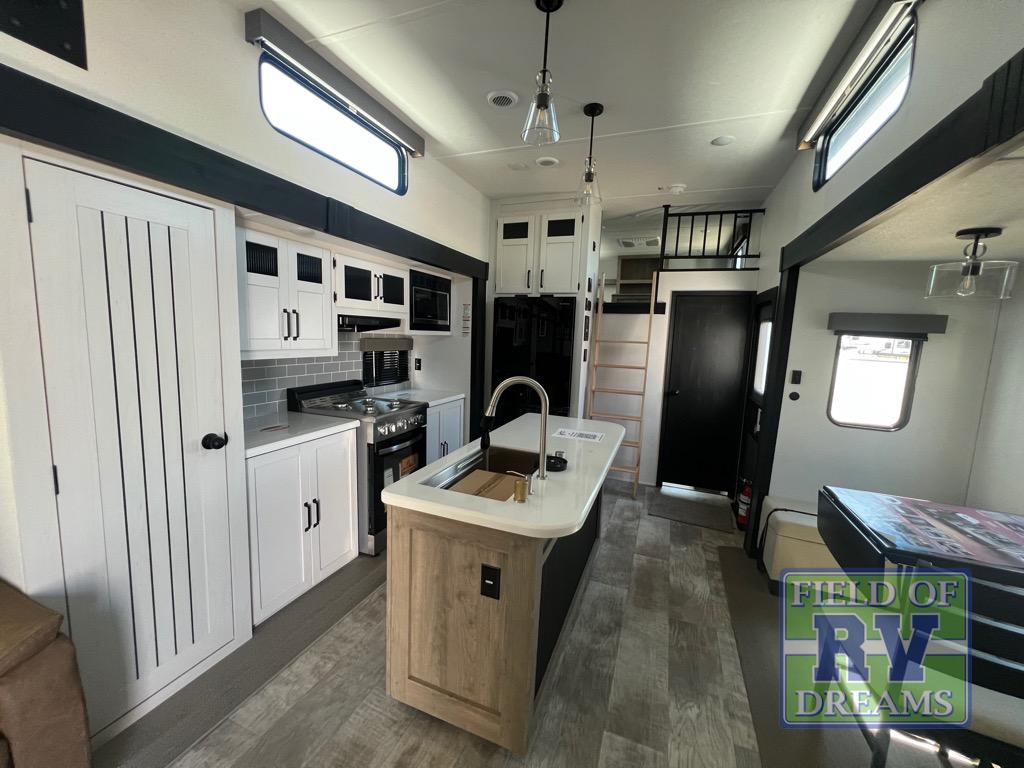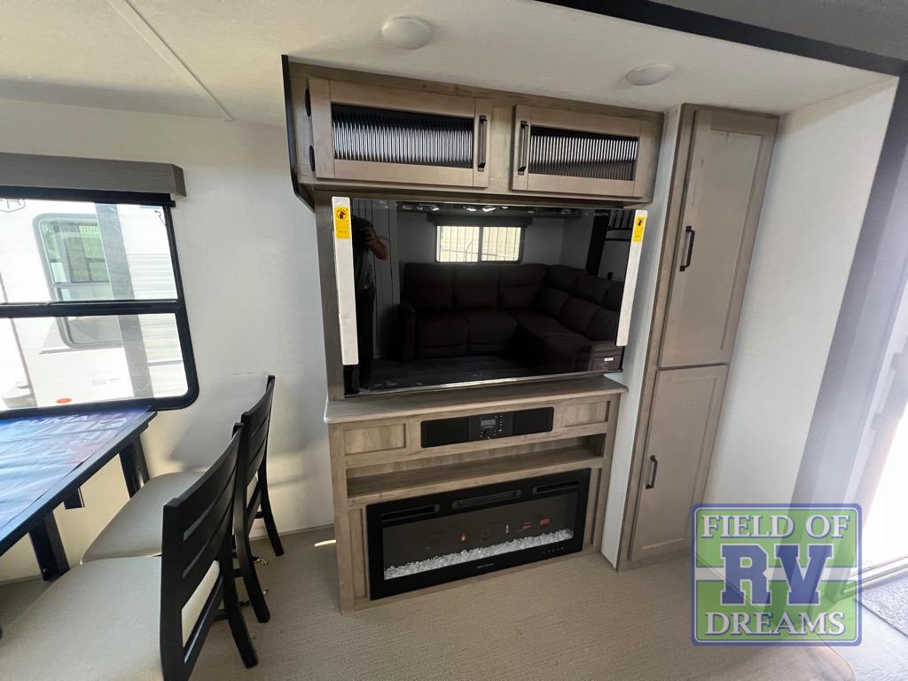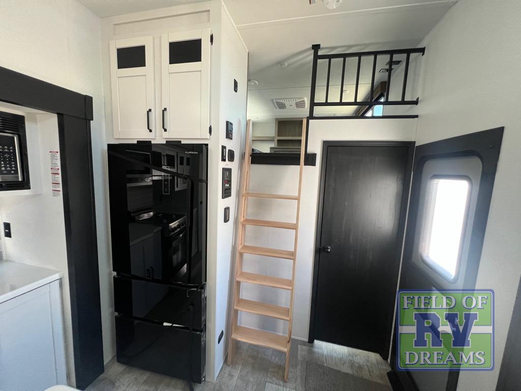 Head to your favorite spots with this destination trailer! With two entry doors, you can easily enter or exit the unit. The front private bedroom includes a king bed slide out, a wardrobe and dresser to keep your clothes organized, plus a countertop for your books or jewelry. Just outside this room is the ladder that leads to the large loft area with two 32" x 80" bunk mats, a cubby, a counter, a nightstand, and cabinets. Once you've headed back downstairs, you can relax on the L-shaped sofa across from the entertainment center with a fireplace and slide-out cabinet or the free-standing table with a bench and two seats. And the chef of your group will love the kitchen with its residential style refrigerator and pantry, kitchen island, and four burner cooktop. The full rear bathroom not only has a 32" x 40" shower with a seat to freshen up in and a closet prepped to add the optional washer and dryer, but is also below the second loft with a 32" x 80" bunk mat and closet for storage!