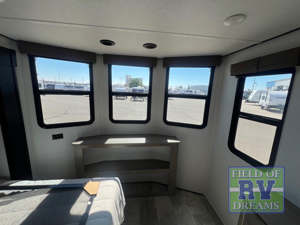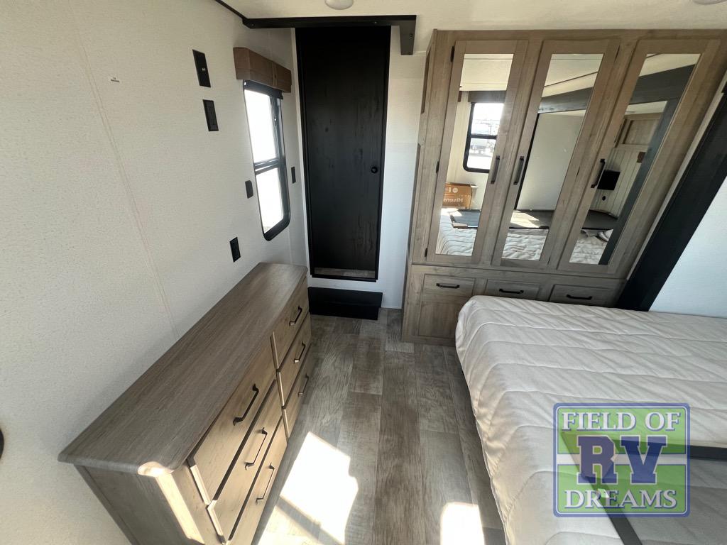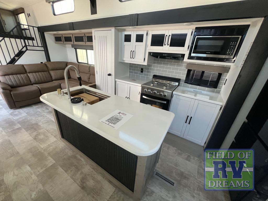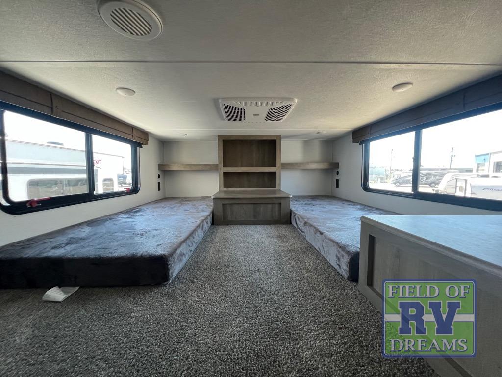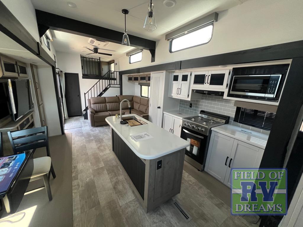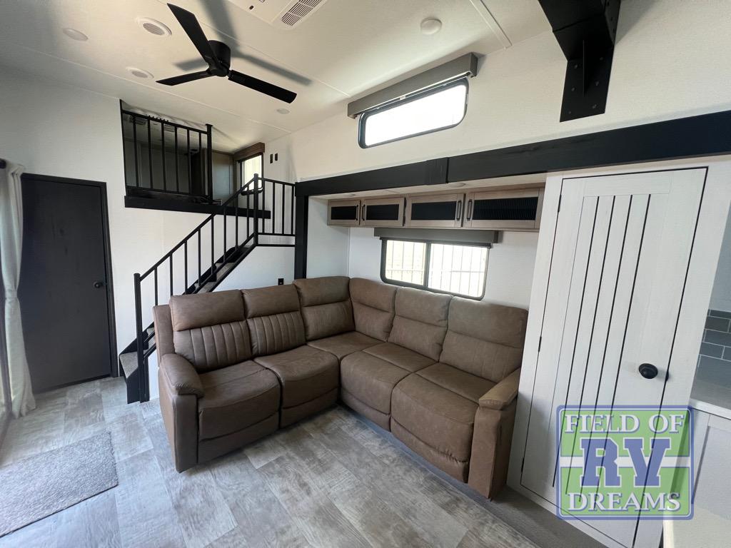 Head to your favorite spots with this destination trailer! With two entry doors, you can easily enter or exit the unit. The front private bedroom includes a king bed slide out, a wardrobe and dresser to keep your clothes organized, plus a countertop for your books or jewelry. Just outside this room is the ladder that leads to the large loft area with two 32" x 80" bunk mats, a cubby, a counter, a nightstand, and cabinets. Once you've headed back downstairs, you can relax on the L-shaped sofa across from the entertainment center with a fireplace and slide-out cabinet or the free-standing table with a bench and two seats. And the chef of your group will love the kitchen with its residential style refrigerator and pantry, kitchen island, and four burner cooktop. The full rear bathroom not only has a 32" x 40" shower with a seat to freshen up in and a closet prepped to add the optional washer and dryer, but is also below the second loft with a 32" x 80" bunk mat and closet for storage!