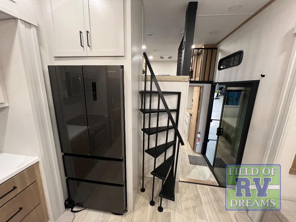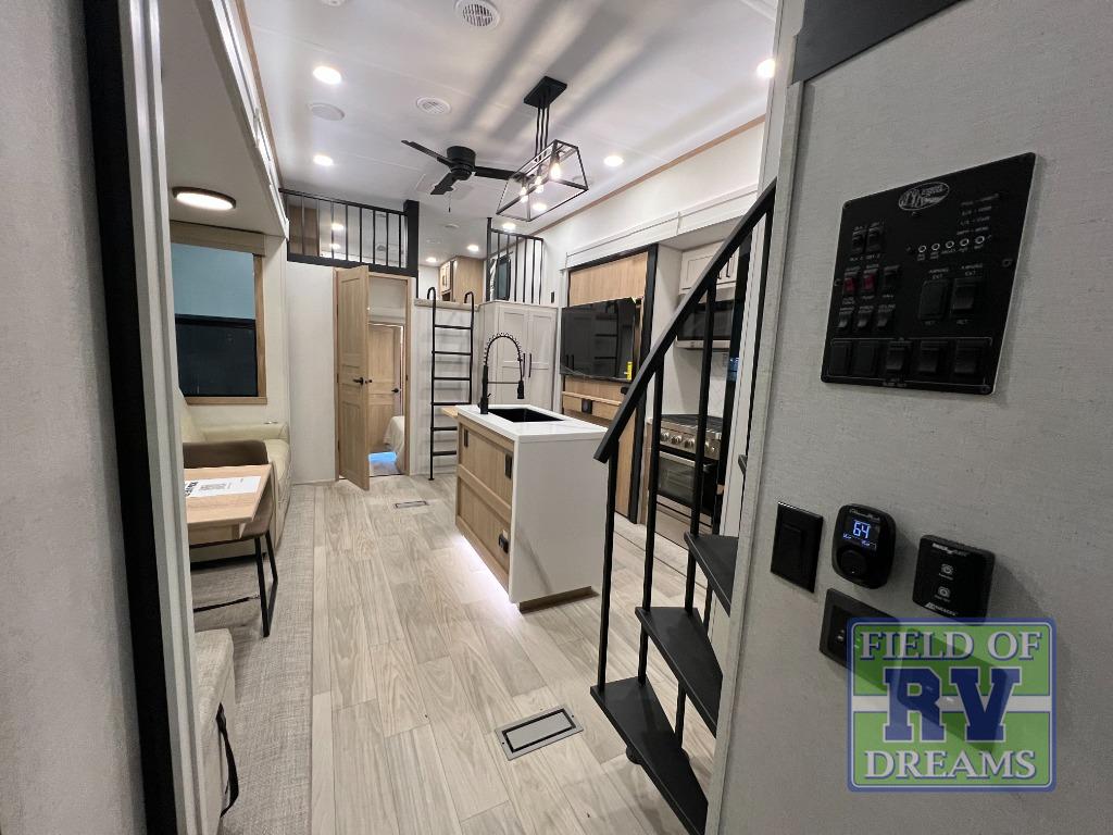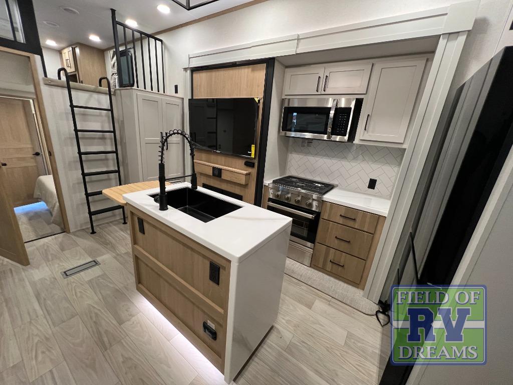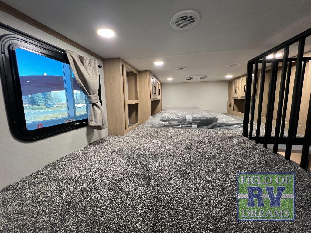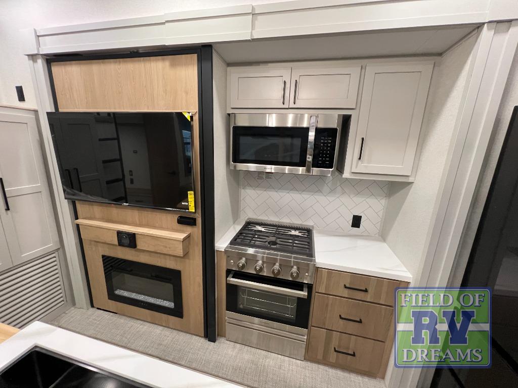 You won't believe the comfort and convenience found in this destination trailer. There are two private bedrooms; one up front with a queen bed slide out and storage space, and one in back with a queen bed slide out and a half bath! There is even washer and dryer prep here if you want to add those appliances and the second entry door is also found in this location so you can easily slip out in the morning. Above each of these rooms is a loft providing three total bunk mats for sleeping, storage cabinets, and TV prep if you want to add entertainment. Everyone can meet in the combined kitchen and living room that includes dual opposing slides, a 60" theater seating across from a 50" flat screen TV and fireplace, plus a free-standing table with chairs and a bench to dine at. The chef of your group will love the large kitchen island, Chef Collection three burner range, and a 16.2 cu. ft. refrigerator for food storage.