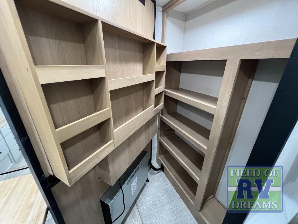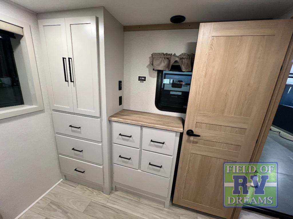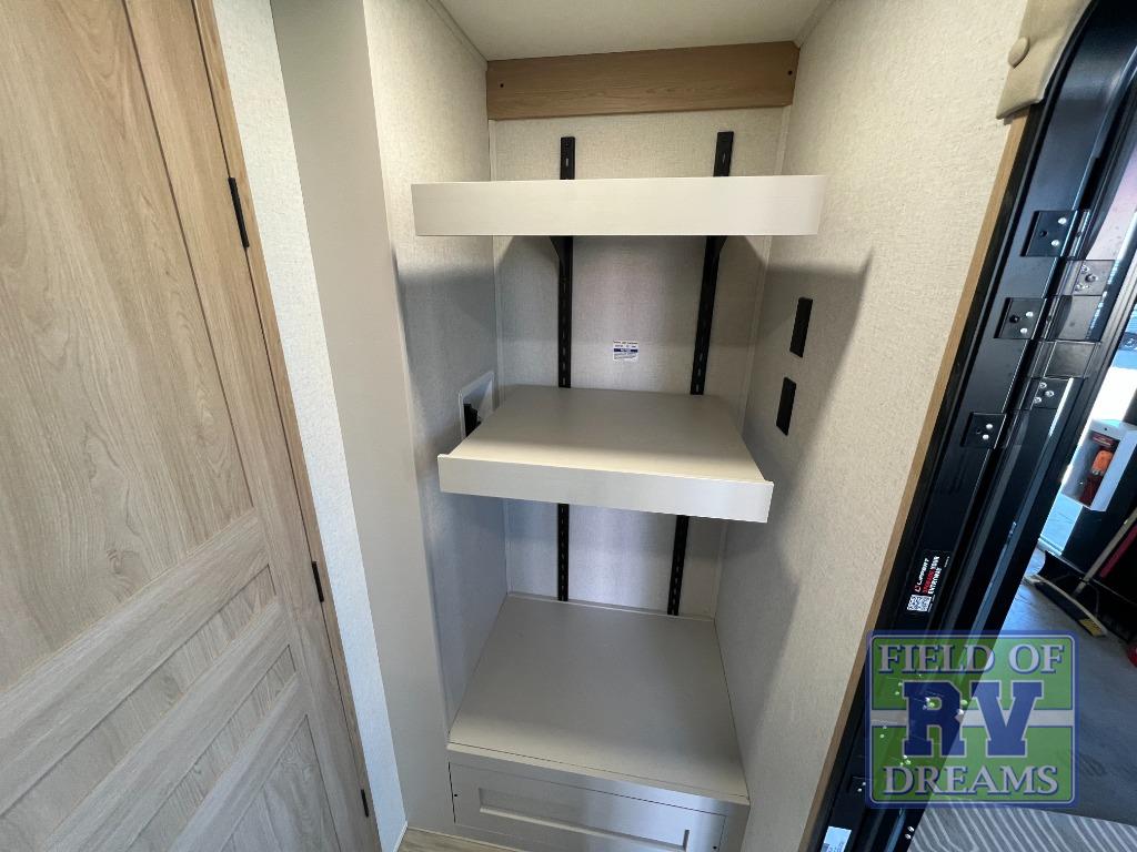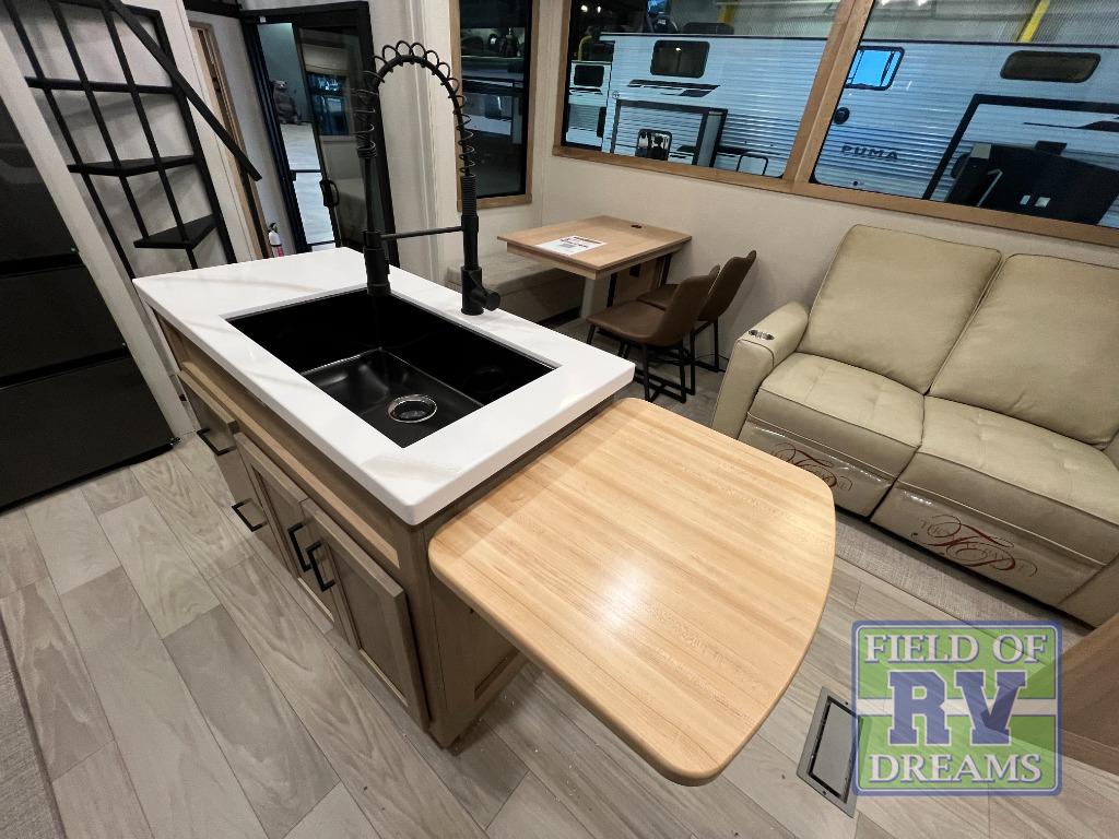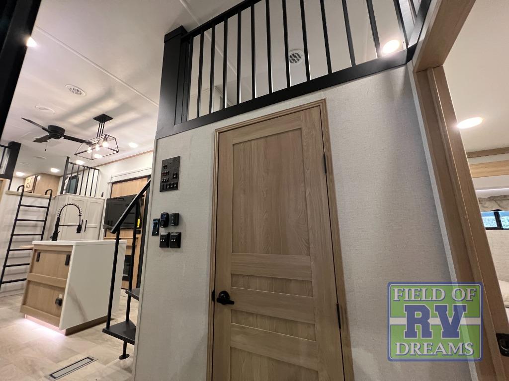 You won't believe the comfort and convenience found in this destination trailer. There are two private bedrooms; one up front with a queen bed slide out and storage space, and one in back with a queen bed slide out and a half bath! There is even washer and dryer prep here if you want to add those appliances and the second entry door is also found in this location so you can easily slip out in the morning. Above each of these rooms is a loft providing three total bunk mats for sleeping, storage cabinets, and TV prep if you want to add entertainment. Everyone can meet in the combined kitchen and living room that includes dual opposing slides, a 60" theater seating across from a 50" flat screen TV and fireplace, plus a free-standing table with chairs and a bench to dine at. The chef of your group will love the large kitchen island, Chef Collection three burner range, and a 16.2 cu. ft. refrigerator for food storage.