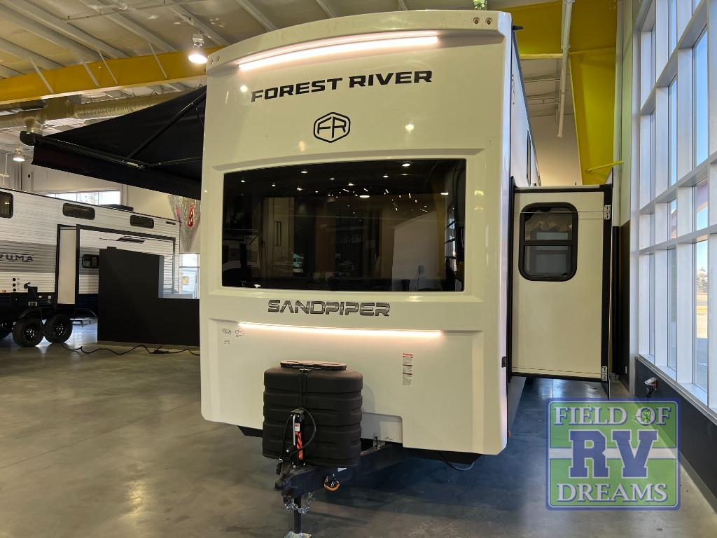 With each Sandpiper Destination Trailer by Forest River you will enjoy many luxurious features, such as crown molding over the kitchen cabinets, solid surface kitchen countertops, a memory foam mattress, plus so much more. The extra large picture windows throughout let natural light in and provide beautiful outdoor views, and each model includes three or more slides for added interior space. You'll find many exterior conveniences, like the porch light with an interior switch, the rain gutters with extra long drip spouts to prevent black streaking, and an electric awning with LED light strip, plus more! You will stay comfortable year around with dual 15,000 A/C units plus each model is constructed with an Underbelly Armor for better protection and insulation!