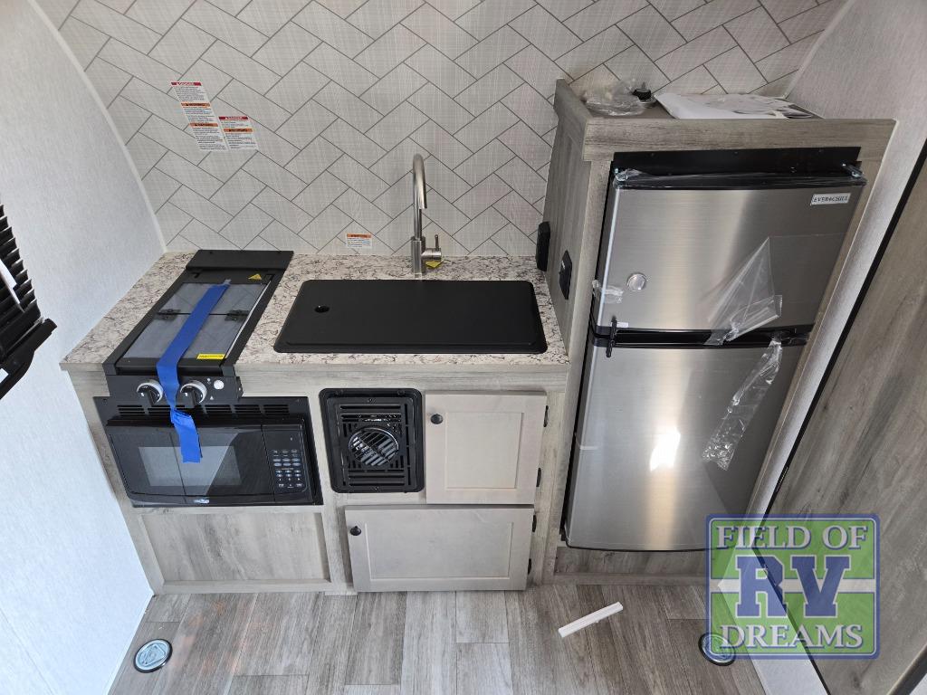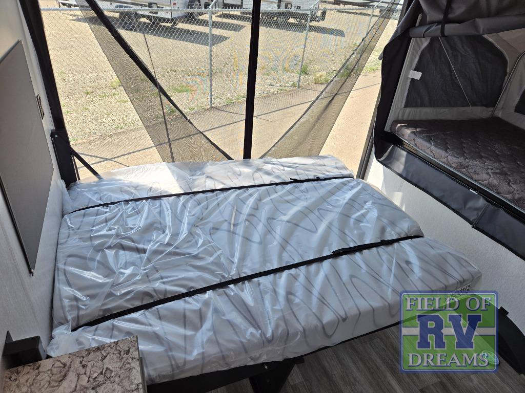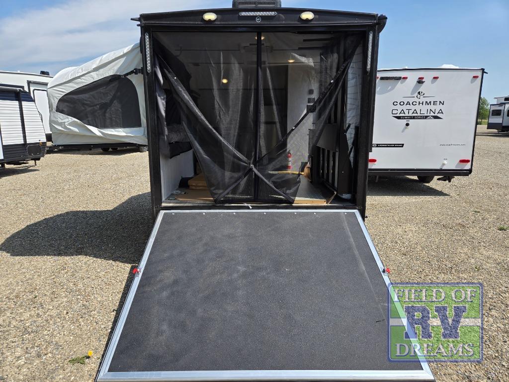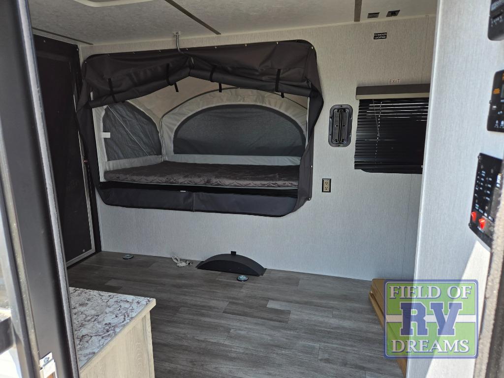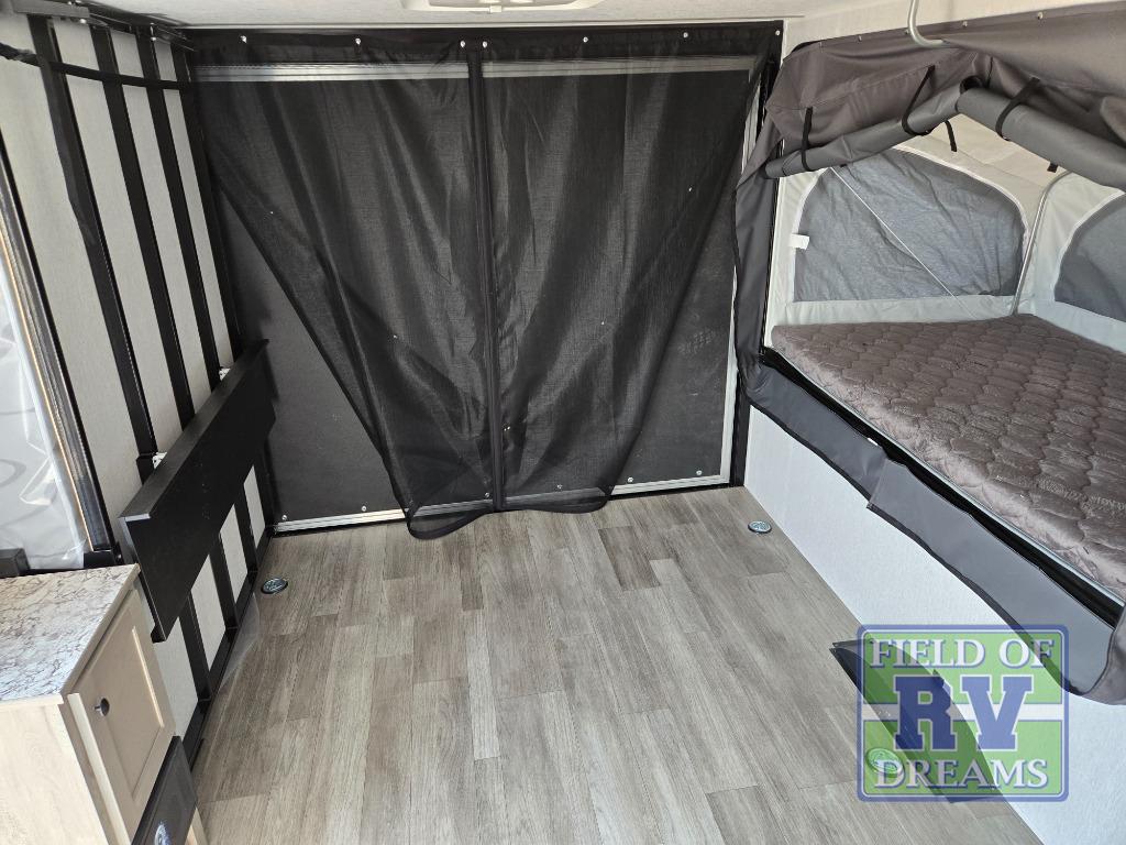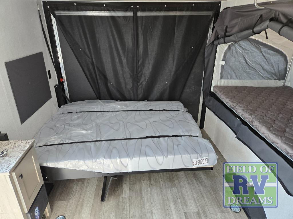 Get ready for a great camping experience where you can take along your favorite ride-on toys, kayaks, or other items that you may not normally have room to load as this toy hauler features a 6' 9" cargo width and 10' 11" cargo length. Once unloaded, set up with the rear bed that will make for a great night's rest. The front of this unit is shared with the wet bath and kitchen. Here, you can make meals on the two burner stove or in the microwave oven, and there is a refrigerator for perishables. And when the optional tent bed is added on this model, you can sleep more campers!