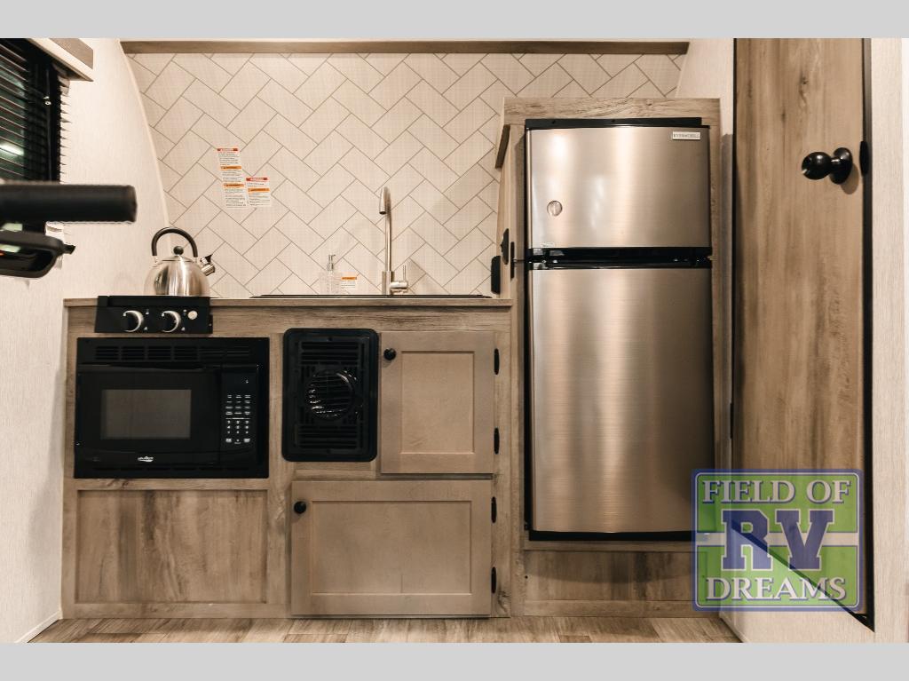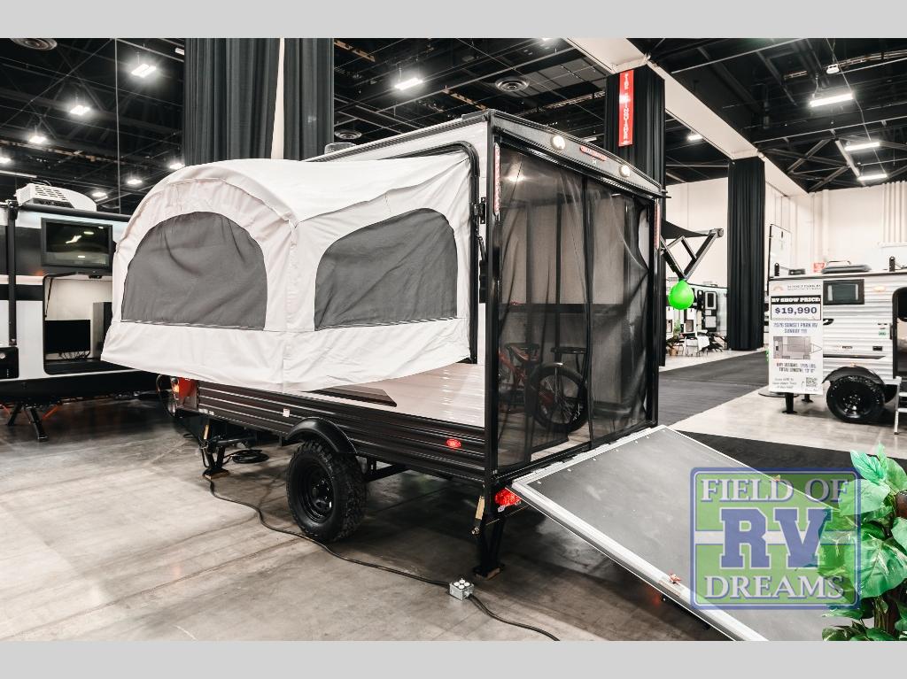 Get ready for a great camping experience where you can take along your favorite ride-on toys, kayaks, or other items that you may not normally have room to load as this toy hauler features a 6' 9" cargo width and 10' 11" cargo length. Once unloaded, set up with the rear bed that will make for a great night's rest. The front of this unit is shared with the wet bath and kitchen. Here, you can make meals on the two burner stove or in the microwave oven, and there is a refrigerator for perishables. And when the optional tent bed is added on this model, you can sleep more campers!