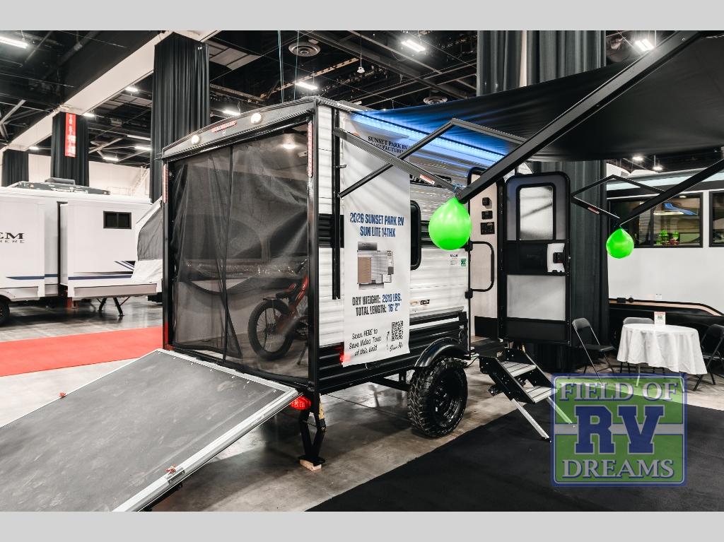 You can trust the build and enjoy your experience with any one of these Sunset Park RV Sun Lite travel trailers or toy haulers! Their aerodynamic profile is not only easy to haul, but also saves on fuel. They are built to withstand years of traveling even though they are lightweight with a diamond plate rock guard, a one piece PVC roof membrane, Dexter Spring-Leaf axles, and tinted safety glass windows. Some comfort standards you are sure to enjoy are the two-burner stove top range with hood, light and fan, plus the refrigerator and microwave, and an outside shower to help keep the dirt outdoors where it belongs.