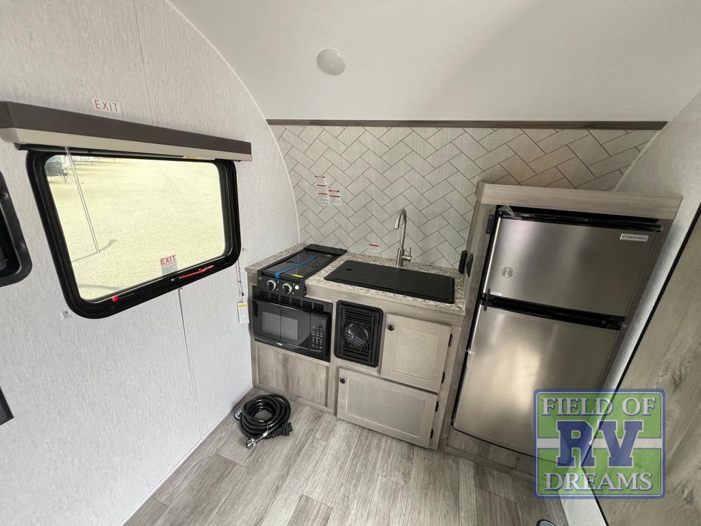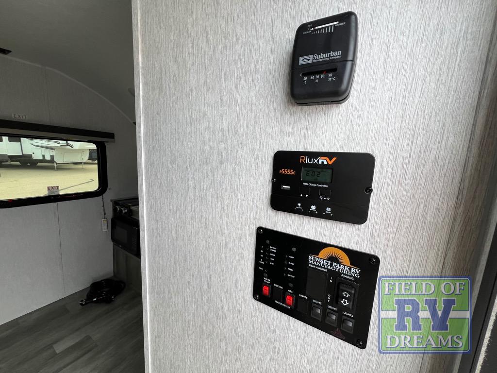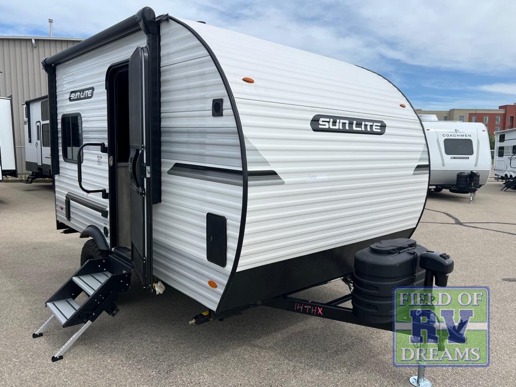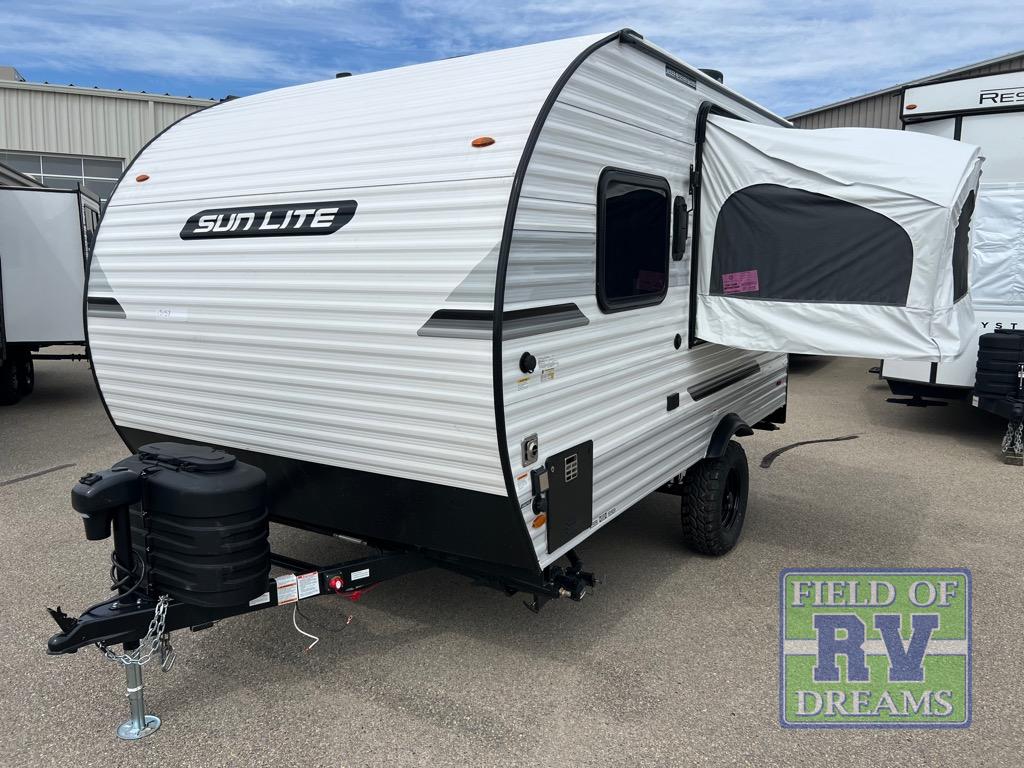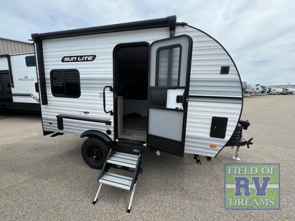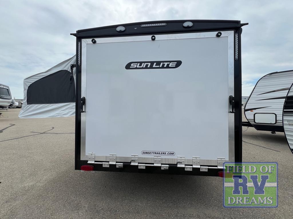 You can trust the build and enjoy your experience with any one of these Sunset Park RV Sun Lite travel trailers or toy haulers! Their aerodynamic profile is not only easy to haul, but also saves on fuel. They are built to withstand years of traveling even though they are lightweight with a diamond plate rock guard, a one piece PVC roof membrane, Dexter Spring-Leaf axles, and tinted safety glass windows. Some comfort standards you are sure to enjoy are the two-burner stove top range with hood, light and fan, plus the refrigerator and microwave, and an outside shower to help keep the dirt outdoors where it belongs.