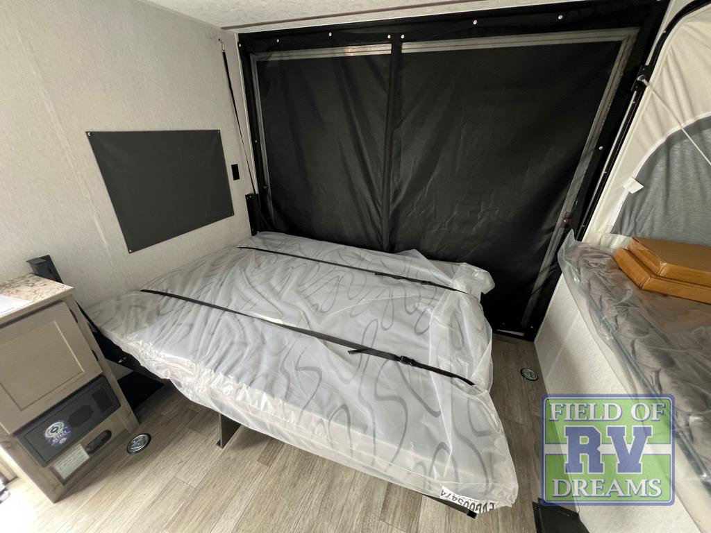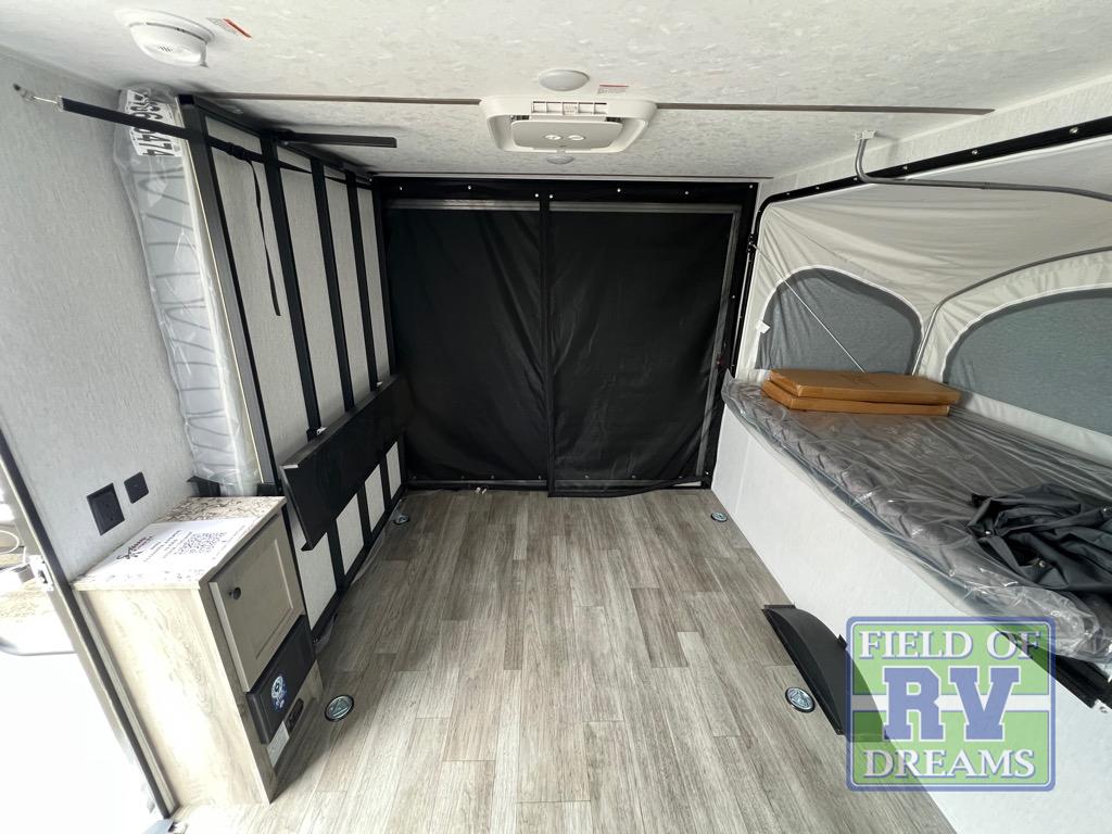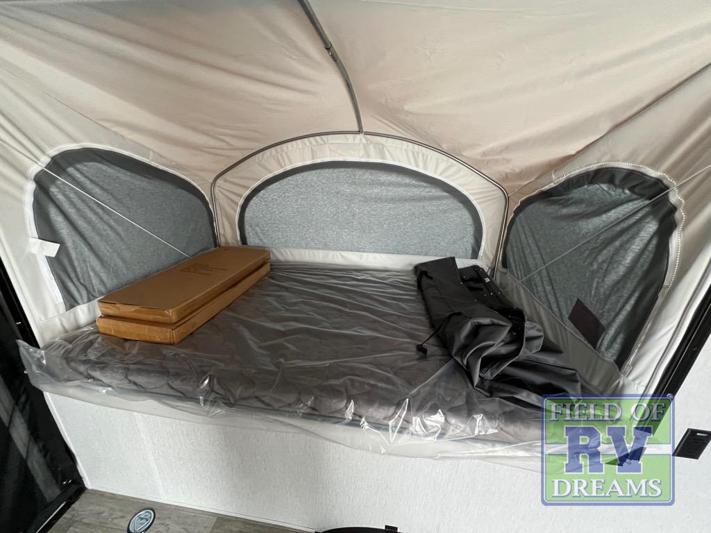 Get ready for a great camping experience where you can take along your favorite ride-on toys, kayaks, or other items that you may not normally have room to load as this toy hauler features a 6' 9" cargo width and 10' 11" cargo length. Once unloaded, set up with the rear bed that will make for a great night's rest. The front of this unit is shared with the wet bath and kitchen. Here, you can make meals on the two burner stove or in the microwave oven, and there is a refrigerator for perishables. And when the optional tent bed is added on this model, you can sleep more campers!