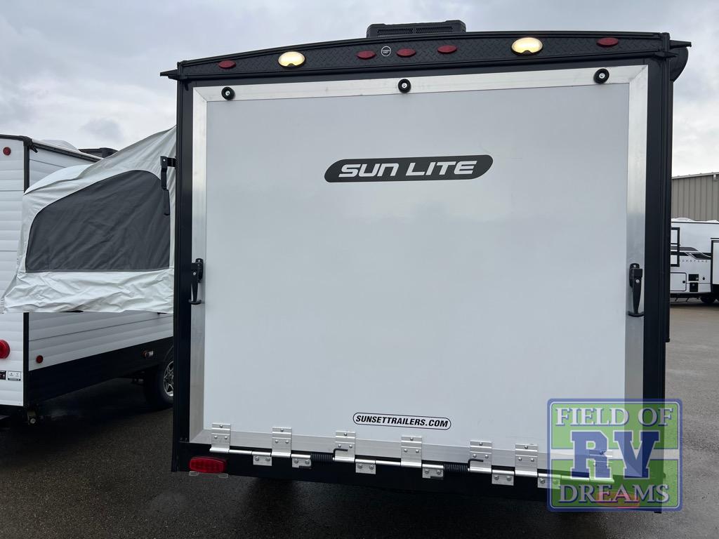 You can trust the build and enjoy your experience with any one of these Sunset Park RV Sun Lite travel trailers or toy haulers! Their aerodynamic profile is not only easy to haul, but also saves on fuel. They are built to withstand years of traveling even though they are lightweight with a diamond plate rock guard, a one piece PVC roof membrane, Dexter Spring-Leaf axles, and tinted safety glass windows. Some comfort standards you are sure to enjoy are the two-burner stove top range with hood, light and fan, plus the refrigerator and microwave, and an outside shower to help keep the dirt outdoors where it belongs.