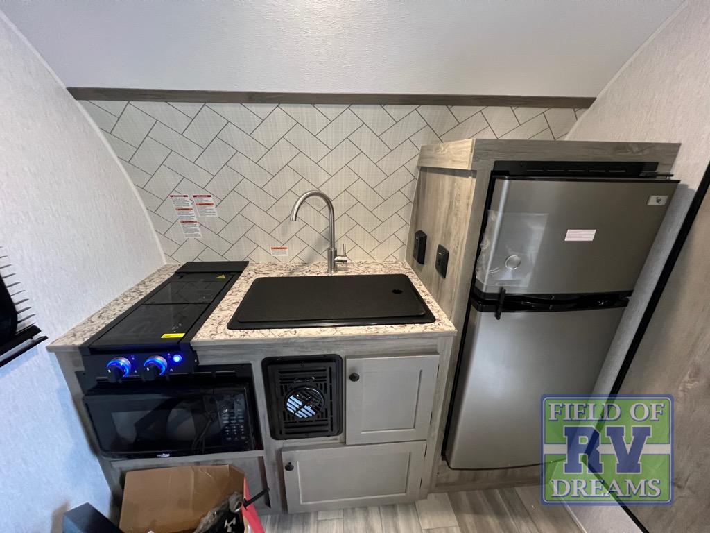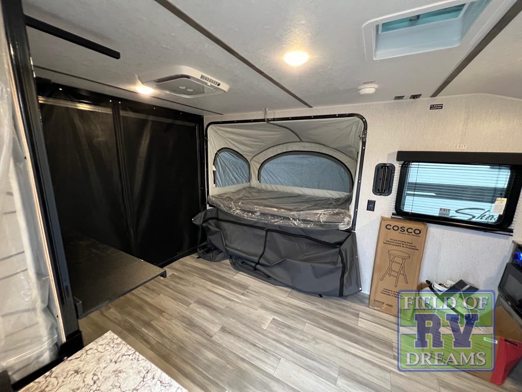 Get ready for a great camping experience where you can take along your favorite ride-on toys, kayaks, or other items that you may not normally have room to load as this toy hauler features a 6' 9" cargo width and 10' 11" cargo length. Once unloaded, set up with the rear bed that will make for a great night's rest. The front of this unit is shared with the wet bath and kitchen. Here, you can make meals on the two burner stove or in the microwave oven, and there is a refrigerator for perishables. And when the optional tent bed is added on this model, you can sleep more campers!