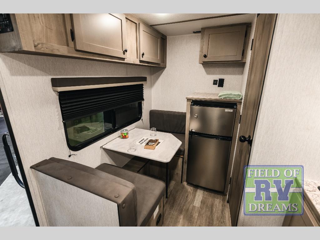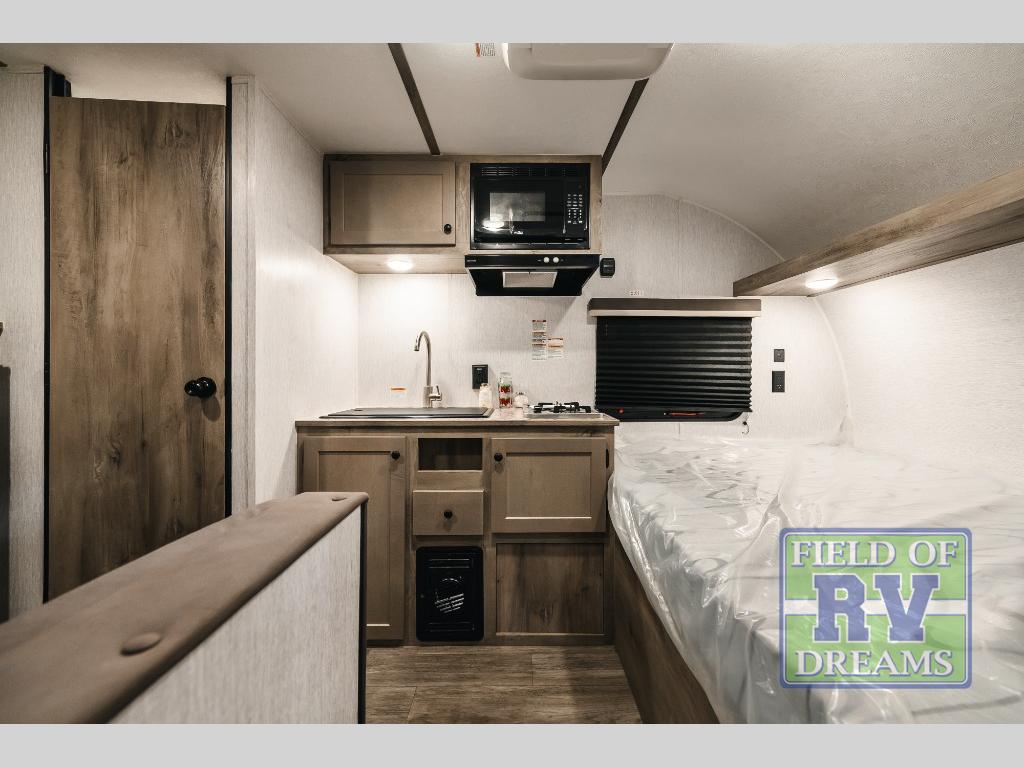 This lightweight travel trailer is perfect for two to three campers each night! You will sleep soundly on the front 54" x 74" bed with an overhead shelf and a closet for your things. Whip up eggs and bacon on the two burner cooktop in the morning, then dine at the 30" booth dinette. This can also double as sleeping space for an overnight guest or two little ones! The private bath with a 24" x 32" shower and a toilet will let you freshen up each day, and the double sink in the kitchen provides a place to wash your hands and teeth at night. You will also appreciate having a 4.3 cu. ft. 12V refrigerator to keep your food fresh and a 5K BTU wall A/C to keep you comfortable all summer long!