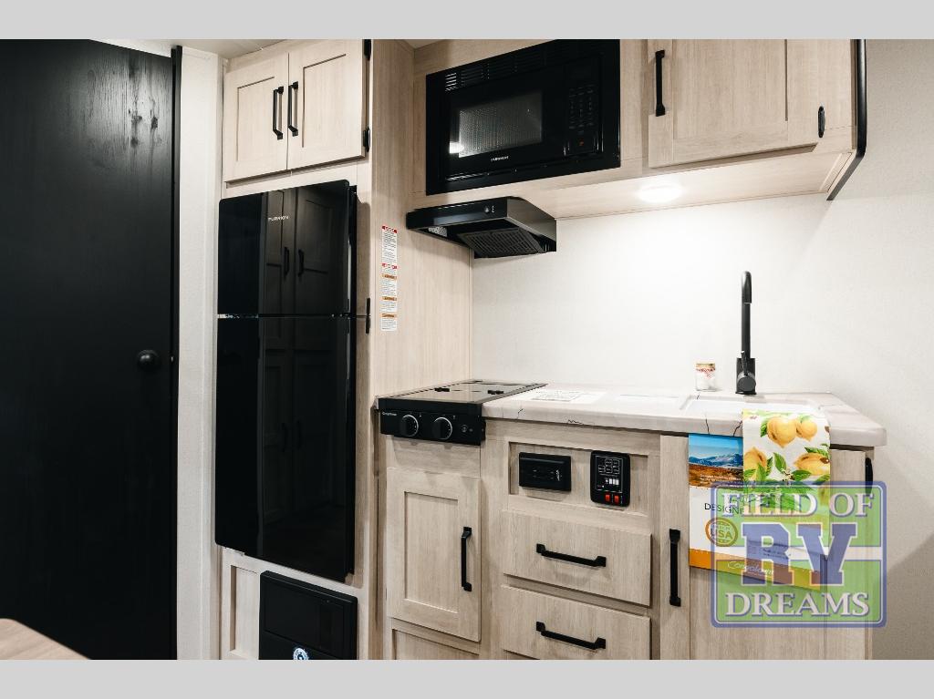 This lightweight travel trailer is perfect for two to three campers each night! You will sleep soundly on the front 54" x 74" bed with an overhead shelf and a closet for your things. Whip up eggs and bacon on the two burner cooktop in the morning, then dine at the 30" booth dinette. This can also double as sleeping space for an overnight guest or two little ones! The private bath with a 24" x 32" shower and a toilet will let you freshen up each day, and the double sink in the kitchen provides a place to wash your hands and teeth at night. You will also appreciate having a 4.3 cu. ft. 12V refrigerator to keep your food fresh and a 5K BTU wall A/C to keep you comfortable all summer long!