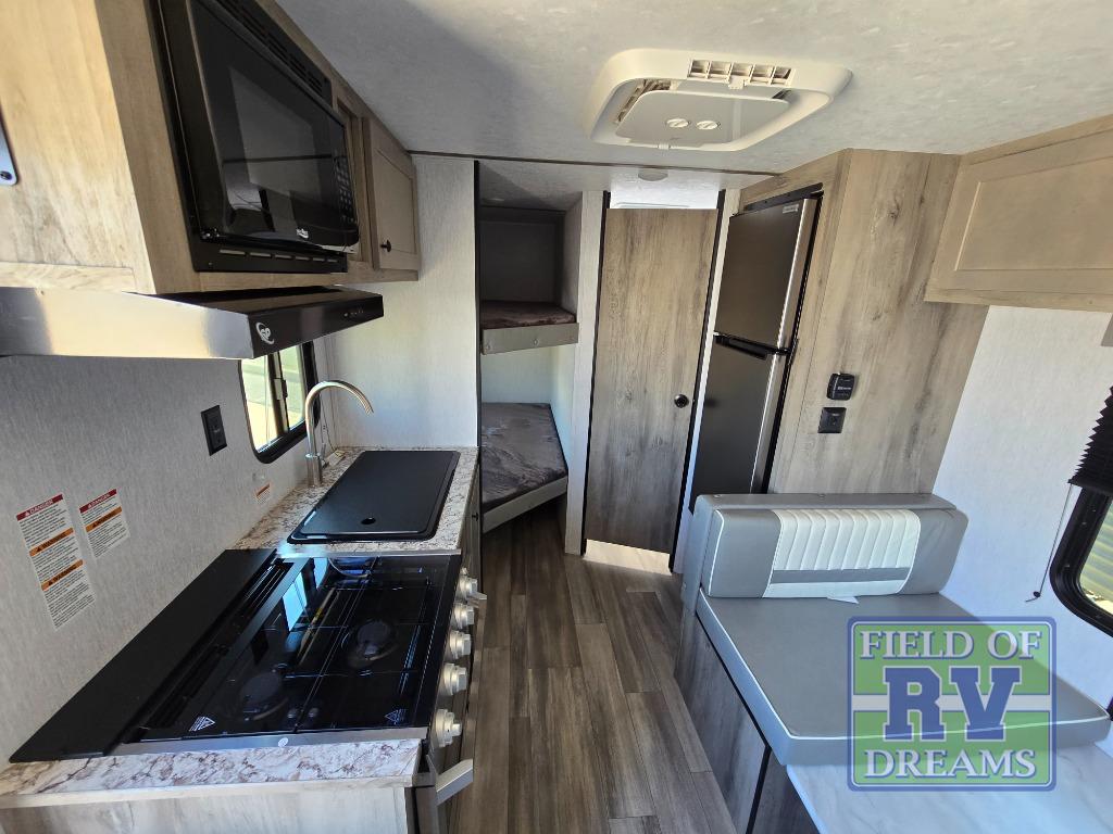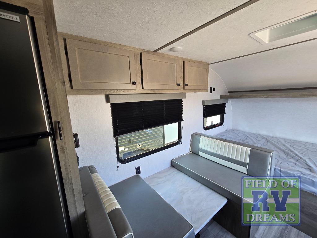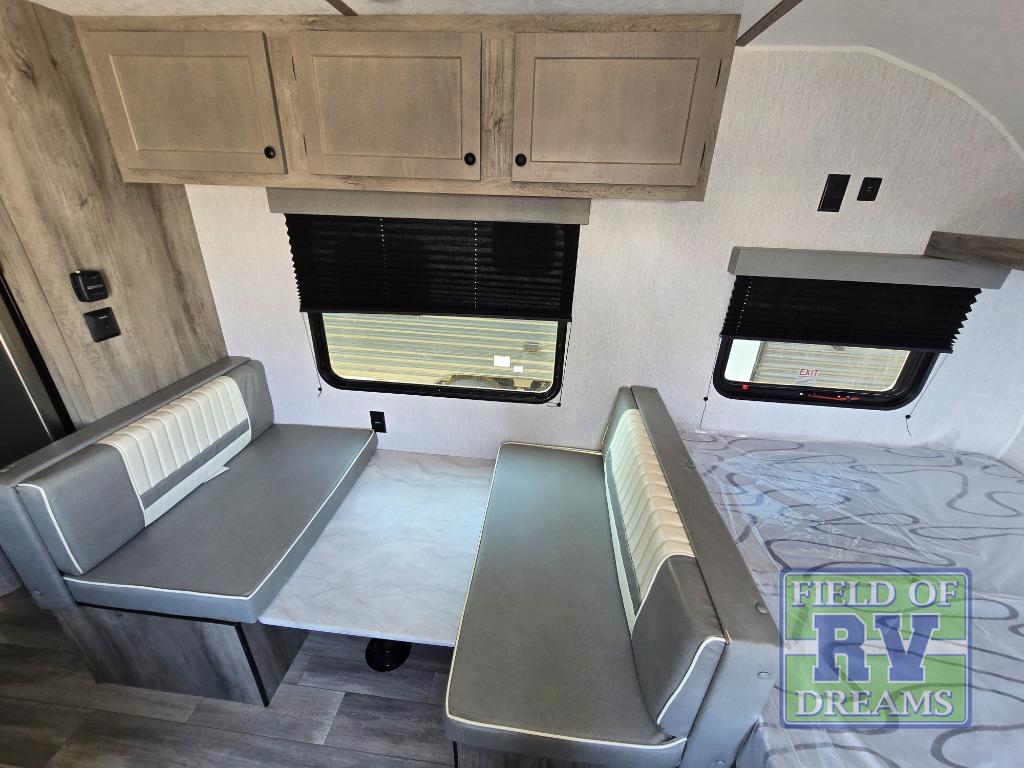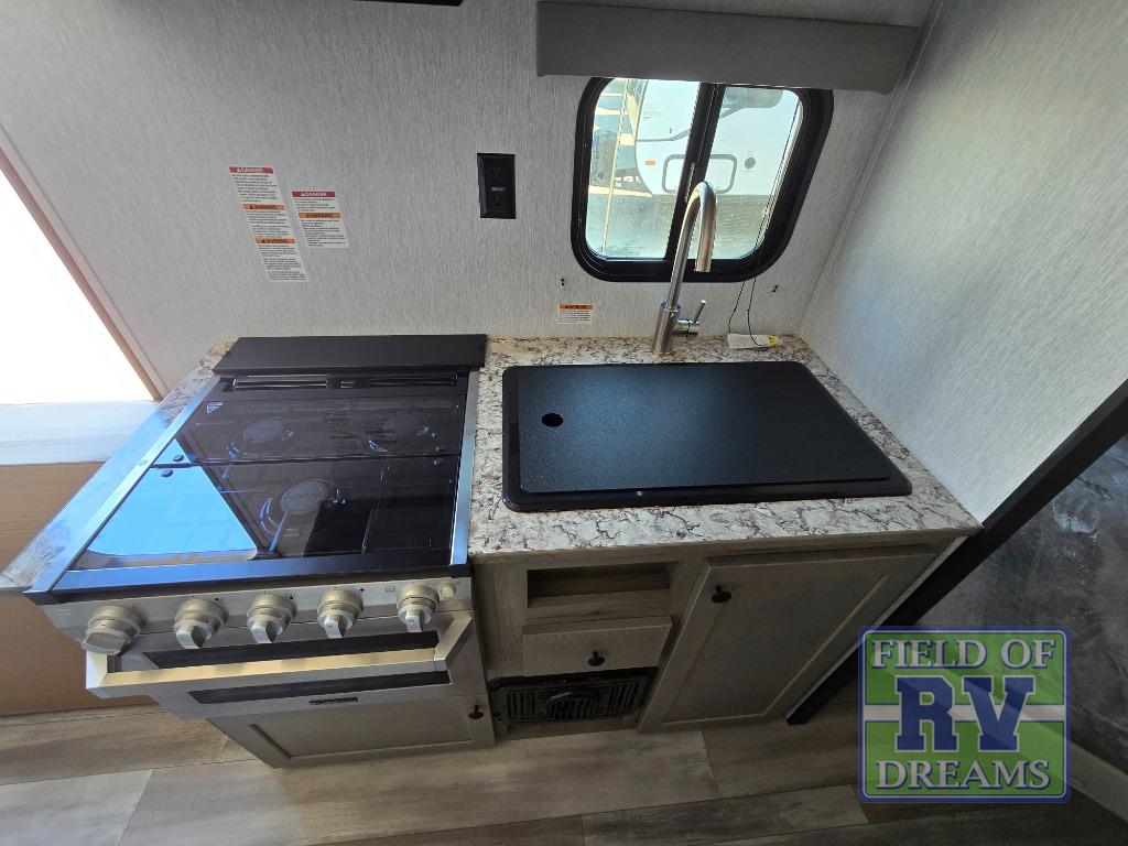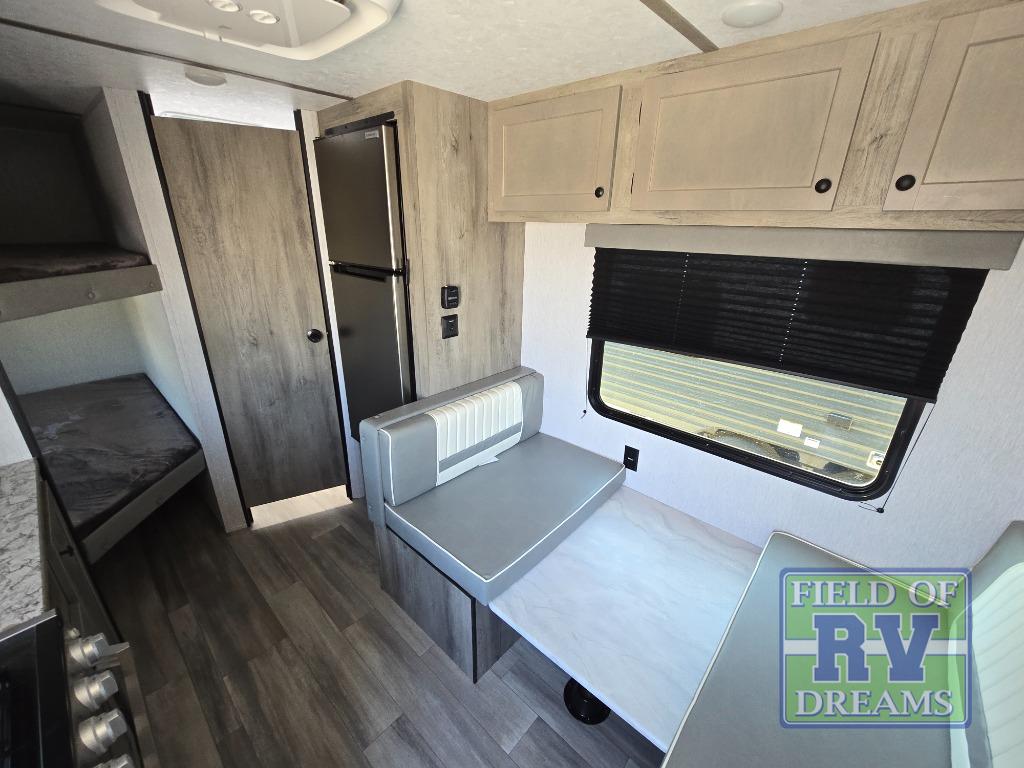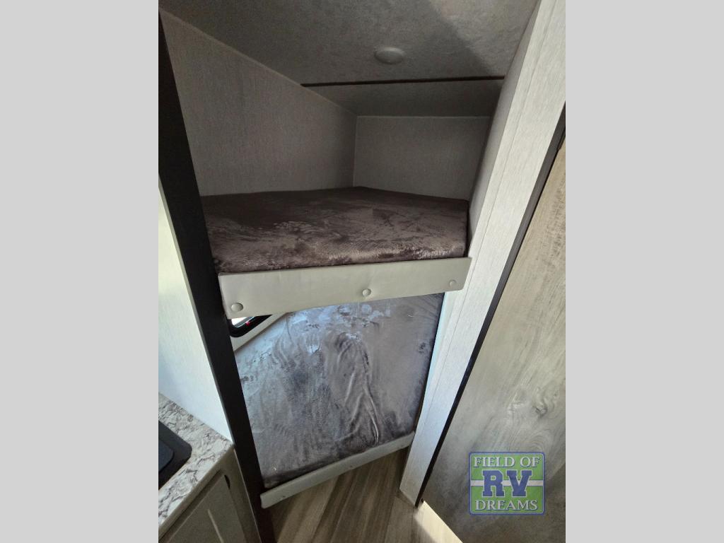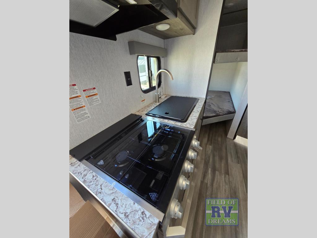 The perfect family-friendly travel trailer is found with this Sun Lite LTD model. You can take the front bed each night, while your guests or little ones take the double-size bunks towards the back. And if you're not needing the additional sleeping space, you can choose the desk option in place of the bunks. There is also a full bath right next to the bunks for easy nighttime use. The chef of your group can make meals using the three burner cooktop, and there is a double bowl sink for easy clean up. Once dinner has been cleaned up, you can play a game at the booth dinette, or head outdoors for an evening walk around the campground!