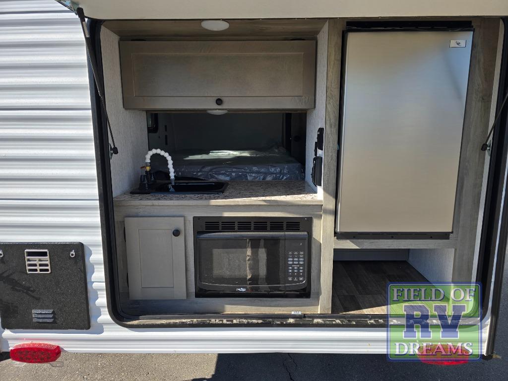 This Sunray travel trailer with its 12' length and 1,320-LB dry weight, is simple to navigate. You have most of the basic essentials without needing to tow all of the extra weight. There is an outdoor kitchen that comes with a two-burner stove top, a refrigerator, and a microwave so that you can cook dinner without having to start a fire. You will have an outside shower that you can use for various purposes, like rinsing off your equipment, filling a bucket with water, or hosing down your muddy puppy, and there are USB ports and a Winegard HDTV antenna to keep you modern.