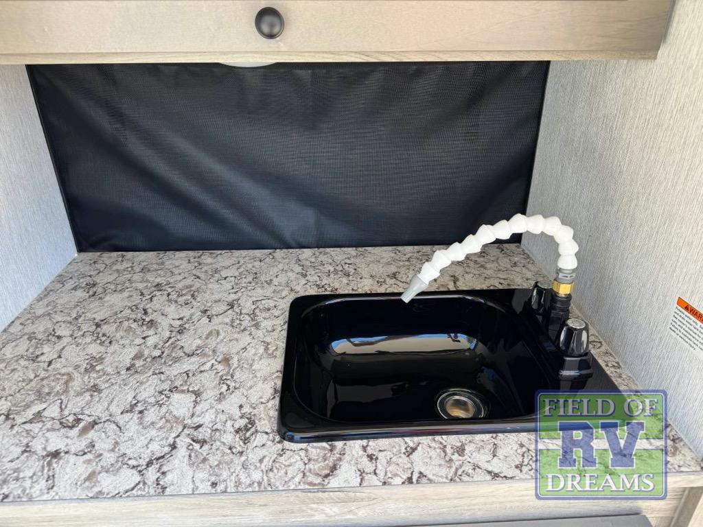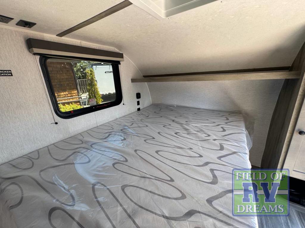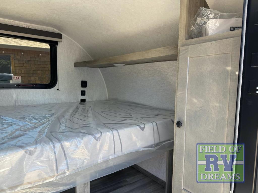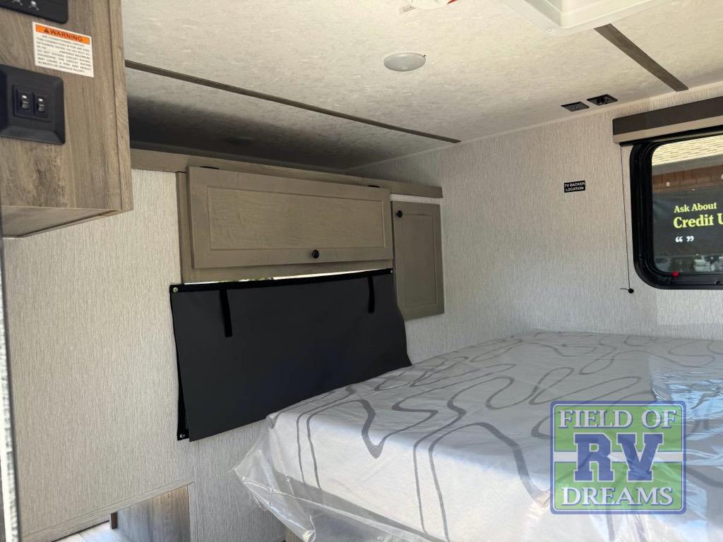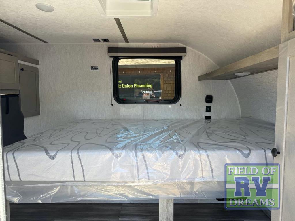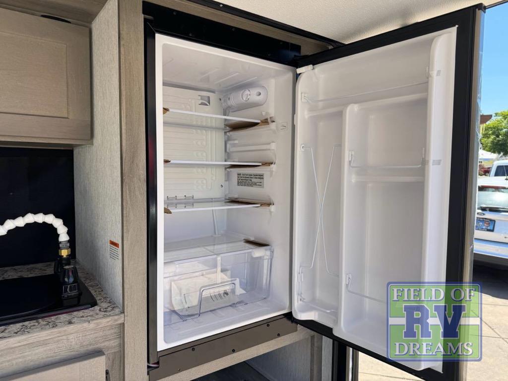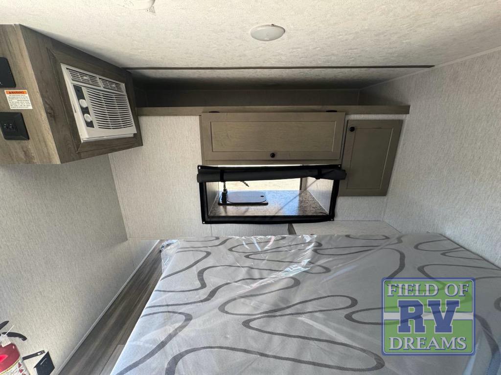 This unit is ideal for travelers seeking maneuverability and ease of towing without compromising on essential comforts. The rear closet provides convenient storage for clothing and personal items, keeping your belongings organized, and the bed assembly creates a cozy sleeping space, perfect for restful nights on the road. Practical storage and organization can be found in the front closet, which offers additional storage for travel essentials and personal belongings, while the front shelf delivers handy space for items you want within easy reach, enhancing convenience. Further, the A/C cabinet provides specialized storage for your air conditioning unit, ensuring efficient integration and protection. Convenience is met in the outdoor kitchen, which features a refrigerator, overhead cabinets, and a two-burner cooktop, providing versatile cooking options for preparing delicious meals outdoors.