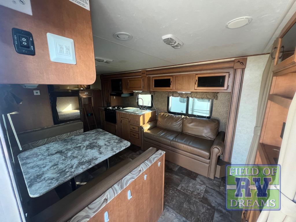 The large slide in the living area opens up the interior and provides a spacious at-home feel. On one side there is a slide-out that includes a sofa, a double kitchen sink, 3 burner range with microwave oven and pantry. Opposite the slide is a booth dinette for meal time, a refrigerator, and a wardrobe just outside the rear corner bath.