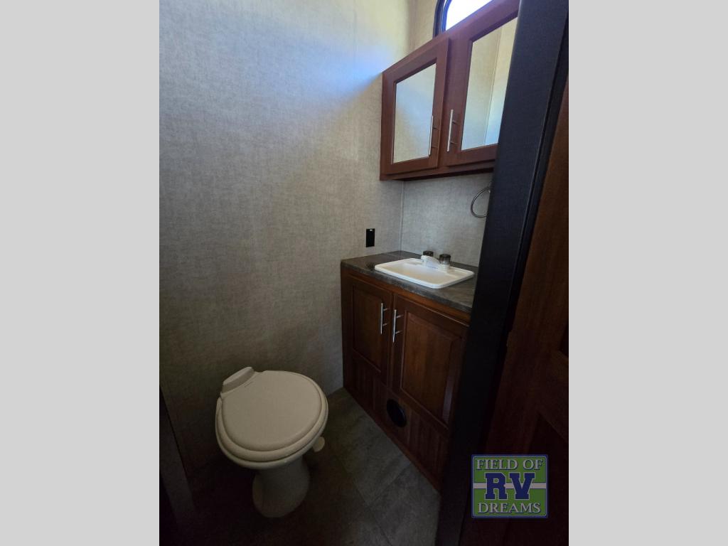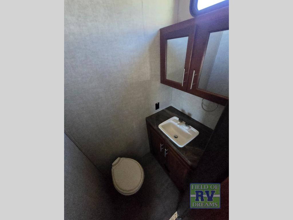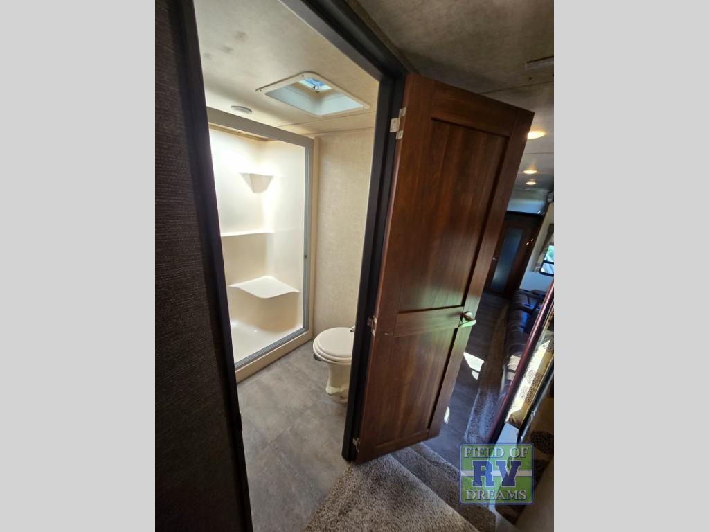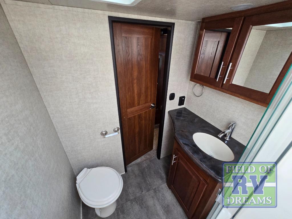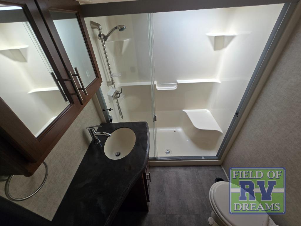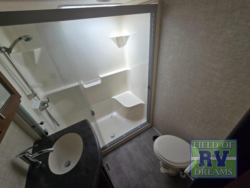 Step up to a bath with separate steps, plus you can also access it using the 2nd set of steps in through the front bedroom. The bath features a residential shower, toilet and sink.