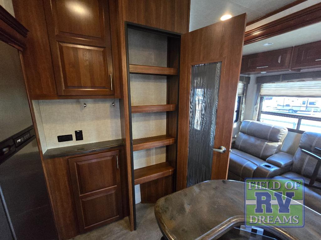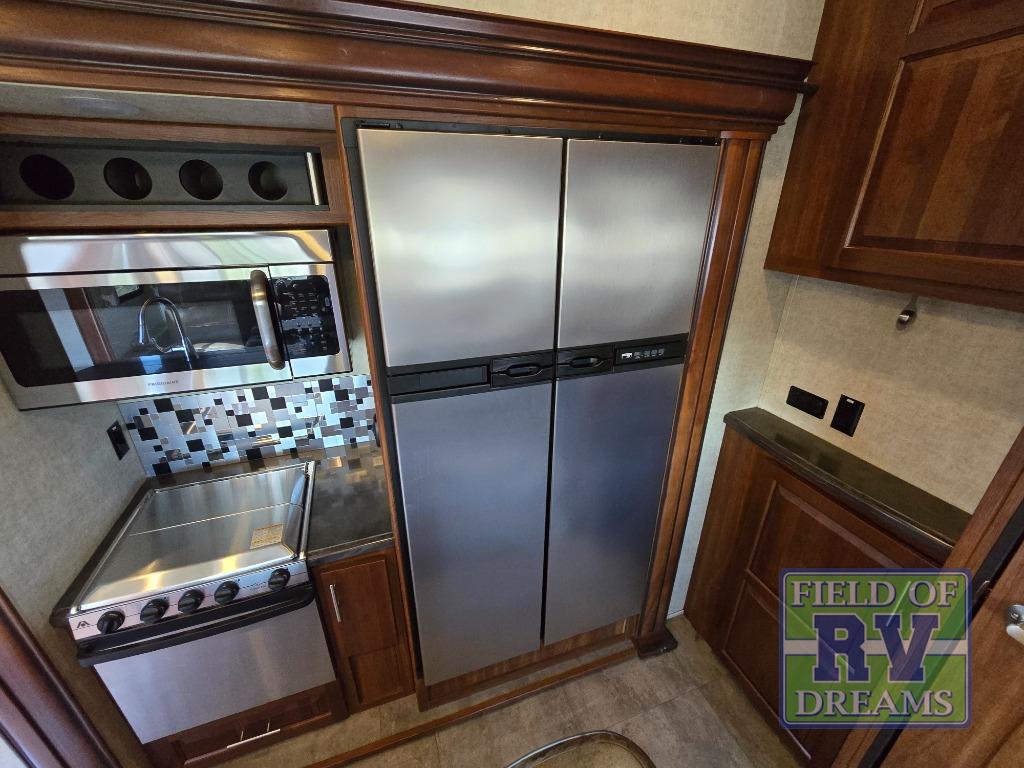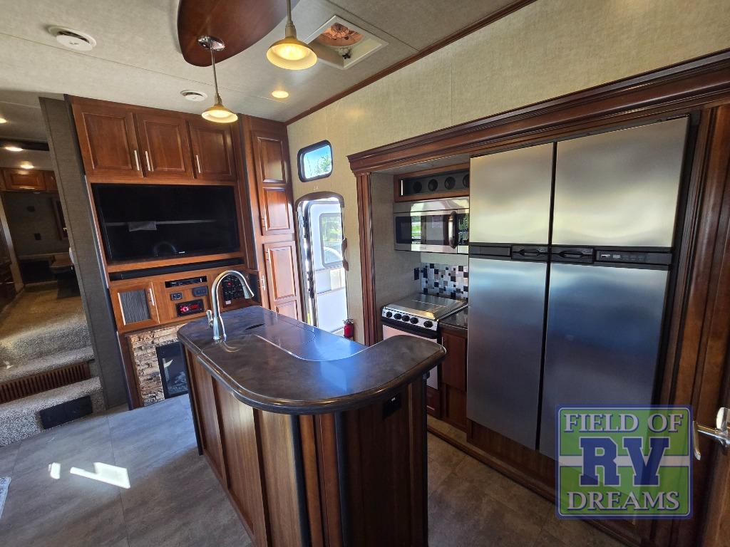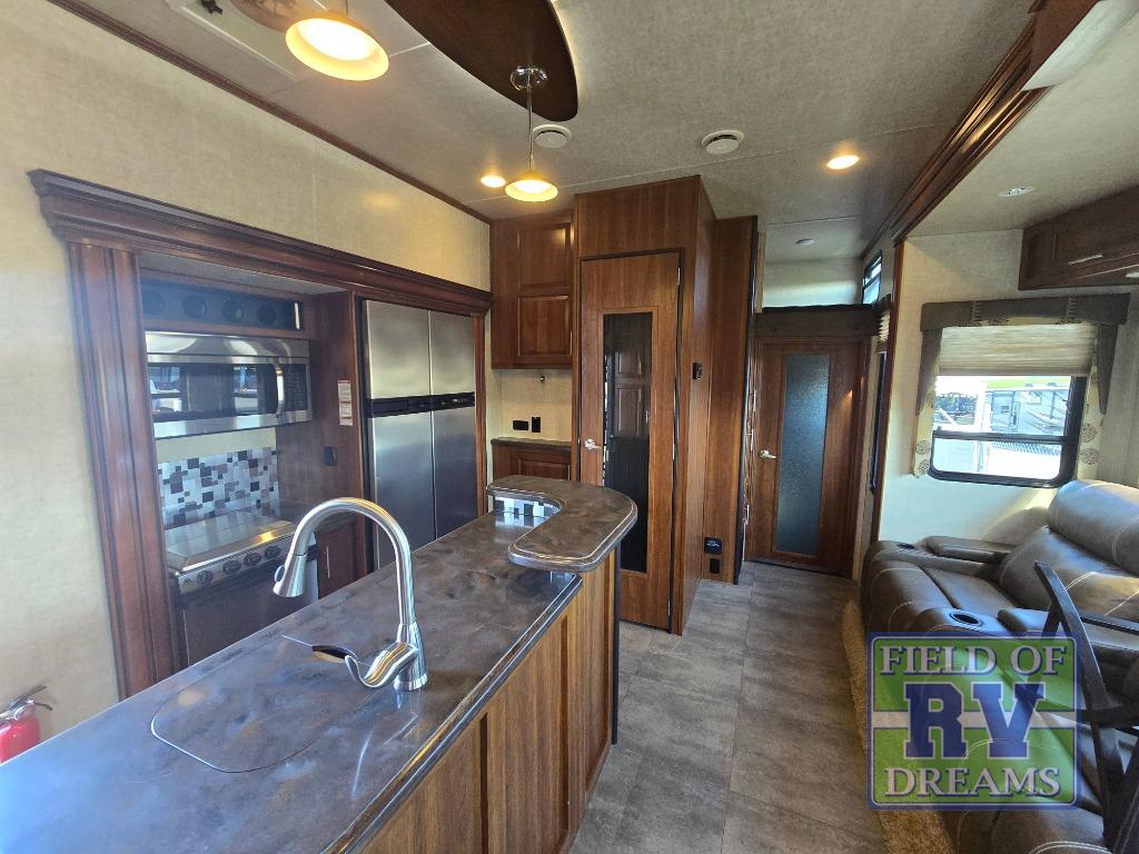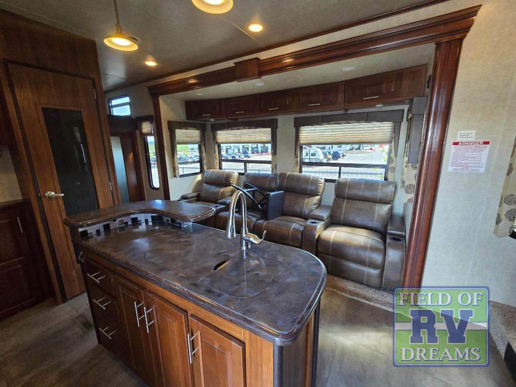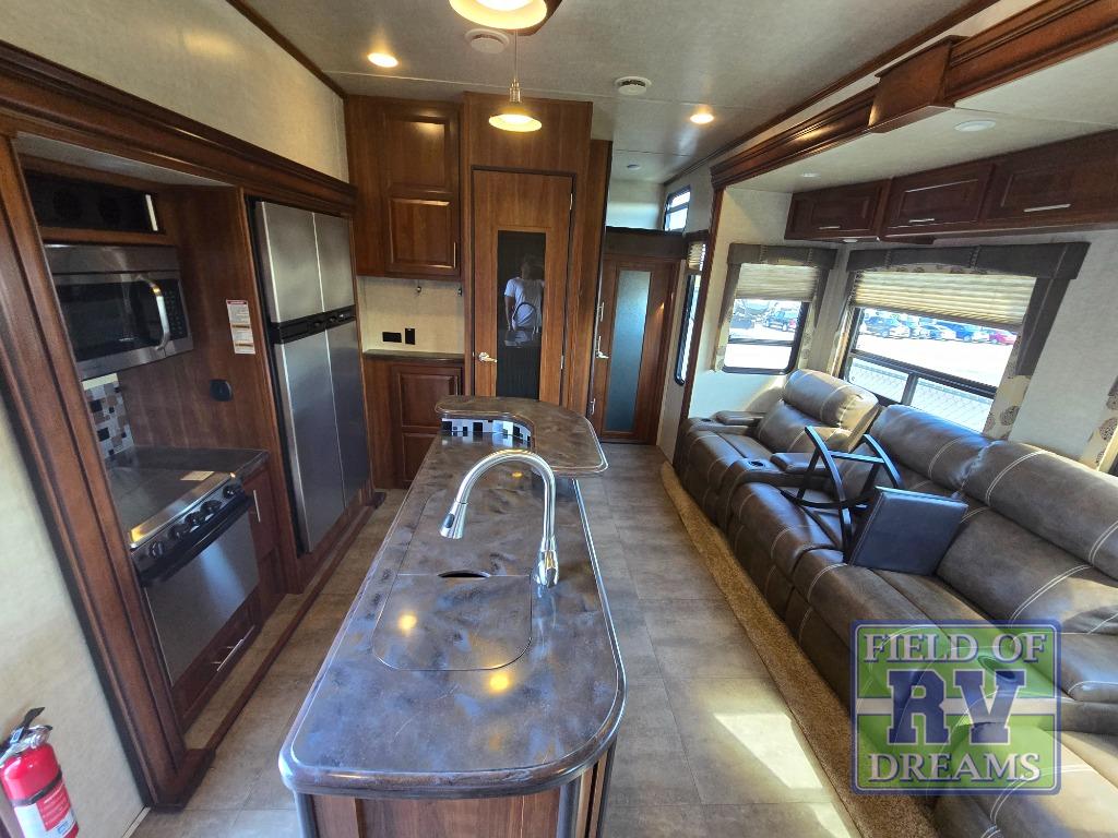 Head through the door to the interior of the fifth wheel from the cargo space, or the second side man door. You will see a combined living and kitchen area with a large theater seating slide large enough to fit four people comfortably. There is an island with raised side bar top and two stools, plus it is the location for the double kitchen sink. There is also a 12 cu. ft. refrigerator and 3 burner range slide to make cooking and food prep a cinch.