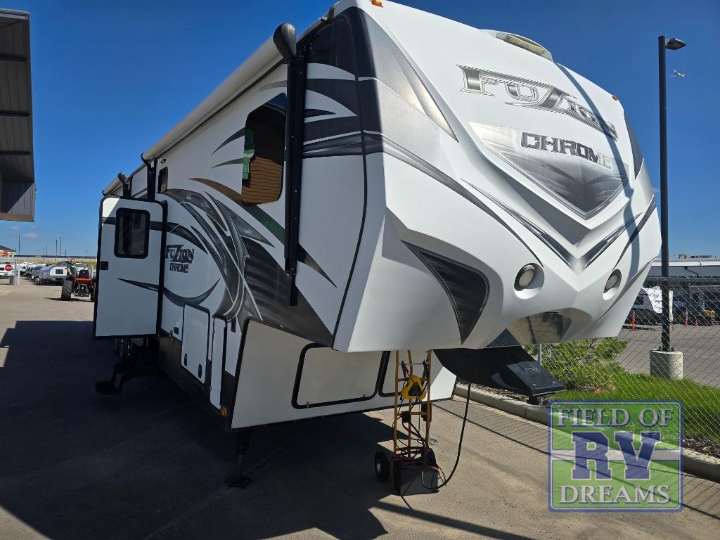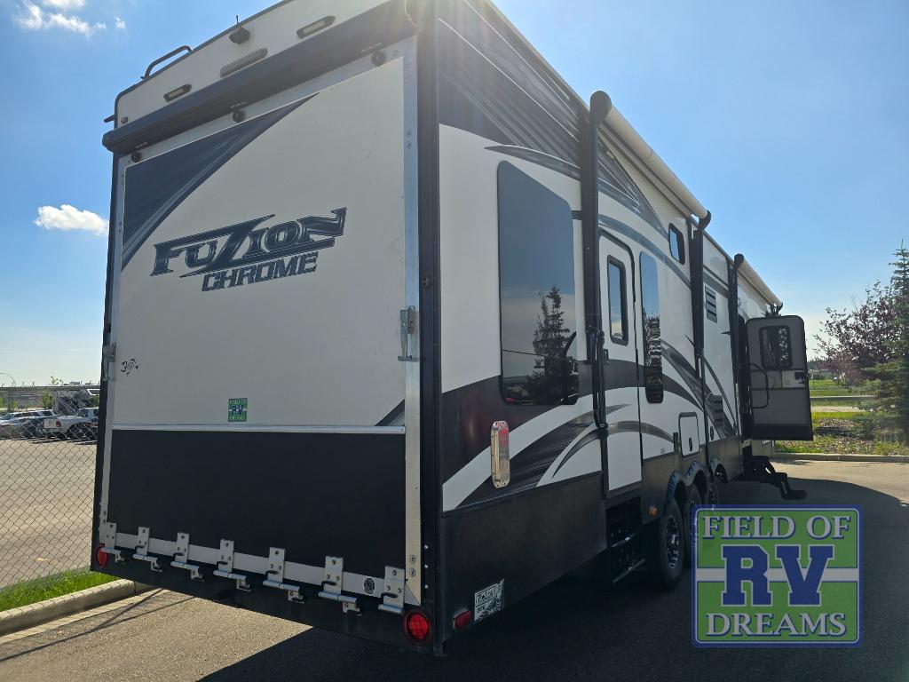 This Fuzion Chrome fifth wheel toy hauler model 390 has everything you need and more to take your fun up a notch or two! With a 12' garage, one and a half baths, a fireplace and more, you can't help but have a great time when away from home.