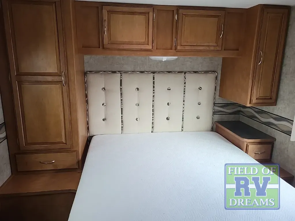 Model 27Q offers a rear bedroom with queen size bed including a nightstand and wardrobe. There is also an overhead cabinet for more storage. A folding door can be closed to provide more privacy at night if you like.