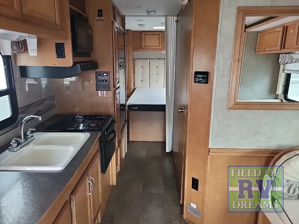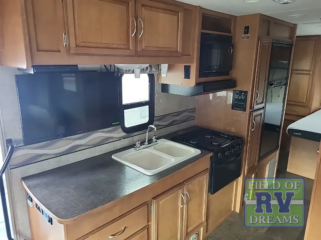 Up front there is an overhead bunk above the cab seats that is 57" x 95". The kids will enjoy sleeping up top and there is also a space for an optional 32" HDTV w/DVD player and remote above the counter area near the double kitchen sink, plus so much more!