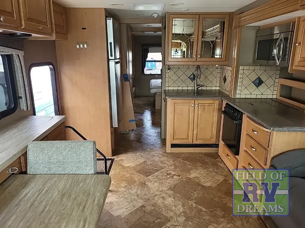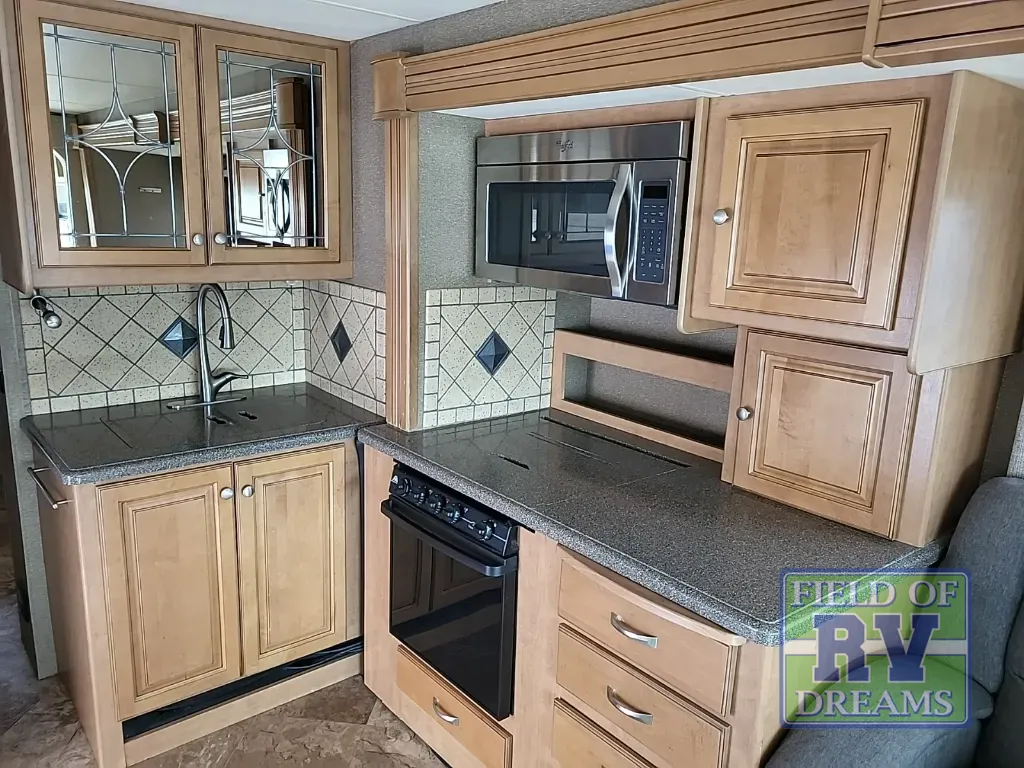 As you enter you will find a slide out including theater seating for two, countertop extension, appliance garage, spice rack, microwave oven, and a three burner range. You can choose an optional sofa with air bed in place of the theater seating which would allow more sleeping area. The kitchen sink is on the interior wall. Across from this space is a pantry, a residential refrigerator, buffet dinette with extension and four chairs, plus a retractable 40" LED TV. Over the cab is an extra sleeping space your guests will enjoy. The drop-down overhead bunk measurements are 54" x 74".