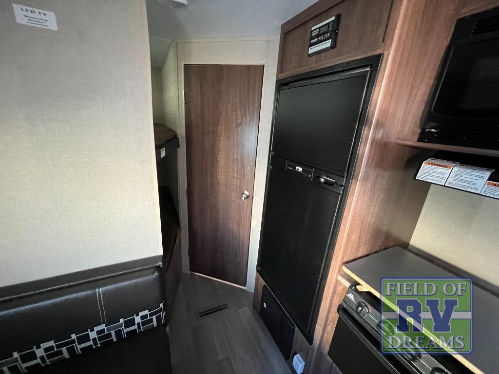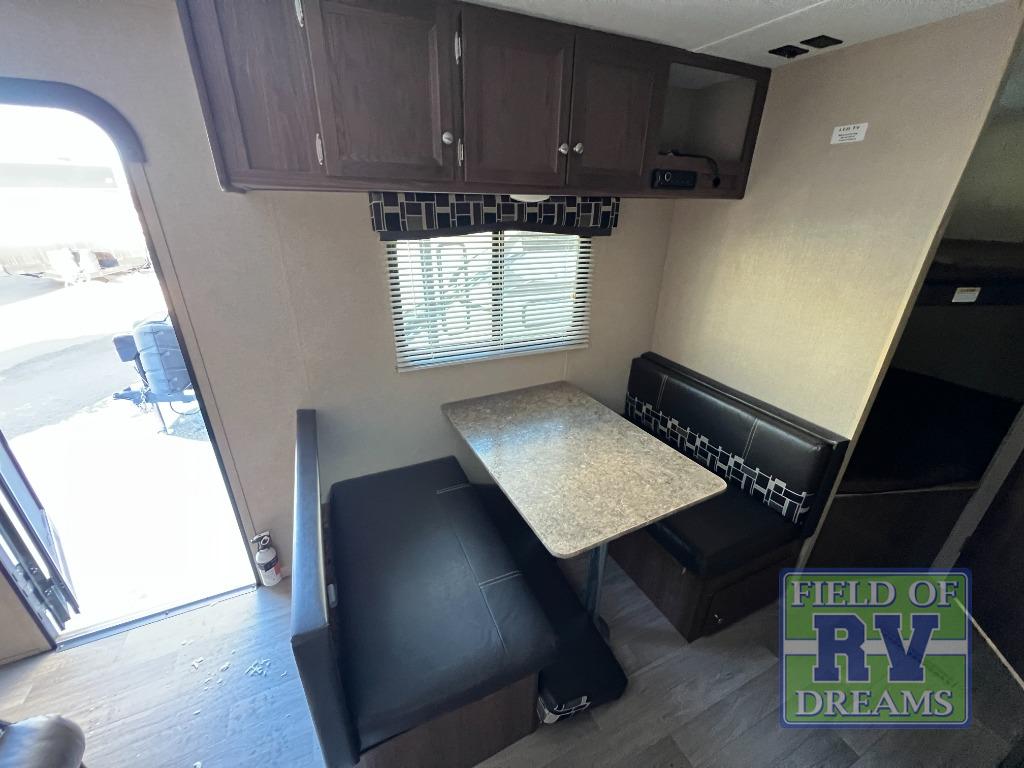 To the left as you enter find a booth dinette with storage above, plus there are satellite and cable hook-ups just above the side of the dinette along the wall that separates the living area from the double bed set of bunks in back.