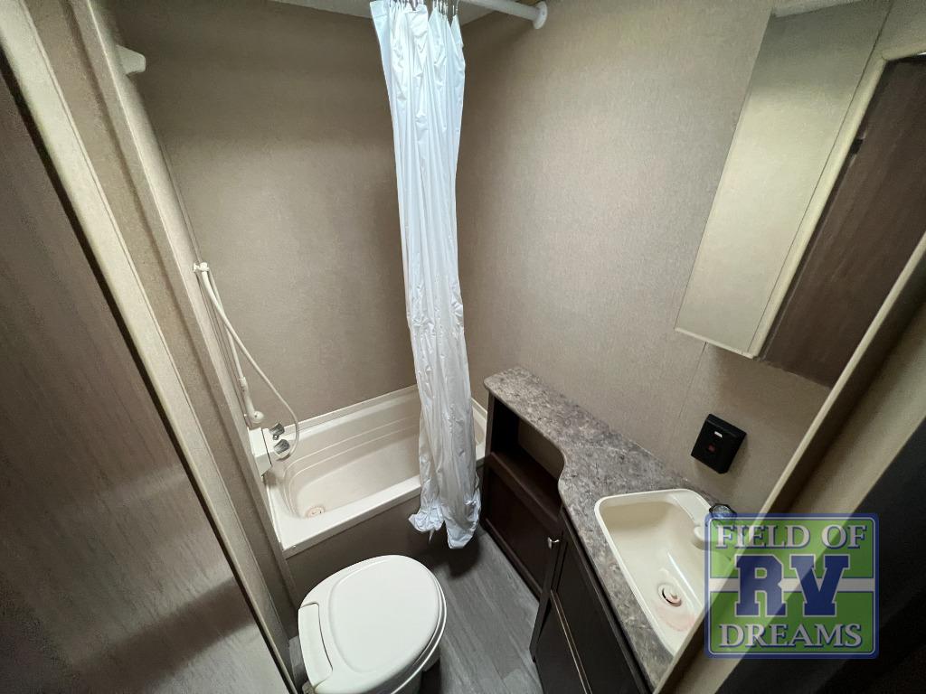 In the rear right corner enjoy the convenience of a complete bath with shower, toilet, and vanity with sink including overhead storage.