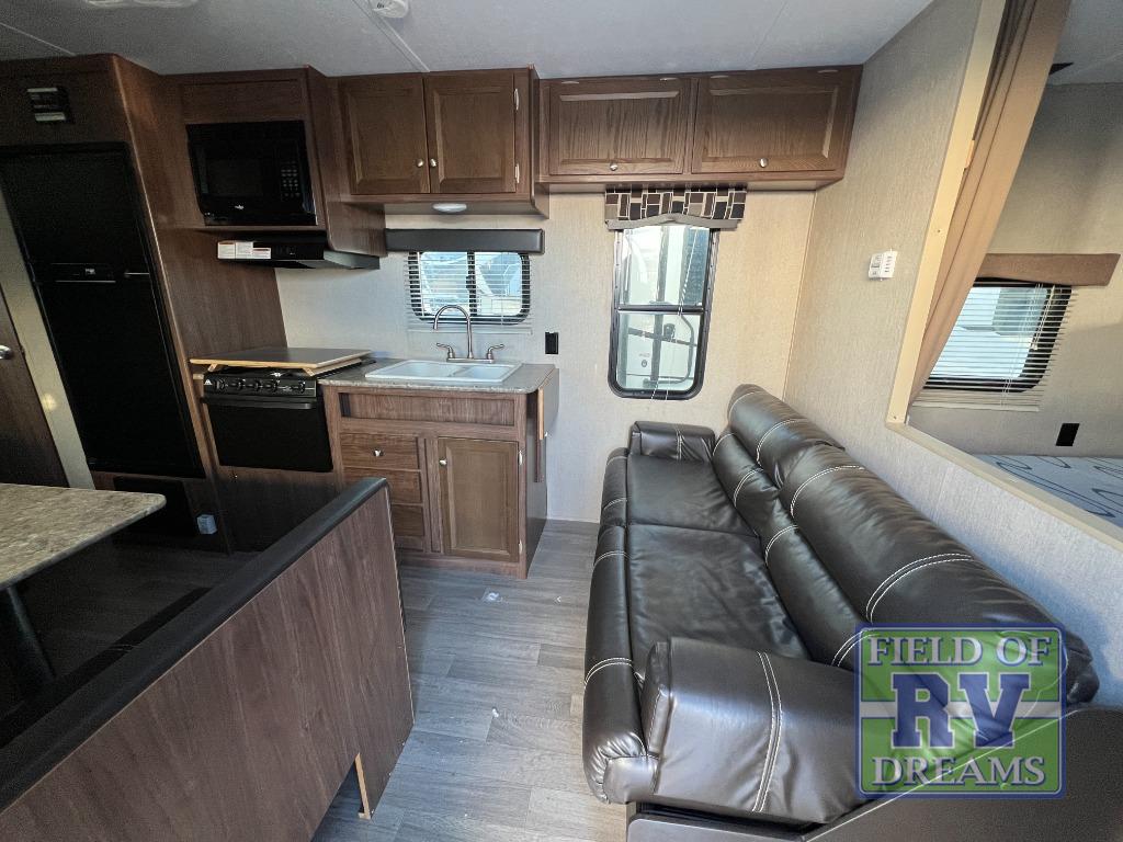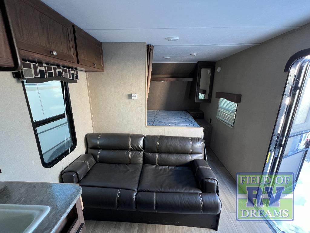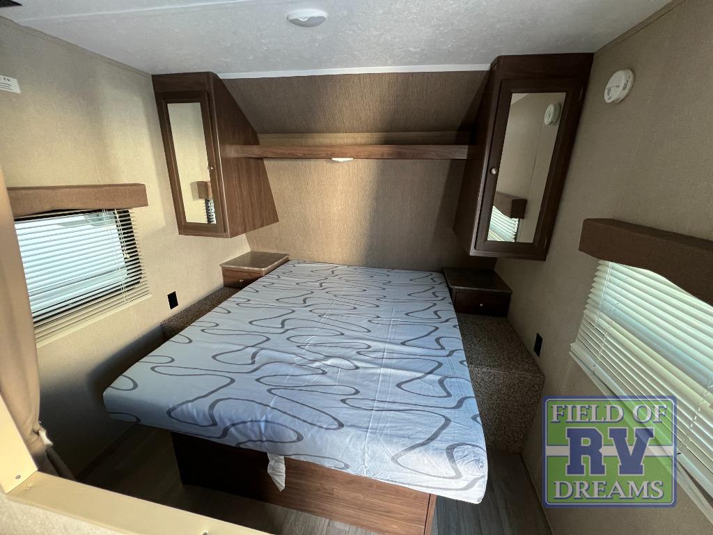 Step inside and notice the jack-knife sofa straight ahead with overhead cabinets along the side. The sofa divides the space and separates the living area from the front master bedroom where you will find a queen sized bed with dual nightstands and shirt closet, plus overhead shelf.