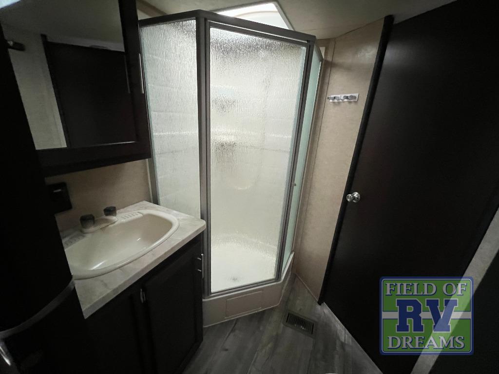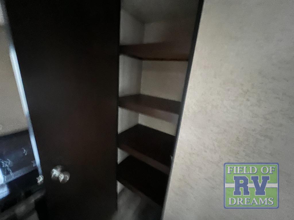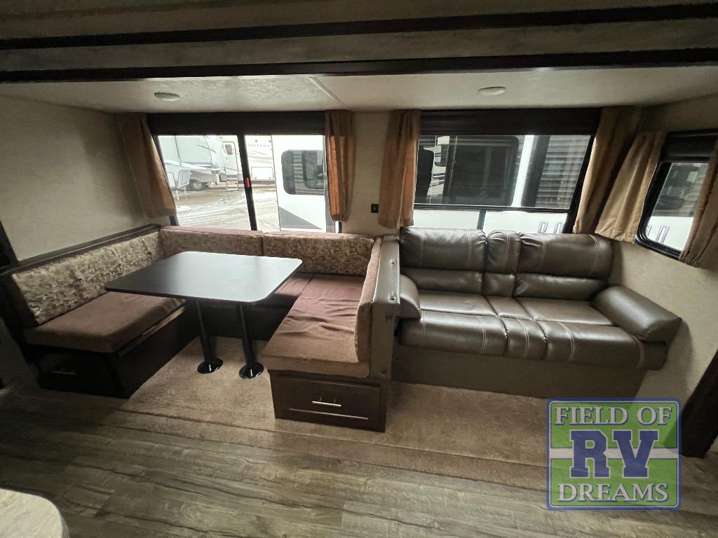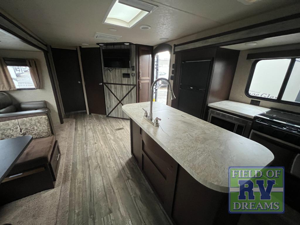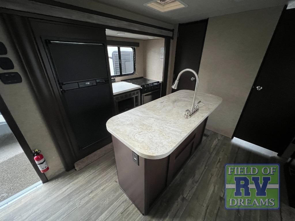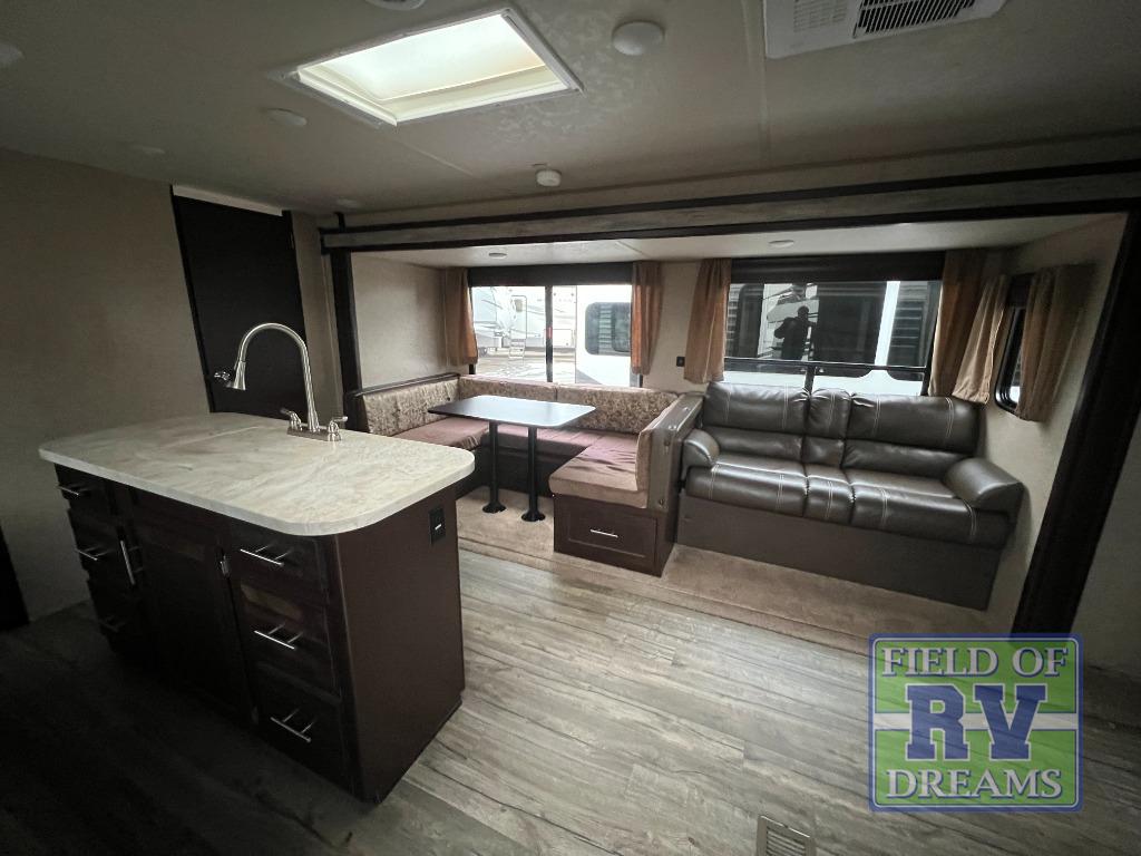 As you enter the travel trailer, to the left there is a slide with a refrigerator, three burner range, and microwave. Next to the slide you will find a large pantry. The opposite side of the trailer has a slide with a sofa and a u-dinette. There are optional 40" storage drawers below the dinette and an optional skylight above. The kitchen island offers a large sink as well as extra counter space. To the right of the entrance you will find a closet and LCD TV on the outer wall of the bath.