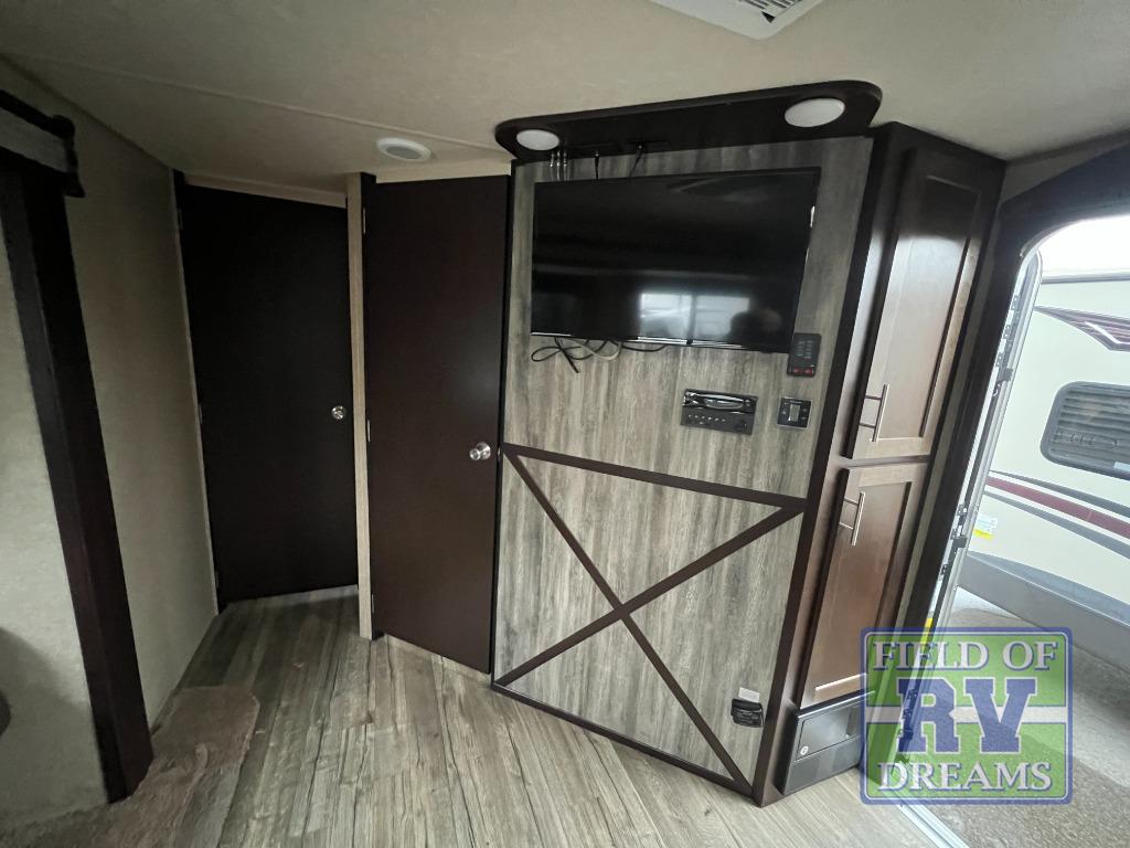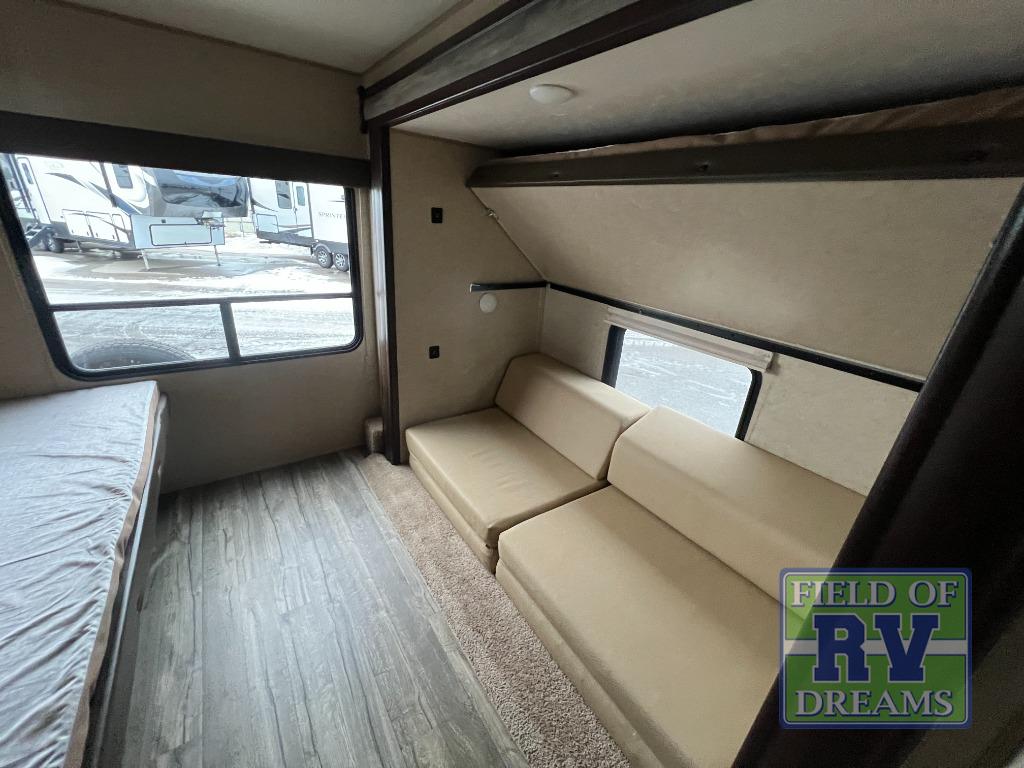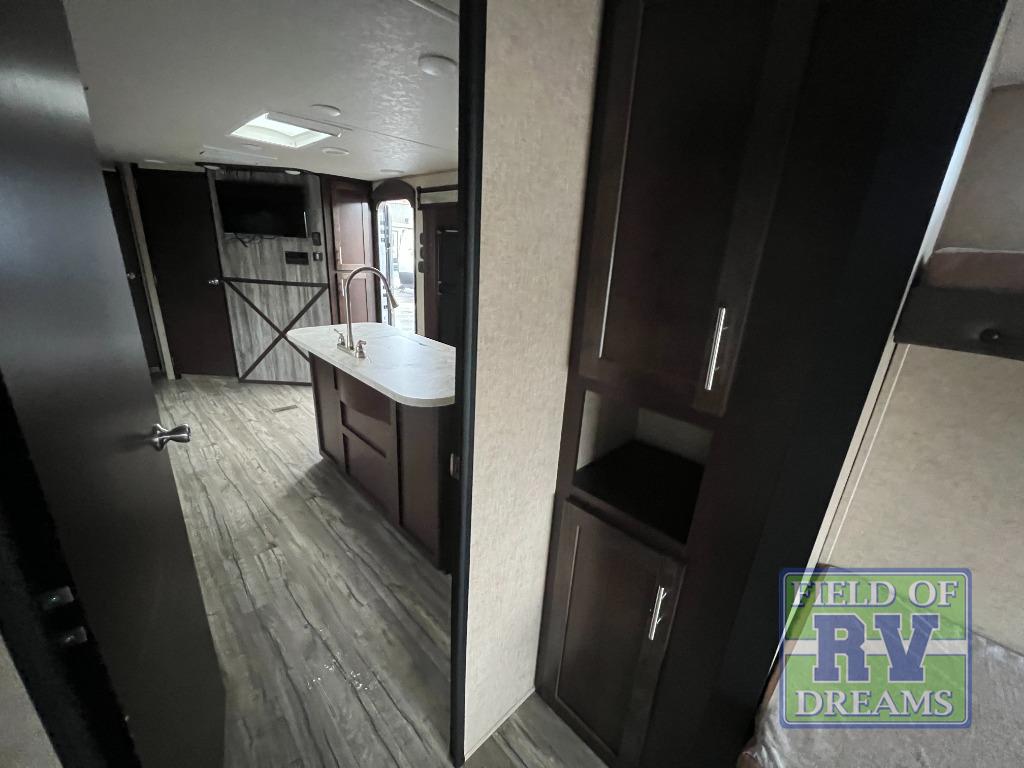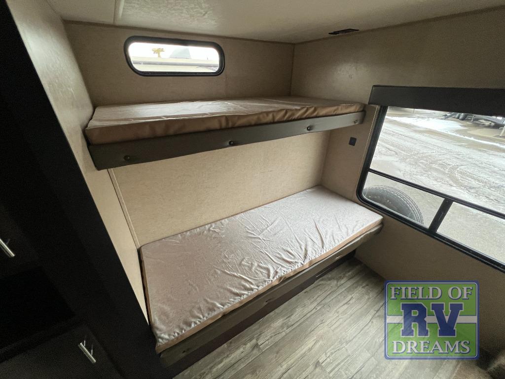 The rear bunk house has a slide out cube sofa on the bottom and a flip-up bunk above. Along the opposite side of the trailer you will find a set of bunks and a wardrobe next to the bunks. Along the rear wall there is also a LCD TV mount.